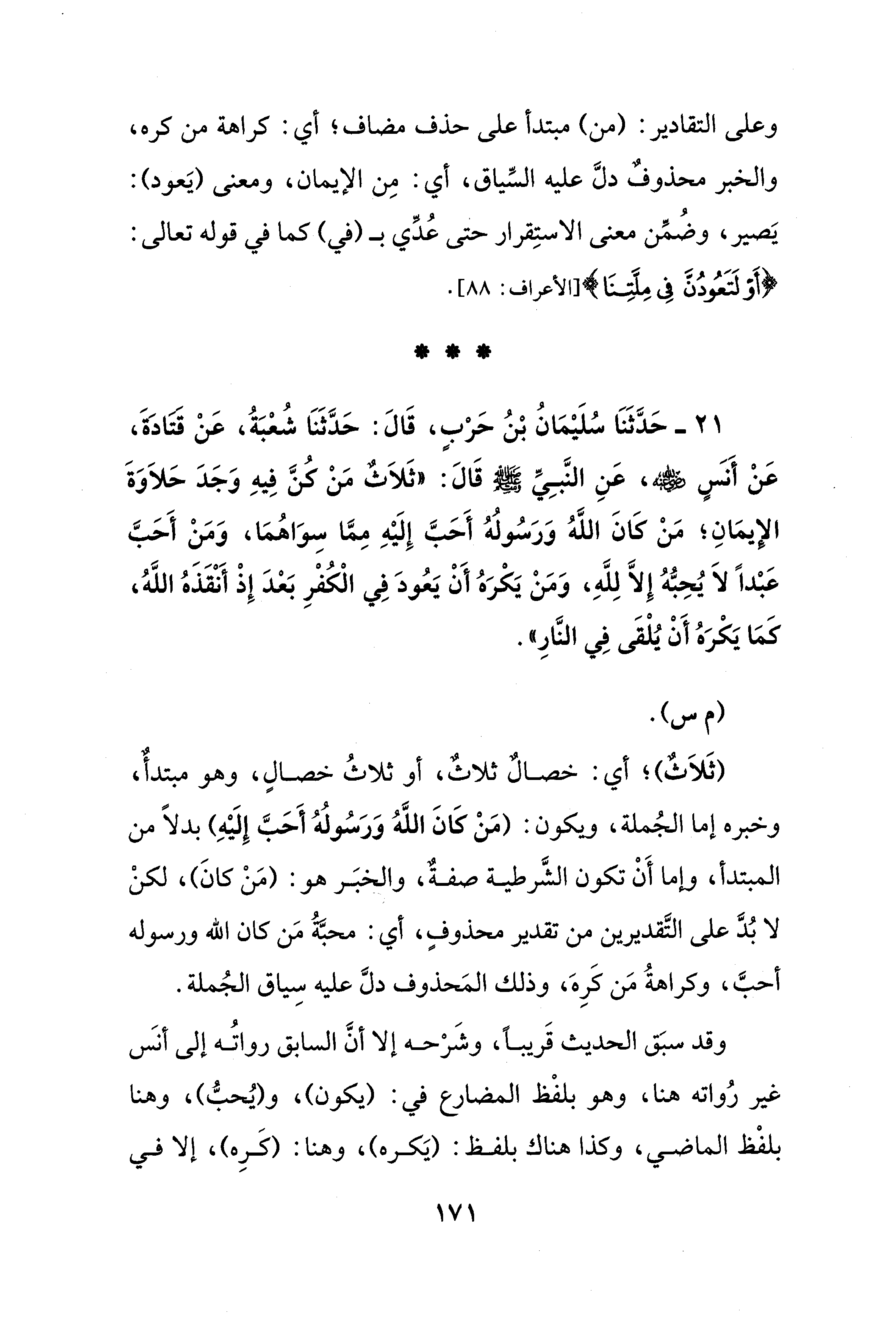 21 - حَدَّثَنَا سُلَيْمَانُ بْنُ حَرْبٍ، قَالَ: حَدَّثَنَا شُعْبَةُ، عَنْ قتادَةَ، عَنْ أَنسٍ رضي الله عنه، عَنِ النَّبِيِّ صلى الله عليه وسلم قَالَ: "ثَلاَثٌ مَنْ كُنَّ فِيهِ وَجَدَ حَلاَوَةَ الإيمَانِ؛ مَنْ كَانَ اللَّهُ وَرَسُولُهُ أَحَبَّ إِلَيْهِ مِمَّا سِوَاهُمَا، وَمَنْ أَحَبَّ عَبْدًا لاَ يُحِبُّهُ إِلَّا لِلَّهِ، وَمَنْ يَكْرَهُ أَنْ يَعُودَ فِي الْكُفْرِ بَعْدَ إِذْ أَنْقَذَهُ اللَّهُ، كَمَا يَكْرَهُ أَنْ يُلْقَى فِي النَّارِ".