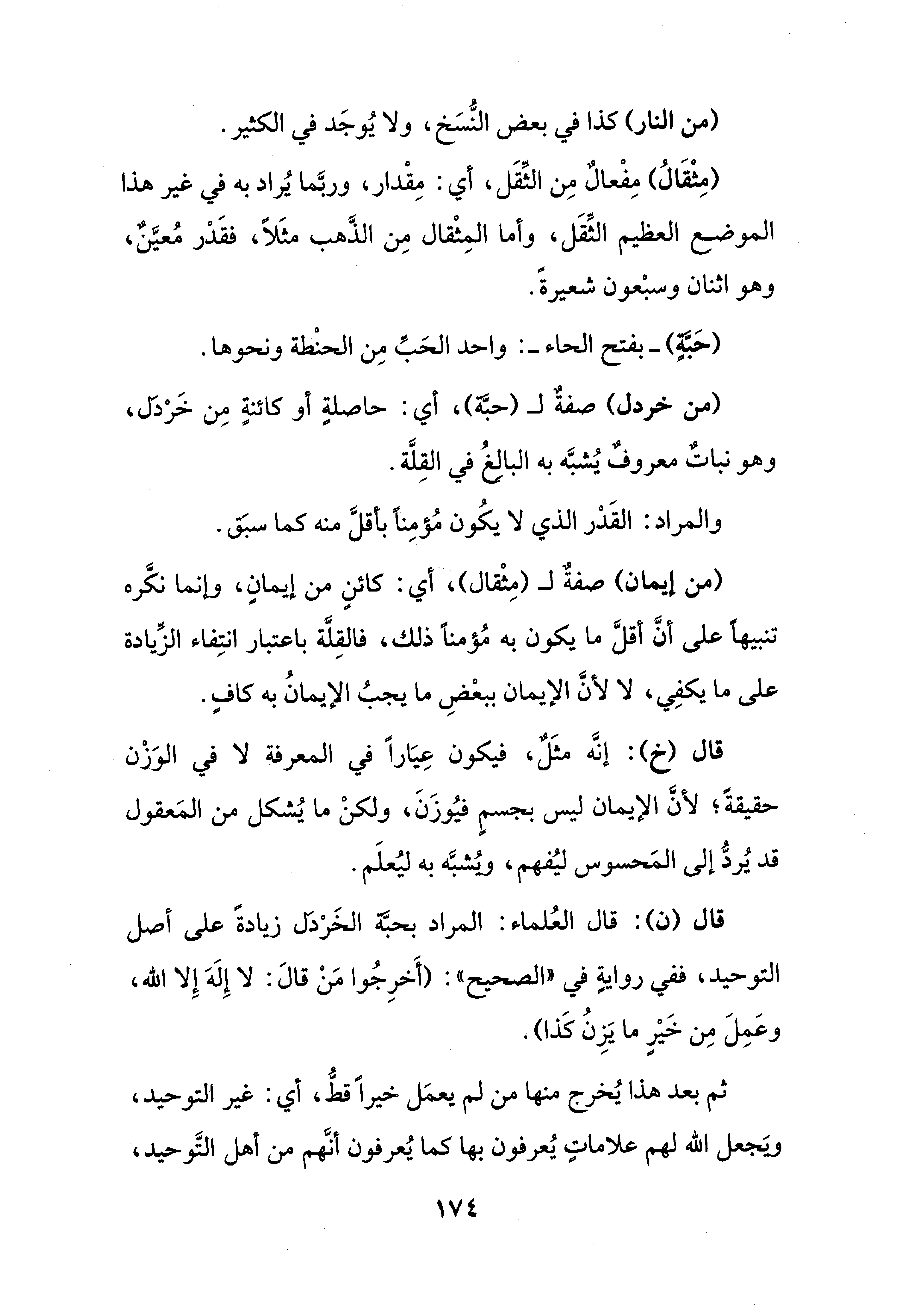 قال (ن): قال العُلماء: المراد بحبَّة الخَرْدَل زيادةً على أصل التوحيد، ففي روايةٍ في "الصحيح": (أَخرِجُوا مَنْ قالَ: لا إِلَهَ إِلا الله، وعَمِلَ مِن خَيْرٍ ما يَزِنُ كَذا).