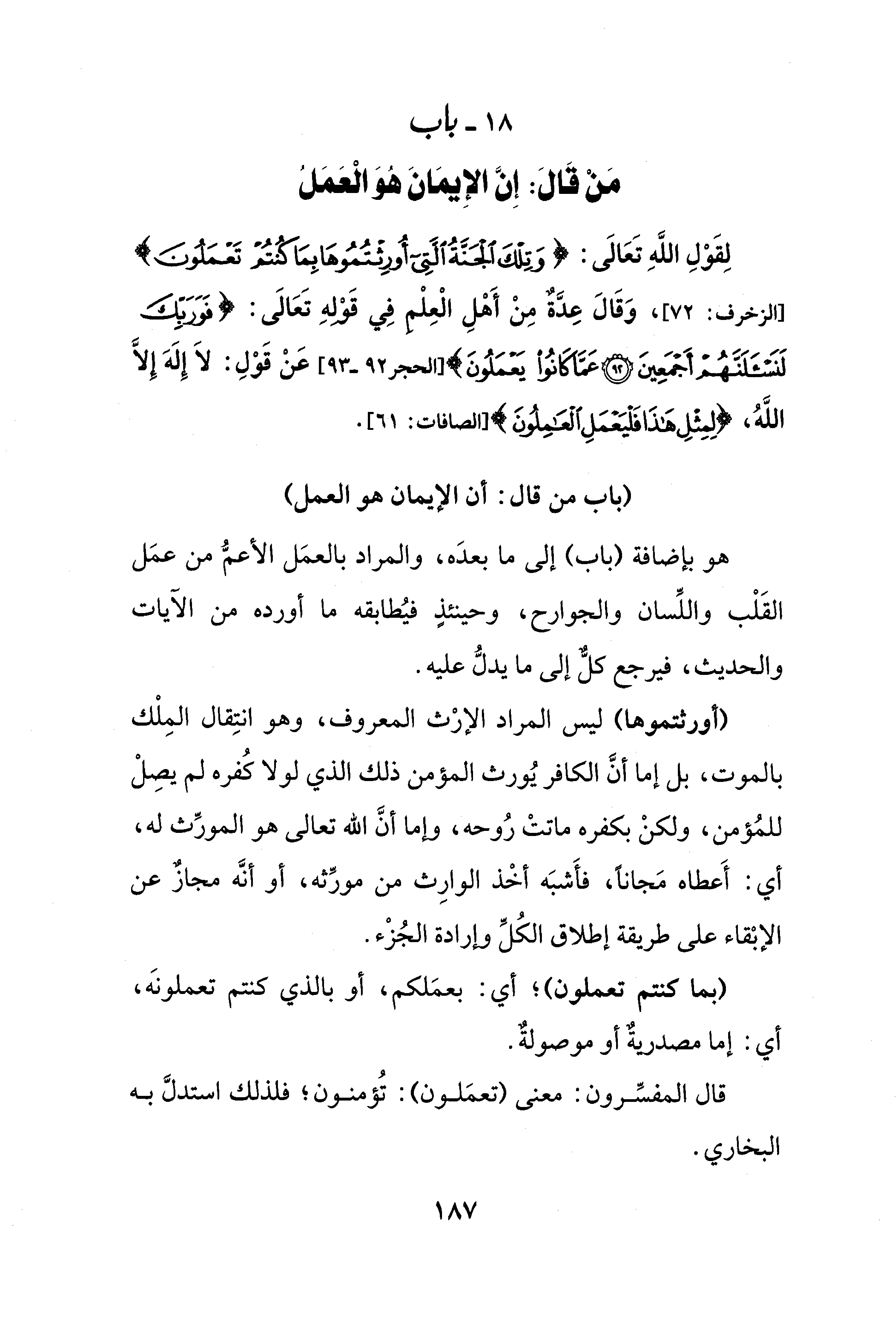 18 - بابٌ مَنْ قَالَ: إِنَّ الإِيمَانَ هُوَ الْعَمَلُ لِقَوْلِ اللَّهِ تَعَالَى: {وَتِلْكَ الْجَنَّةُ الَّتِي أُورِثْتُمُوهَا بِمَا كُنْتُمْ تَعْمَلُونَ} [الزخرف: 72]، وَقَالَ عِدَّةٌ مِنْ أَهْلِ الْعِلْم فِي قَوْلِهِ تَعَالَى: {فَوَرَبِّكَ لَنَسْأَلَنَّهُمْ أَجْمَعِينَ (92) عَمَّا كَانُوا يَعْمَلُونَ} [الحجر: 92، 93]، عَنْ قَوْلِ: لاَ إِلَهَ إِلَّا اللَّهُ، {لِمِثْلِ هَذَا فَلْيَعْمَلِ الْعَامِلُونَ} [الصافات: 61].