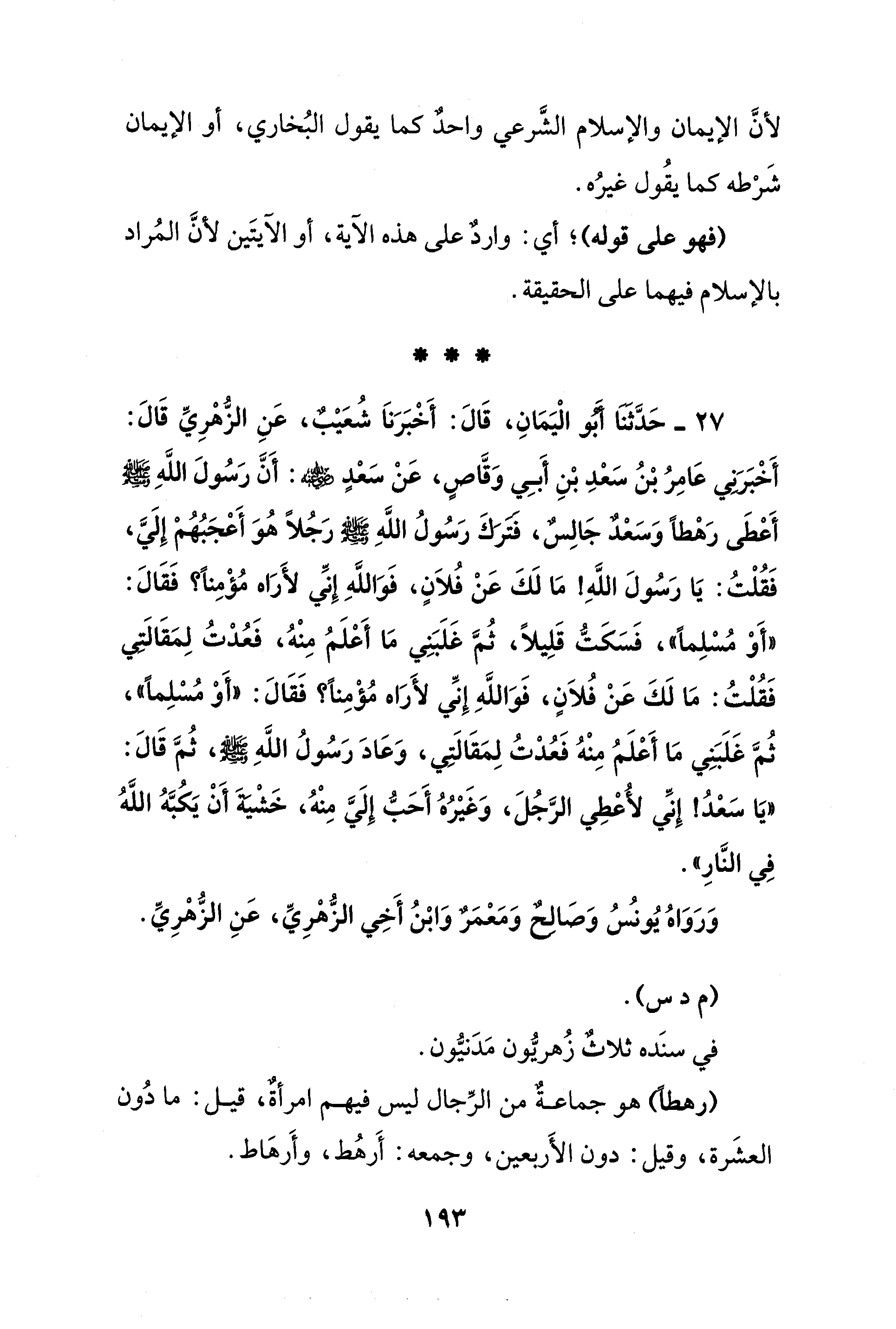 27 - حَدَّثنا أبُو الْيَمَانِ، قَالَ: أَخْبَرَناَ شُعَيْبٌ، عَنِ الزُّهْرِيِّ قَالَ: أَخْبَرَنِي عَامِرُ بْنُ سَعْدِ بْنِ أَبِي وَقَّاصٍ، عَنْ سَعْدٍ - رضي الله عنه -: أَنَّ رَسُولَ اللَّهِ - صلى الله عليه وسلم - أَعْطَى رَهْطًا وَسَعْدٌ جَالِسٌ، فتركَ رَسُولُ اللَّهِ صلى الله عليه وسلم رَجُلًا هُوَ أَعْجَبُهُمْ إِلَيَّ، فَقُلْتُ: يَا رَسُولَ اللَّهِ! مَا لَكَ عَنْ فُلاَنٍ، فَوَاللَّهِ إِنِّي لأَرَاه مُؤْمِنًا؟ فَقَالَ: "أَوْ مُسْلِمًا"، فَسَكَتُّ قَلِيلًا، ثُمَّ غَلَبَنِي مَا أَعْلَمُ مِنْهُ، فَعُدْتُ لِمَقَالَتِي فَقُلْتُ: مَا لَكَ عَنْ فُلاَنٍ، فَوَاللَّهِ إنِّي لأَرَاه مُؤْمِنًا؟ فَقَالَ: "أَوْ مُسْلِمًا"، ثُمَّ غَلَبَنِي مَا أَعْلَمُ مِنْهُ فَعُدْتُ لِمَقَالَتِي، وَعَادَ رَسُولُ اللَّهِ - صلى الله عليه وسلم -، ثُمَّ قَالَ: "يَا سَعْدُ! إِنِّي لأُعْطِي الرَّجُلَ، وَغَيْرُهُ أَحَبُّ إِلَيَّ مِنْهُ، خَشْيةَ أَنْ يَكُبَّهُ اللَّهُ فِي النَّارِ".