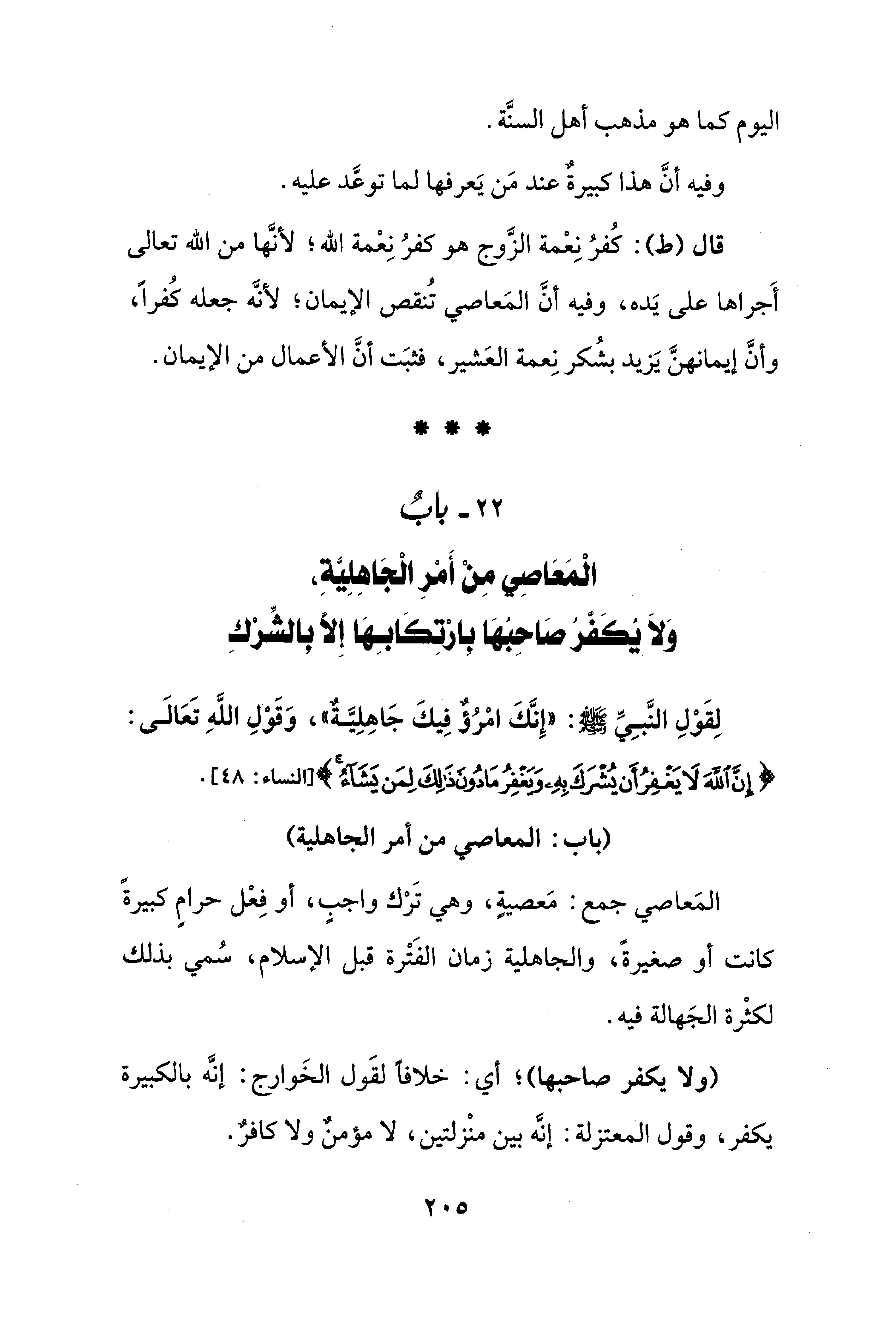 22 - بابٌ الْمَعَاصِي مِنْ أَمْرِ الْجَاهِلِيةِ، وَلاَ يُكَفَّرُ صاحِبُهَا بارْتِكَابِهَا إِلَّا بالشِّرْك لِقَوْلِ النَّبِيِّ صلى الله عليه وسلم: "إنَّكَ امْرُؤٌ فِيكَ جَاهِلِيَّة"، وَقَوْلِ اللَّهِ تَعَالَى: {إِنَّ اللَّهَ لَا يَغْفِرُ أَنْ يُشْرَكَ بِهِ وَيَغْفِرُ مَا دُونَ ذَلِكَ لِمَنْ يَشَاءُ} [النساء: 48].