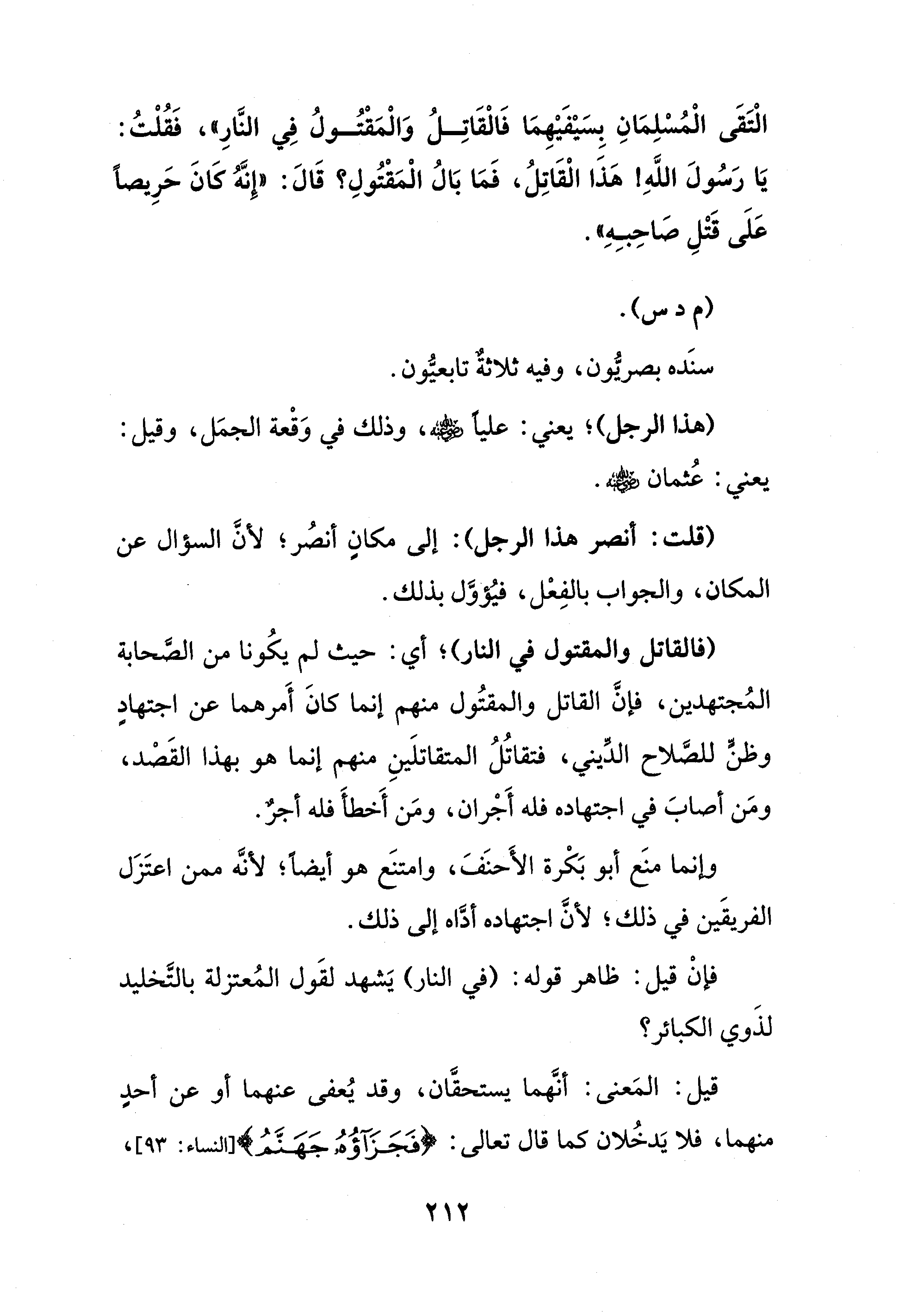 الْتَقَى الْمُسْلِمَانِ بِسَيْفَيْهِمَا فَالْقَاتِلُ وَالْمَقْتُولُ فِي النَّارِ"، فَقُلْتُ: يَا رَسُولَ اللَّهِ! هَذَا الْقَاتِلُ، فَمَا بَالُ الْمَقْتُولِ؟ قَالَ: "إِنَّهُ كَانَ حَرِيصًا عَلَى قَتْلِ صَاحِبِهِ".
