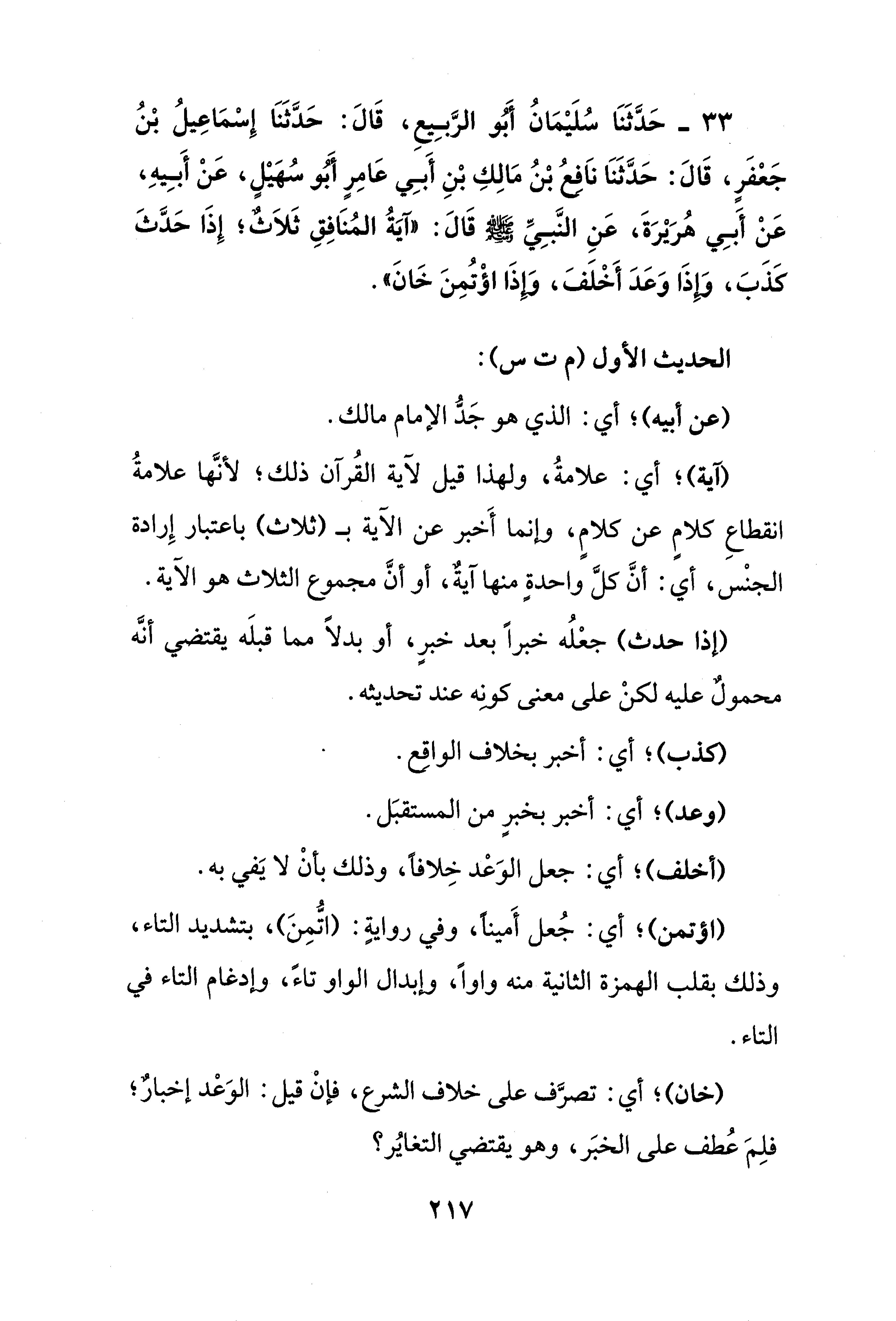 33 - حَدَّثَنَا سُلَيْمَانُ أَبُو الرَّبِيعِ، قَالَ: حَدَّثَنَا إِسمَاعِيلُ بْنُ جَعْفَرٍ، قَالَ: حَدَّثَنَا ناَفِعُ بْنُ مَالِكِ بْنِ أَبِي عَامِرٍ أَبُو سُهَيْلٍ، عَنْ أَبِيهِ، عَنْ أَبِي هُرَيْرَةَ، عَنِ النَّبِيِّ صلى الله عليه وسلم قَالَ: "آيَةُ المُنَافِقِ ثَلاَثٌ؛ إِذَا حَدَّثَ كَذَبَ، وَإِذَا وَعَدَ أَخْلَفَ، وَإِذَا اؤْتُمِنَ خَانَ".