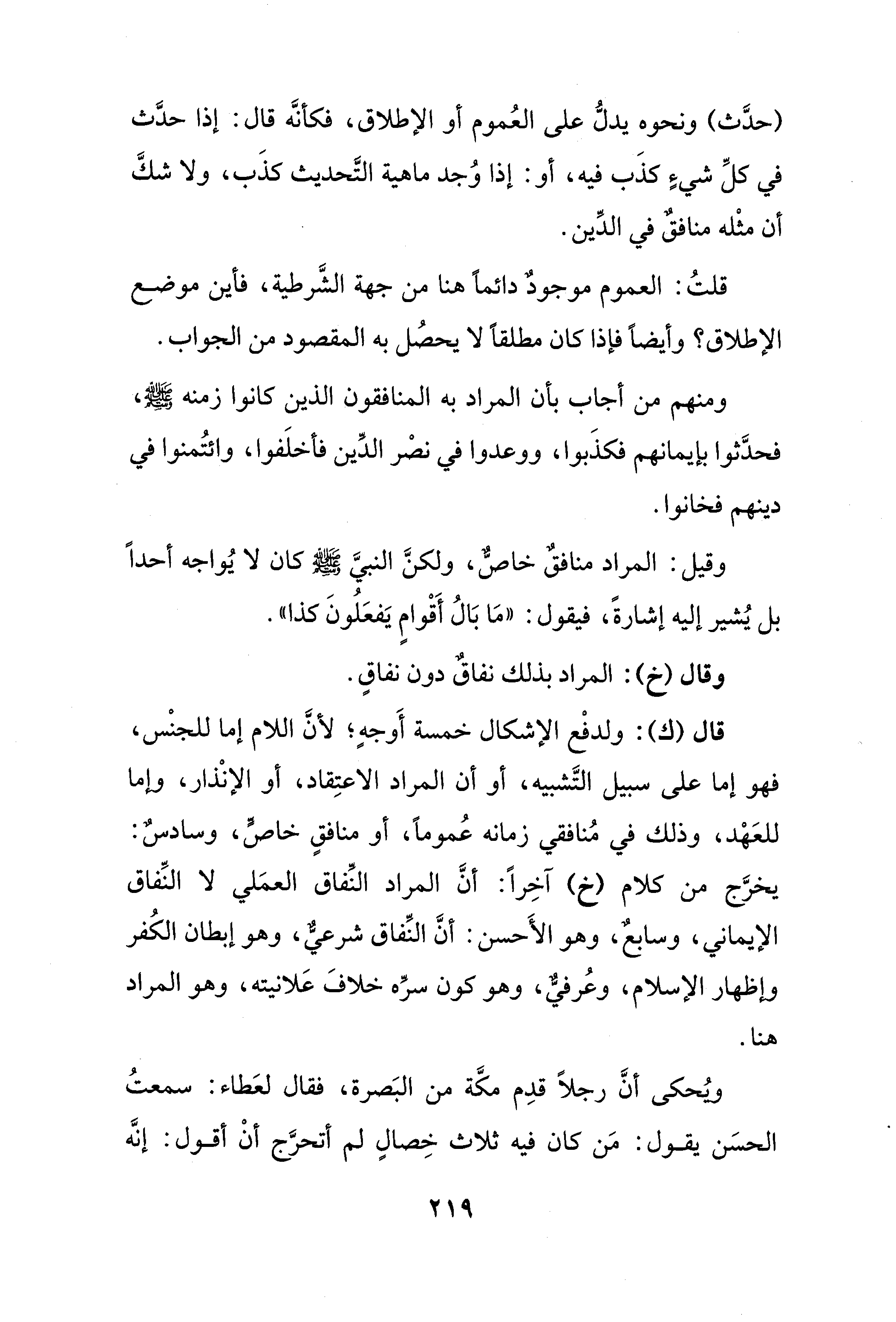 قال (ك): ولدفْع الإشكال خمسة أَوجهٍ؛ لأنَّ اللام إما للجنْس، فهو إما على سبيل التَّشبيه، أو أن المراد الاعتِقاد، أو الإنْذار، وإما للعَهْد، وذلك في مُنافقي زمانه عُمومًا، أو منافقٍ خاصٍّ، وسادسٌ: يخرَّج من كلام (خ) آخِرًا: أنَّ المراد النِّفاق العمَلي لا النِّفاق الإيماني، وسابعٌ، وهو الأَحسن: أنَّ النِّفاق شرعيٌّ، وهو إبطان الكُفر وإظهار الإسلام، وعُرفيٌّ، وهو كون سرِّه خلافَ عَلانيته، وهو المراد هنا.