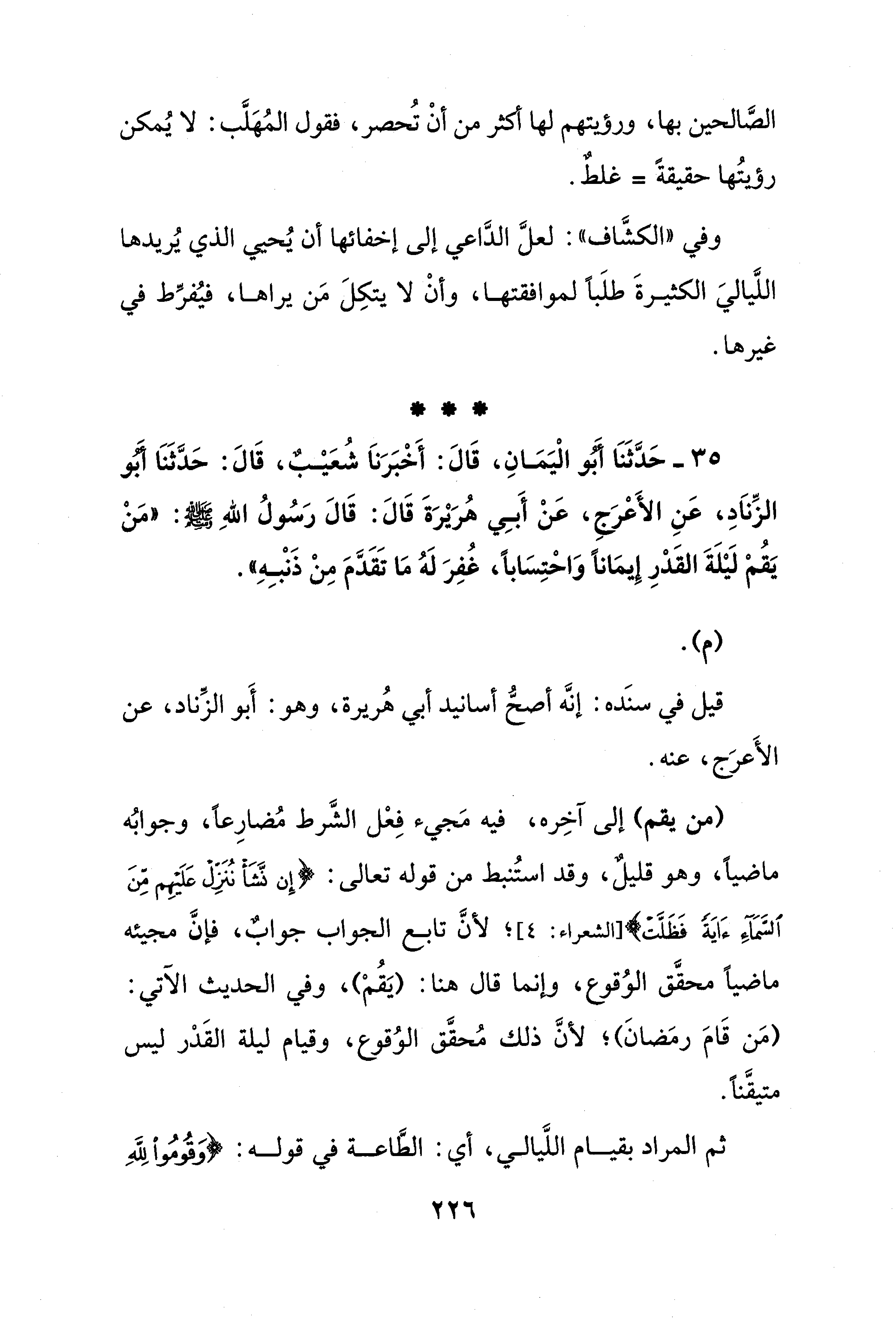 35 - حَدَّثَنَا أَبُو الْيَمَانِ، قَالَ: أَخْبَرَناَ شُعَيْبٌ، قَالَ: حَدَّثَنَا أَبُو الزِّنَادِ، عَنِ الأَعْرَجِ، عَنْ أَبِي هُرَيْرَةَ قَالَ: قَالَ رَسُولُ اللهِ صلى الله عليه وسلم: "مَنْ يَقُمْ لَيْلَةَ القَدْرِ إِيمَانًا وَاحْتِسَابًا، غُفِرَ لَهُ مَا تَقَدَّمَ مِنْ ذَنْبِهِ".