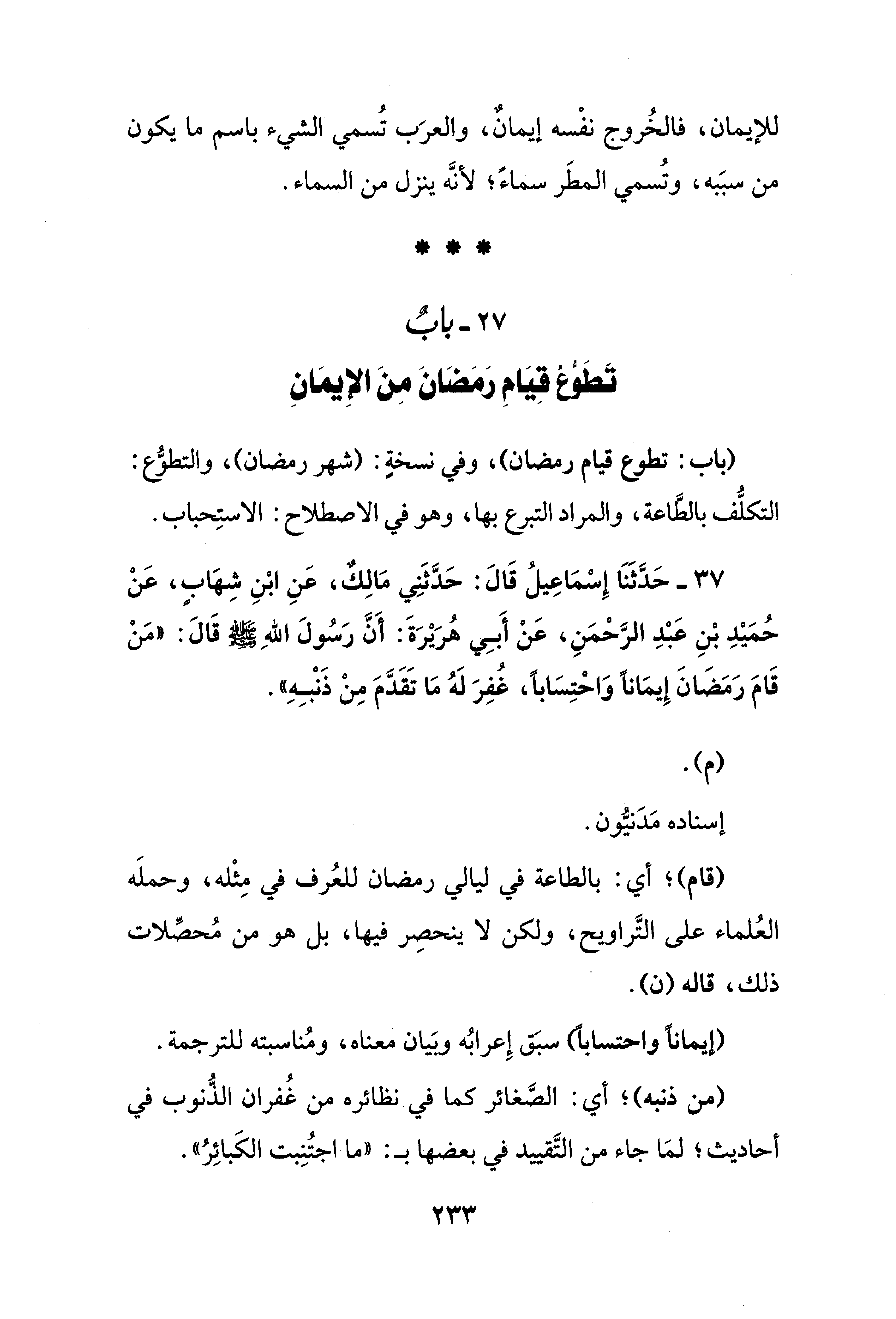27 - بابٌ تَطَوُّعُ قِيَامِ رَمَضَانَ مِنَ الإِيمَانِ