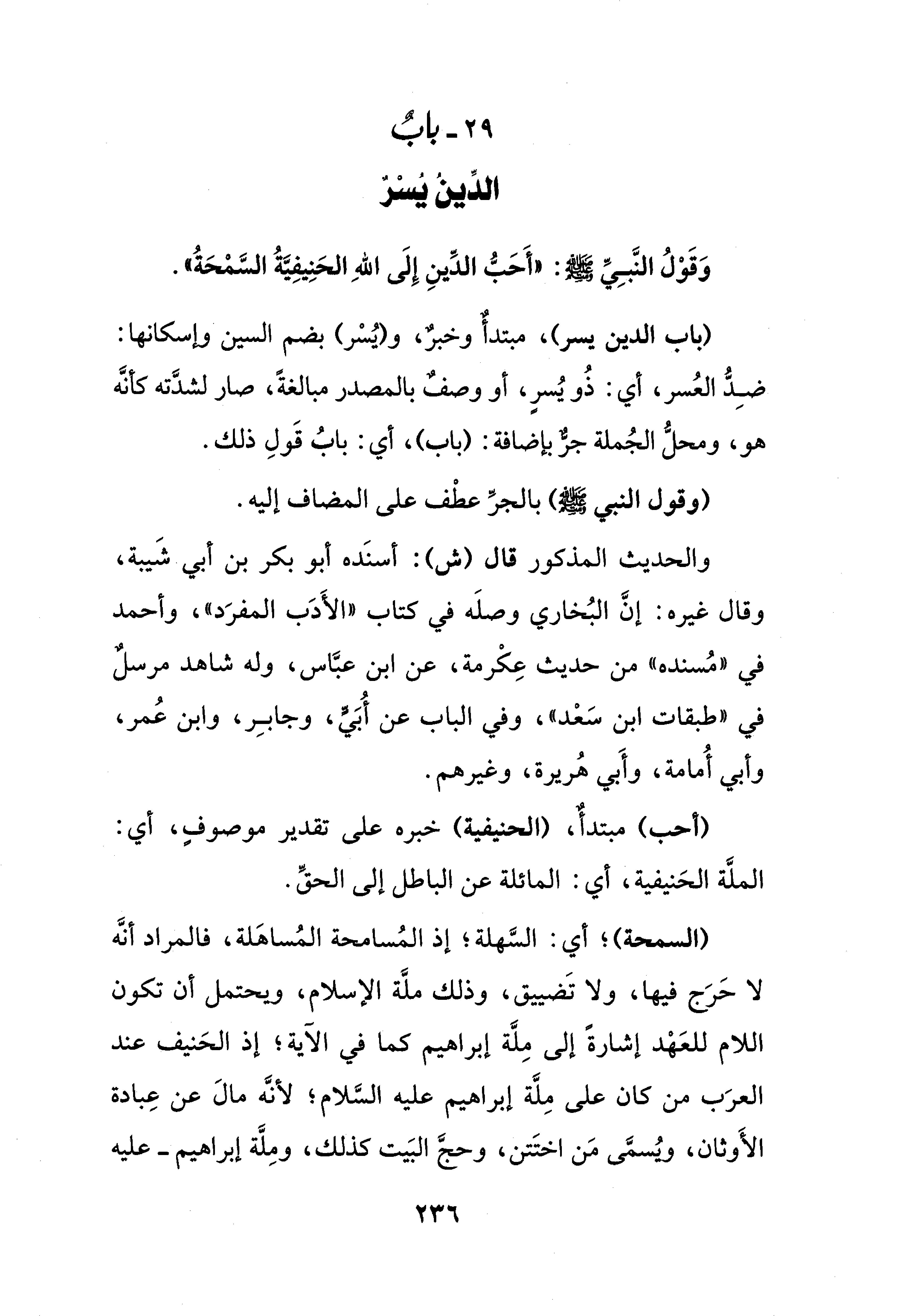 29 - بابٌ الدِّينُ يُسْرٌ وَقَوْلُ النَّبِيِّ صلى الله عليه وسلم: "أَحَبُّ الدِّينِ إِلَى اللهِ الحَنِيفِيَّةُ السَّمْحَةُ".