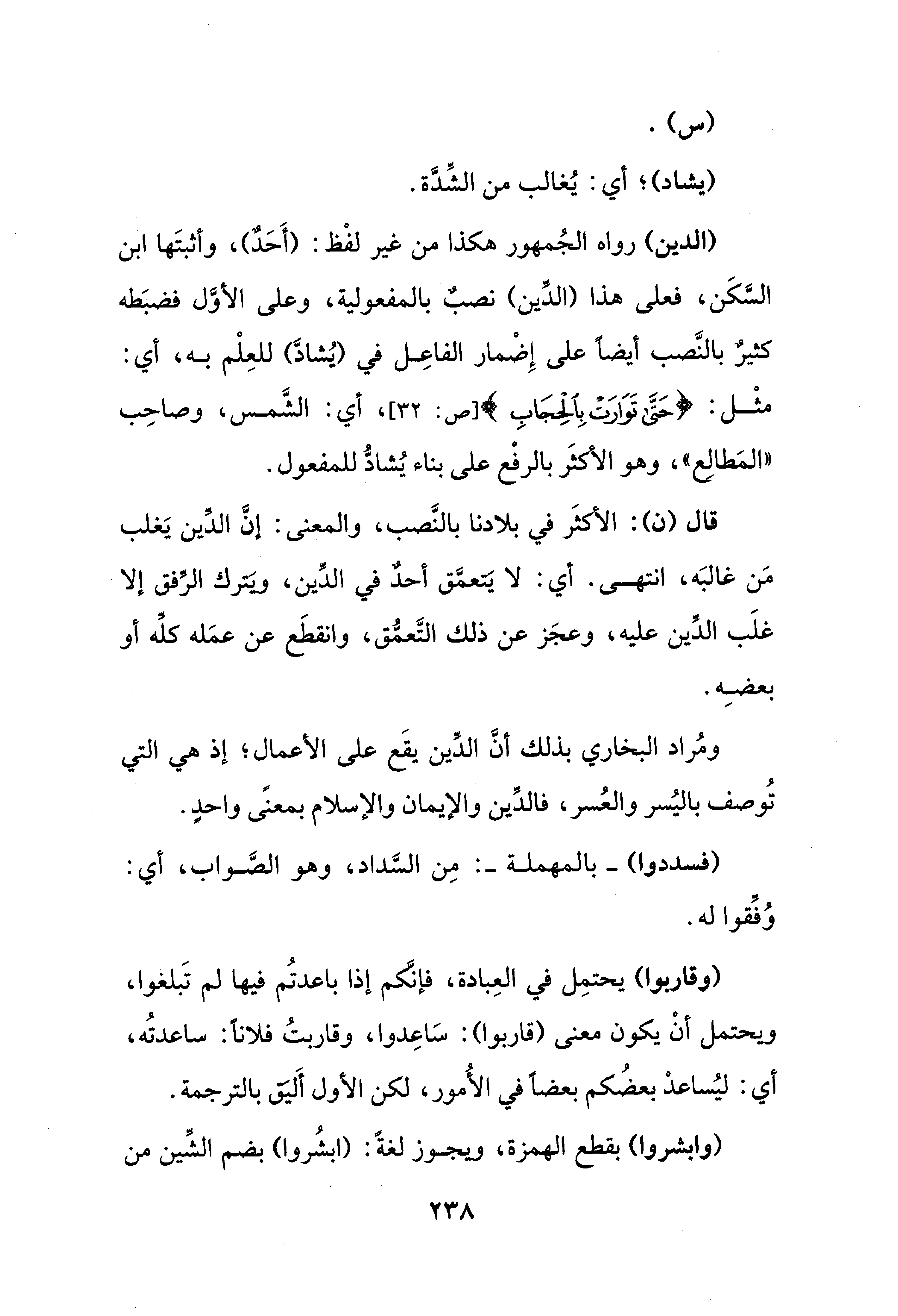 (الدين) رواه الجُمهور هكذا من غير لفْظ: (أَحَدٌ)، وأثبتَها ابن السَّكَن، فعلى هذا (الدِّين) نصبٌ بالمفعولية، وعلى الأوَّل فضبَطه كثيرٌ بالنَّصب أيضًا على إِضْمار الفاعِل في (يُشادَّ) للعِلْم به، أي: مثْل: {حَتَّى تَوَارَت بِاَلحجَابِ} [ص: 32]، أي: الشَّمس، وصاحِب "المَطالِع"، وهو الأكثَر بالرفْع علي بناء يُشادُّ للمفعول.