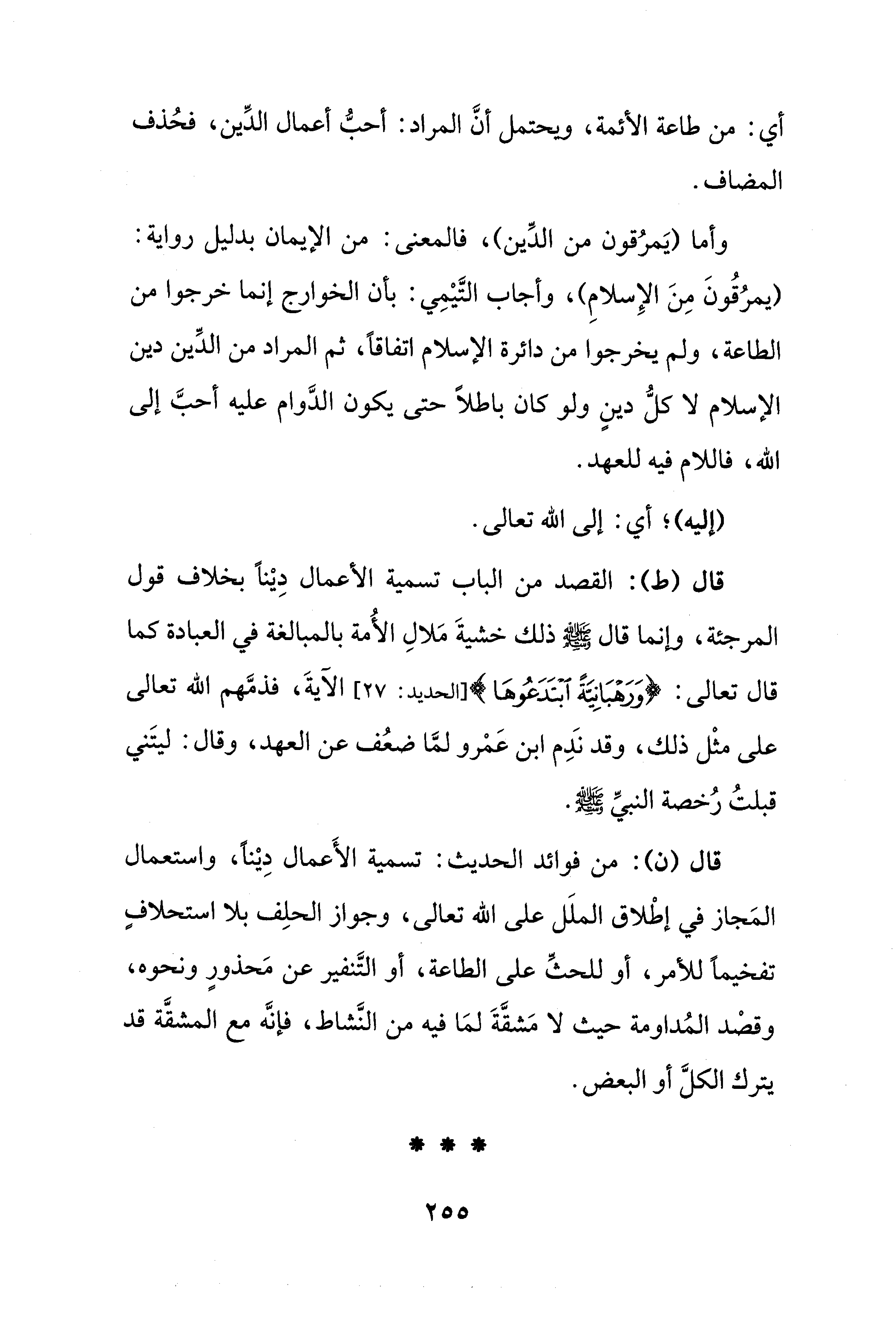 وأما (يَمرُقون من الدِّين)، فالمعنى: من الإيمان بدليل رواية: (يمرُقُونَ مِنَ الإِسلامِ)، وأجاب التَّيْمِي: بأن الخوارج إنما خرجوا من الطاعة، ولم يخرجوا من دائرة الإسلام اتفاقًا، ثم المراد من الدِّين دين الإسلام لا كلُّ دينٍ ولو كان باطلًا حتى يكون الدَّوام عليه أحبَّ إلى الله، فاللام فيه للعهد.