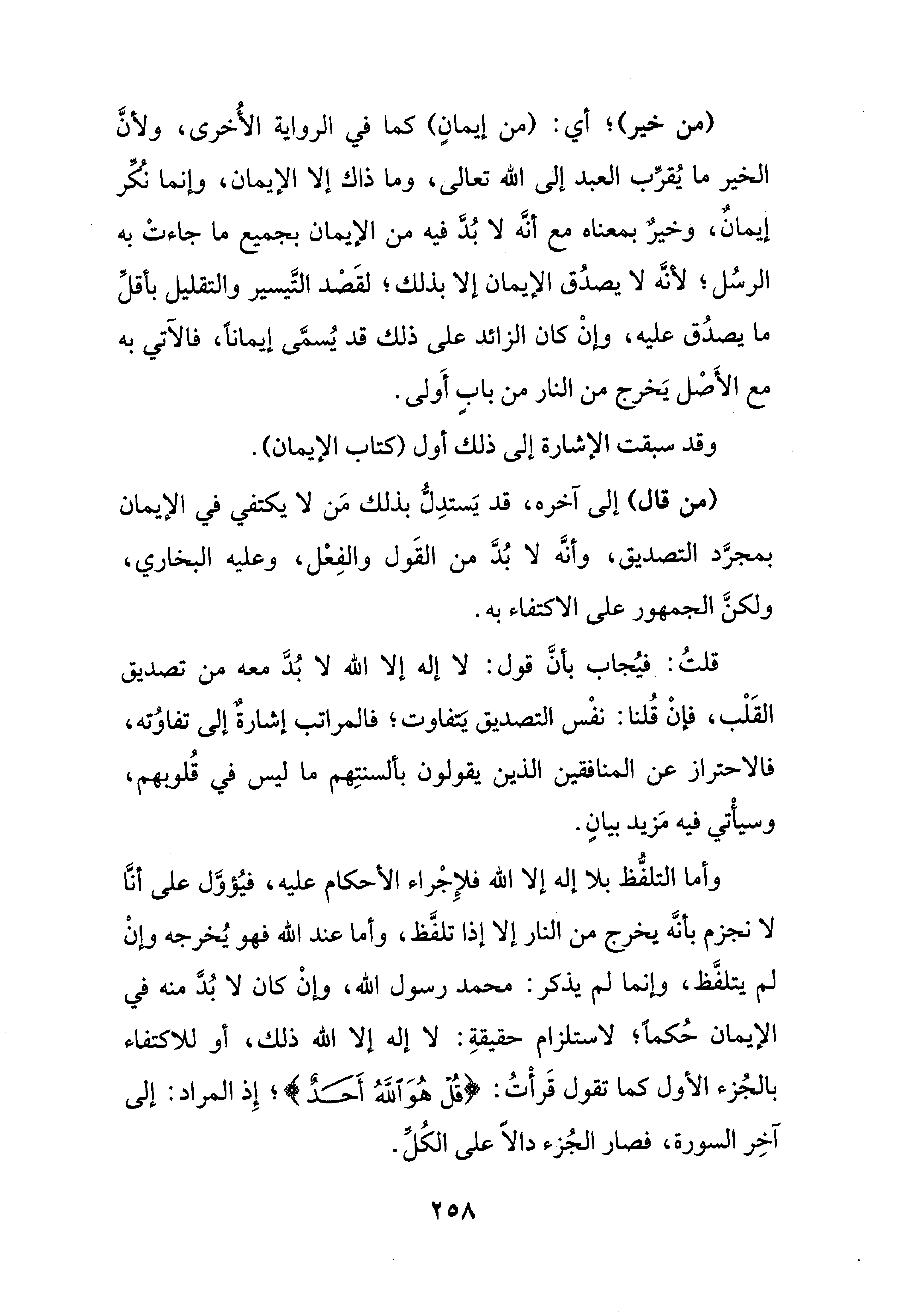 وأما التلفُّظ بلا إله إلا الله فلإِجْراء الأحكام عليه، فيُؤوَّل على أنَّا لا نجزم بأنَّه يخرج من النار إلا إذا تلفَّظ، وأما عند الله فهو يُخرجه وإنْ لم يتلفَّظ، وإنما لم يذكر: محمد رسول الله، وإنْ كان لا بُدَّ منه في الإيمان حُكمًا؛ لاستلزام حقيقةِ: لا إله إلا الله ذلك، أو للاكتفاء بالجُزء الأول كما تقول قَرأْتُ: {قُلْ هُوَ اللهُ أَحَدٌ}؛ إِذ المراد: إلى آخِر السورة، فصار الجُزء دالًّا على الكُلِّ.