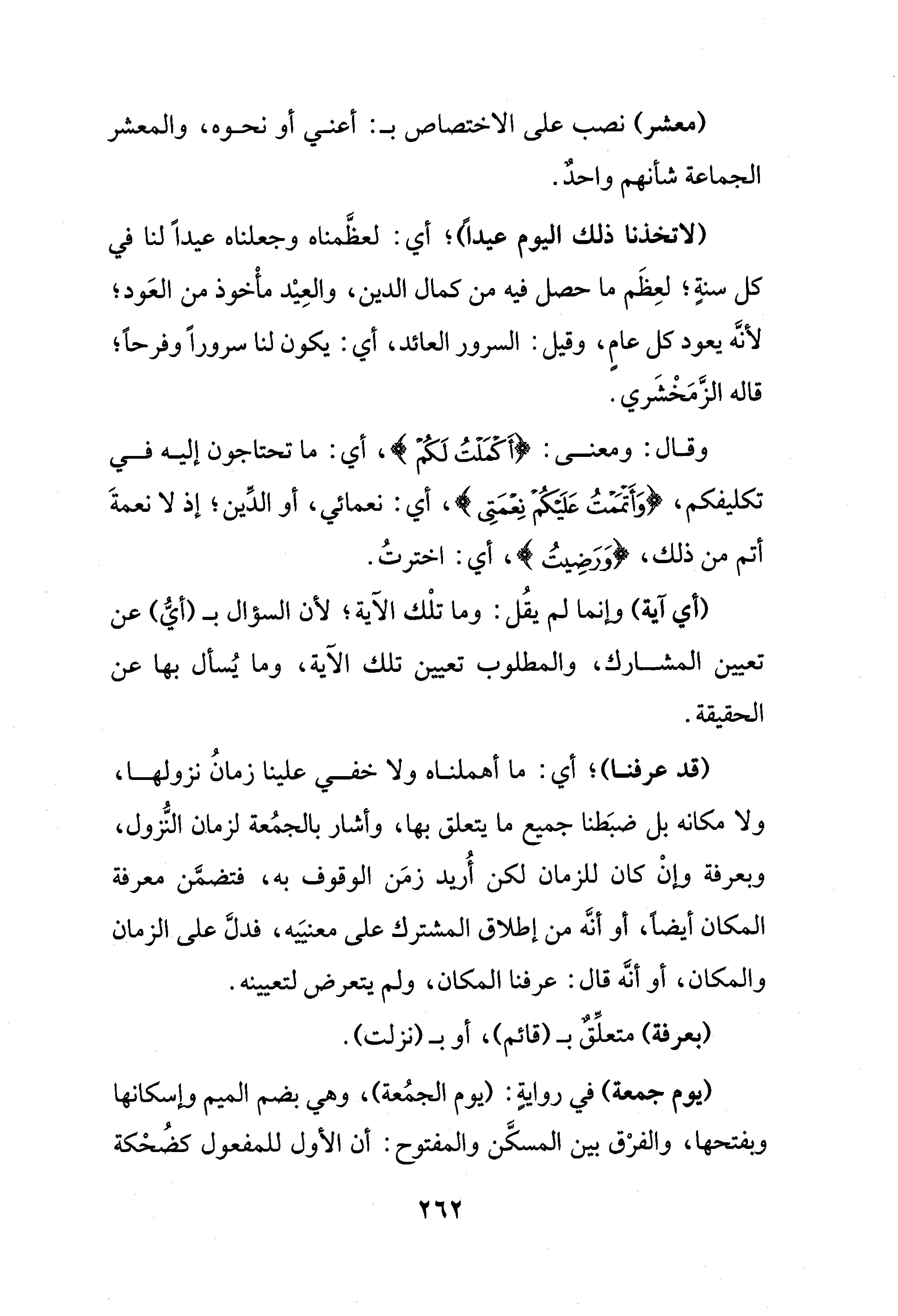 (لاتخذنا ذلك اليوم عيدًا)؛ أي: لعظَّمناه وجعلناه عيدًا لنا في كل سنةٍ؛ لعِظَم ما حصل فيه من كمال الدين، والعِيْد مأْخوذ من العَود؛ لأنَّه يعود كل عامٍ، وقيل: السرور العائد، أي: يكون لنا سرورًا وفرحًا؛ قاله الزَّمَخْشَري.