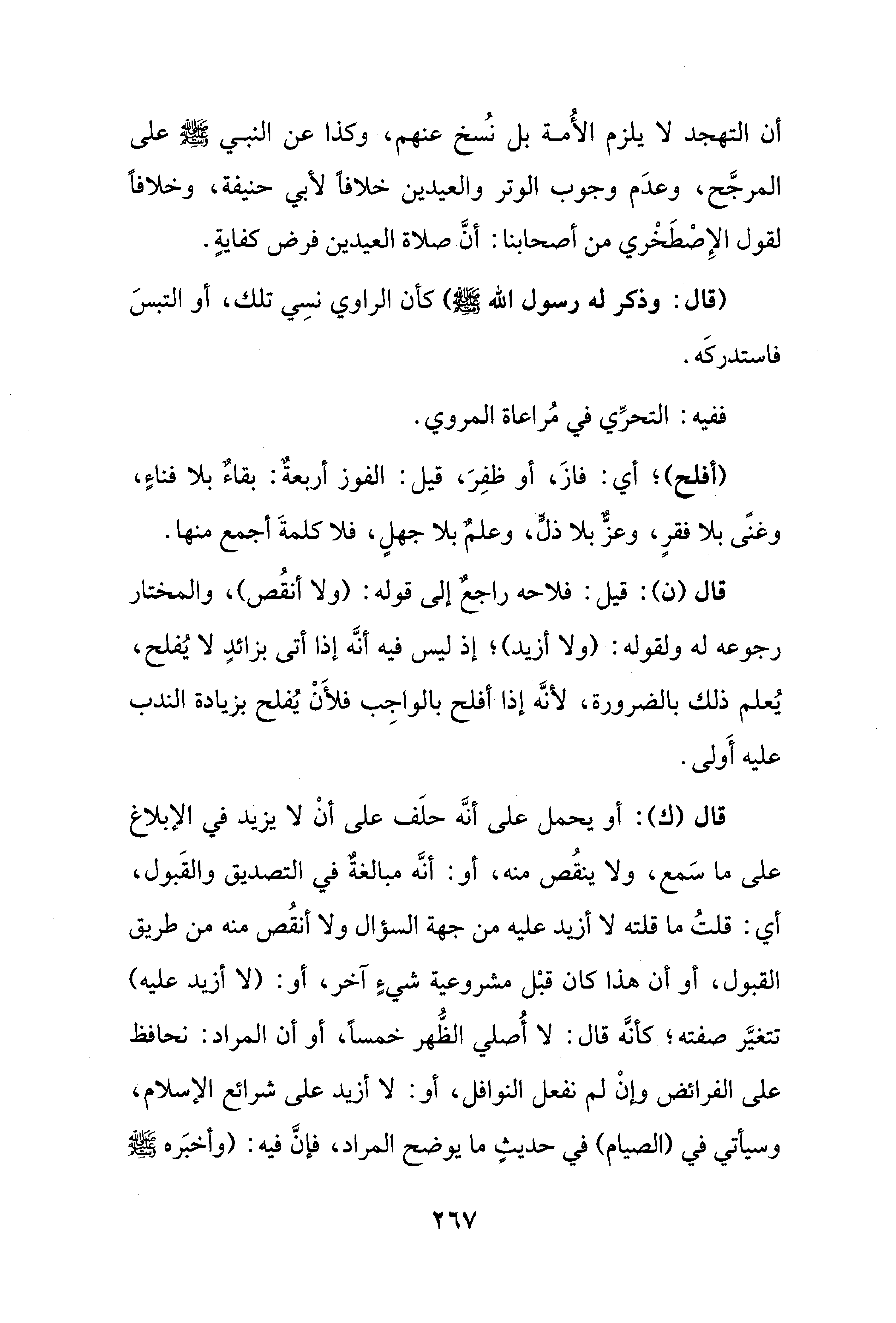 قال (ن): قيل: فلاحه راجعٌ إلى قوله: (ولا أنقُص)، والمختار رجوعه له ولقوله: (ولا أزيد)؛ إذ ليس فيه أنَّه إذا أتى بزائدٍ لا يُفلح، يُعلم ذلك بالضرورة، لأنَّه إذا أفلح بالواجِب فلأَنْ يُفلح بزيادة الندب عليه أَولى.