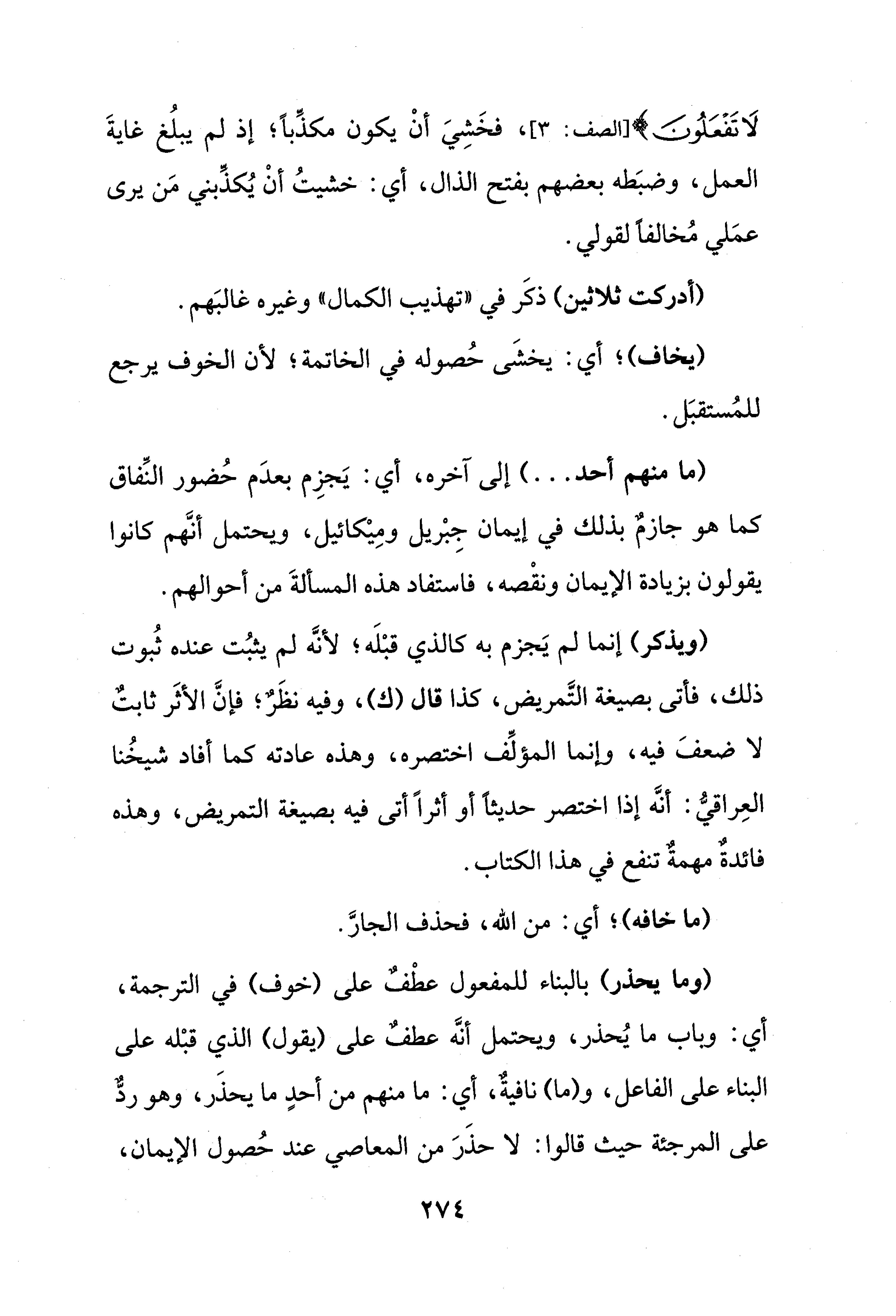لَا تَفْعَلُونَ} [الصف: 3]، فخَشِيَ أنْ يكون مكذِّبًا؛ إذ لم يبلُغ غايةَ العمل، وضبَطه بعضهم بفتح الذال، أي: خشيتُ أنْ يُكذِّبني مَن يرى عمَلي مُخالفًا لقولي.