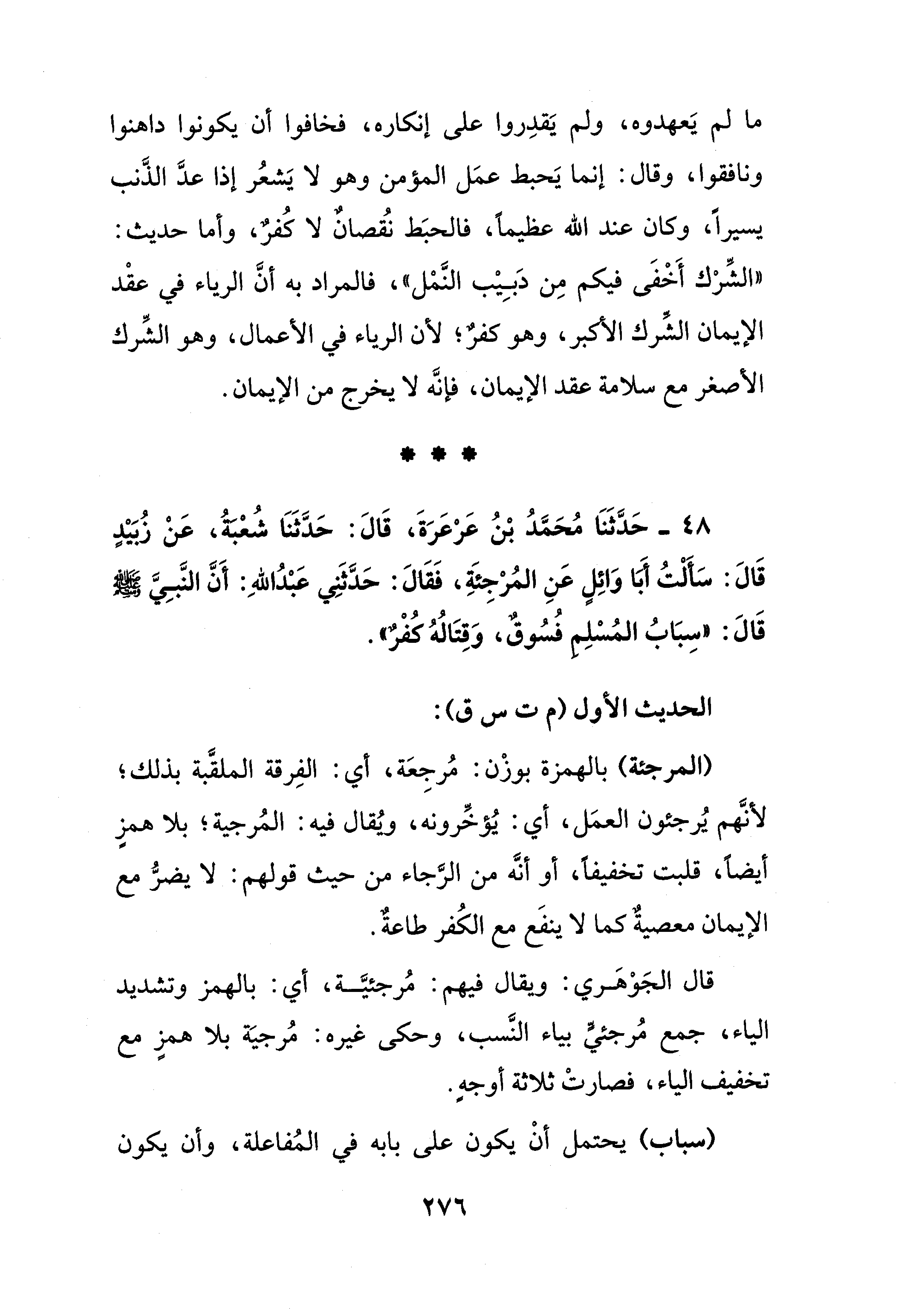 48 - حَدَّثَنَا مُحَمَّدُ بْنُ عَرْعَرَةَ، قَالَ: حَدَّثَنَا شُعْبةُ، عَنْ زُبَيْدٍ قَالَ: سَاَلْتُ أَبَا وَائِلٍ عَنِ المُرْجِئَةِ، فَقَالَ: حَدَّثَنِي عَبْدُ اللهِ: أَنَّ النَّبِيَّ صلى الله عليه وسلم قَالَ: "سِبَابُ المُسْلِمِ فُسُوقٌ، وَقِتَالُهُ كفْرٌ".