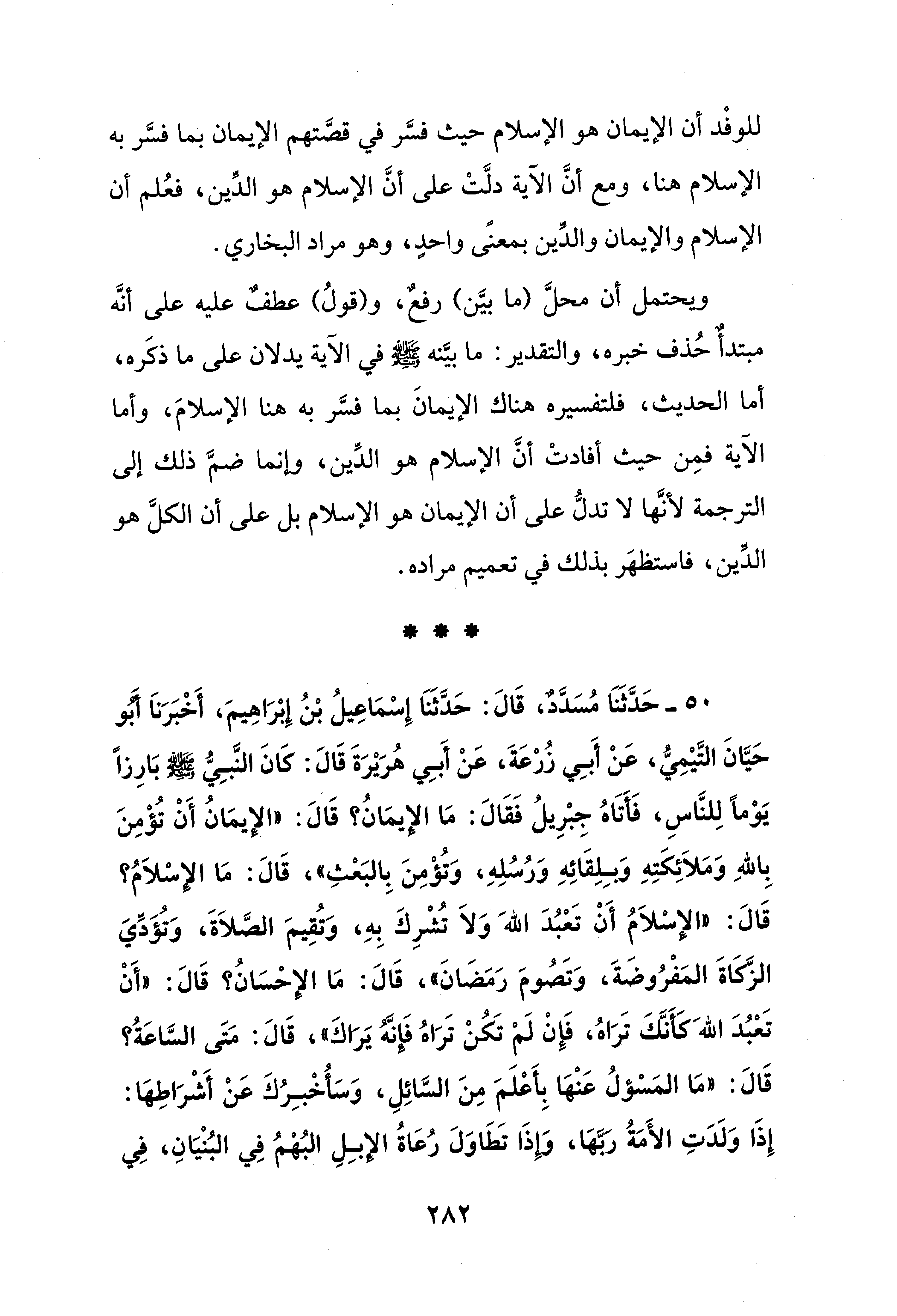 ويحتمل أن محلَّ (ما بيَّن) رفعٌ، و (قولُ) عطفٌ عليه على أنَّه مبتدأٌ حُذف خبره، والتقدير: ما بيَّنه - صلى الله عليه وسلم - في الآية يدلان على ما ذكَره، أما الحديث، فلتفسيره هناك الإيمانَ بما فسَّر به هنا الإسلامَ، وأما الآية فمِن حيث أفادتْ أنَّ الإسلام هو الدِّين، وإنما ضمَّ ذلك إلى الترجمة لأنَّها لا تدلُّ على أن الإيمان هو الإسلام بل على أن الكلَّ هو الدِّين، فاستظهَر بذلك في تعميم مراده.