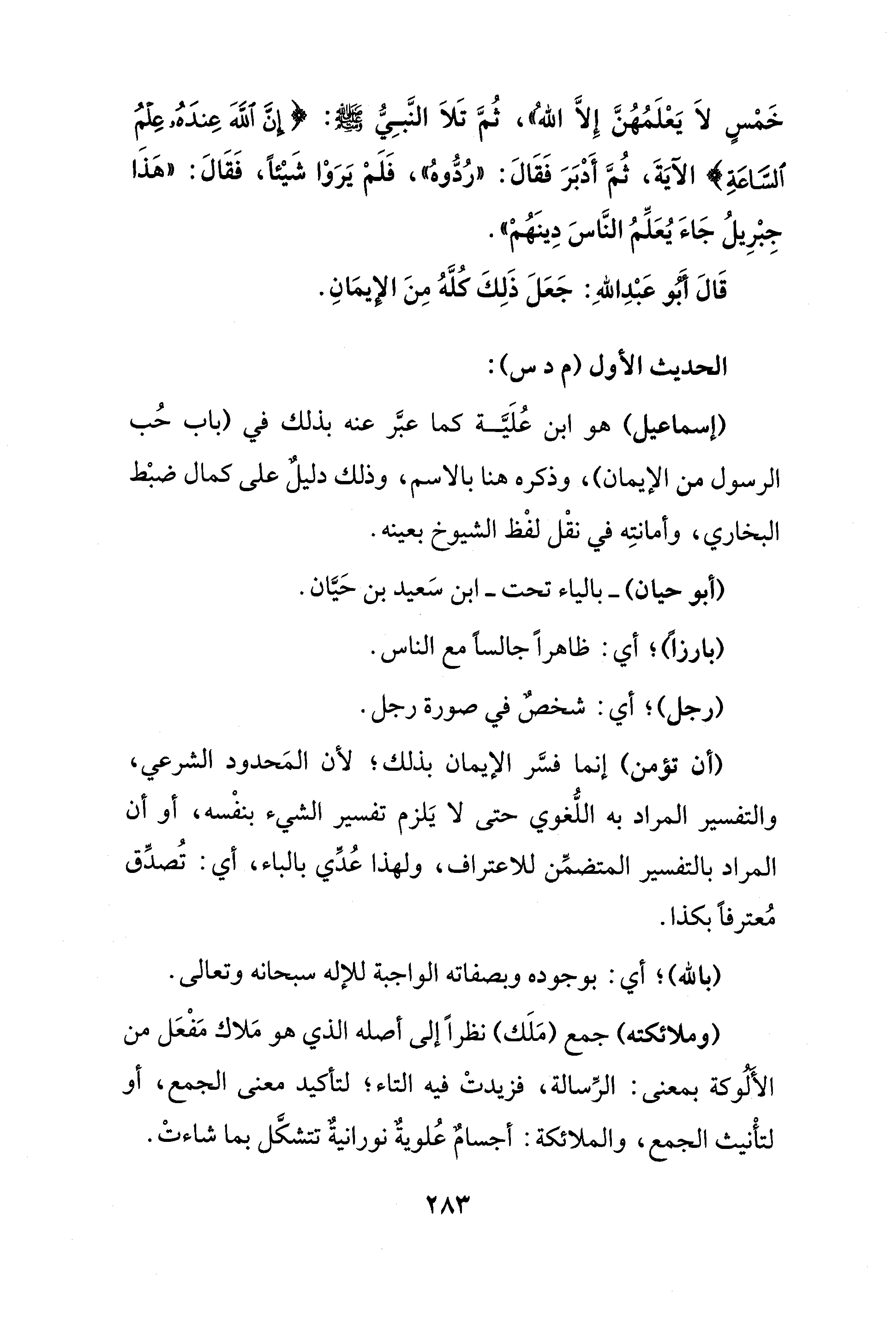 خَمْسٍ لاَ يَعْلَمُهُنَّ إِلَّا الله"، ثُمَّ تَلاَ النَّبِيُّ صلى الله عليه وسلم: {إِنَّ اللَّهَ عِنْدَهُ عِلْمُ السَّاعَةِ} [لقمان: 34] الآيَةَ، ثُمَّ أَدْبَرَ فَقَالَ: "رُدُّوهُ"، فَلَمْ يَرَوْا شَيْئًا، فَقَالَ: "هَذَا جِبْرِيلُ جَاءَ يُعَلِّمُ النَّاسَ دِينَهُمْ".