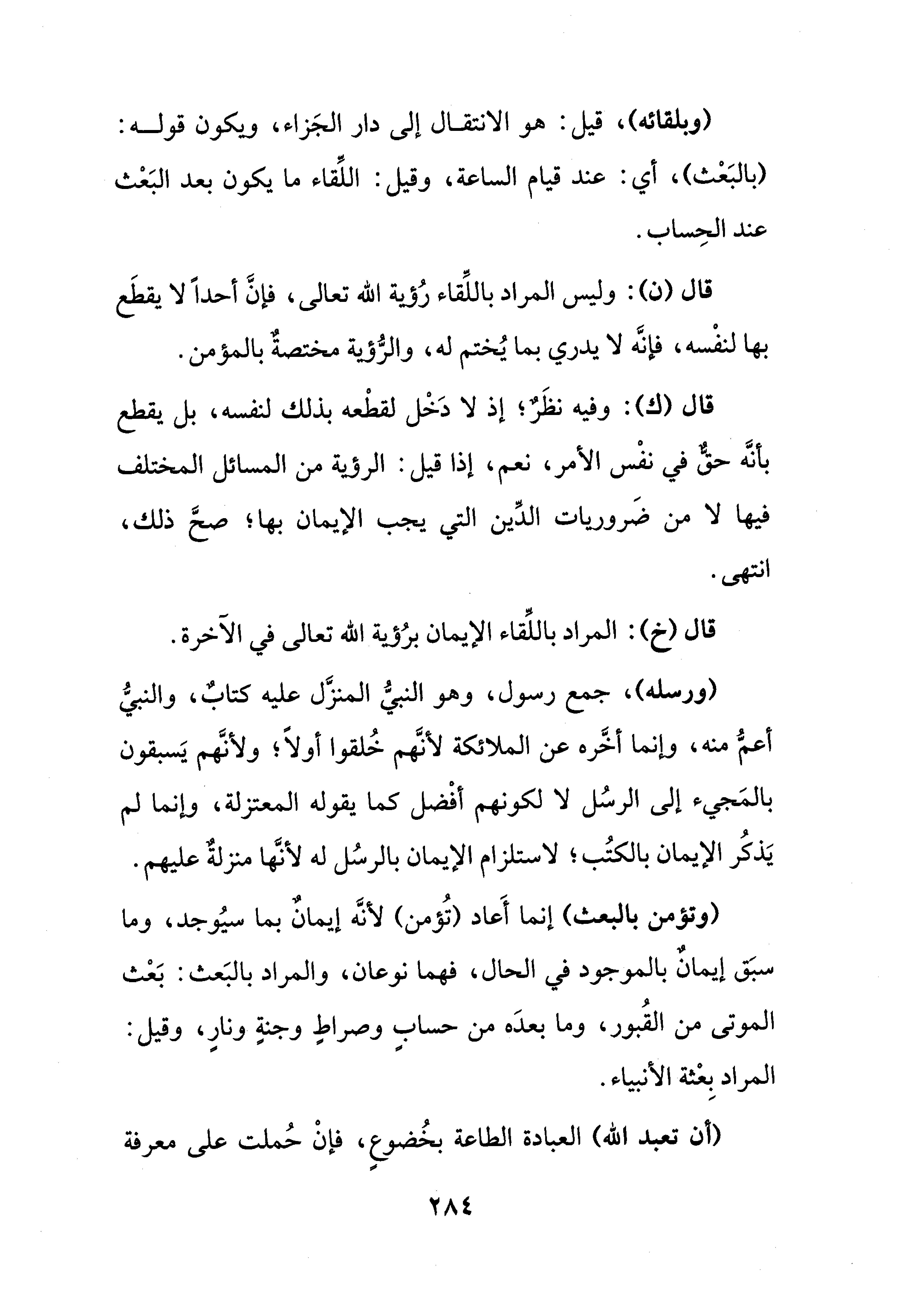 (ورسله)، جمع رسول، وهو النبيُّ المنزَّل عليه كتابٌ، والنبيُّ أعمُّ منه، وإنما أخَّره عن الملائكة لأنَّهم خُلقوا أولًا؛ ولأنَّهم يَسبقون بالمَجيء إلى الرسُل لا لكونهم أفْضل كما يقوله المعتزلة، وإنما لم يَذكُر الإيمان بالكتُب؛ لاستلزام الإيمان بالرسُل له لأنَّها منزلةٌ عليهم.