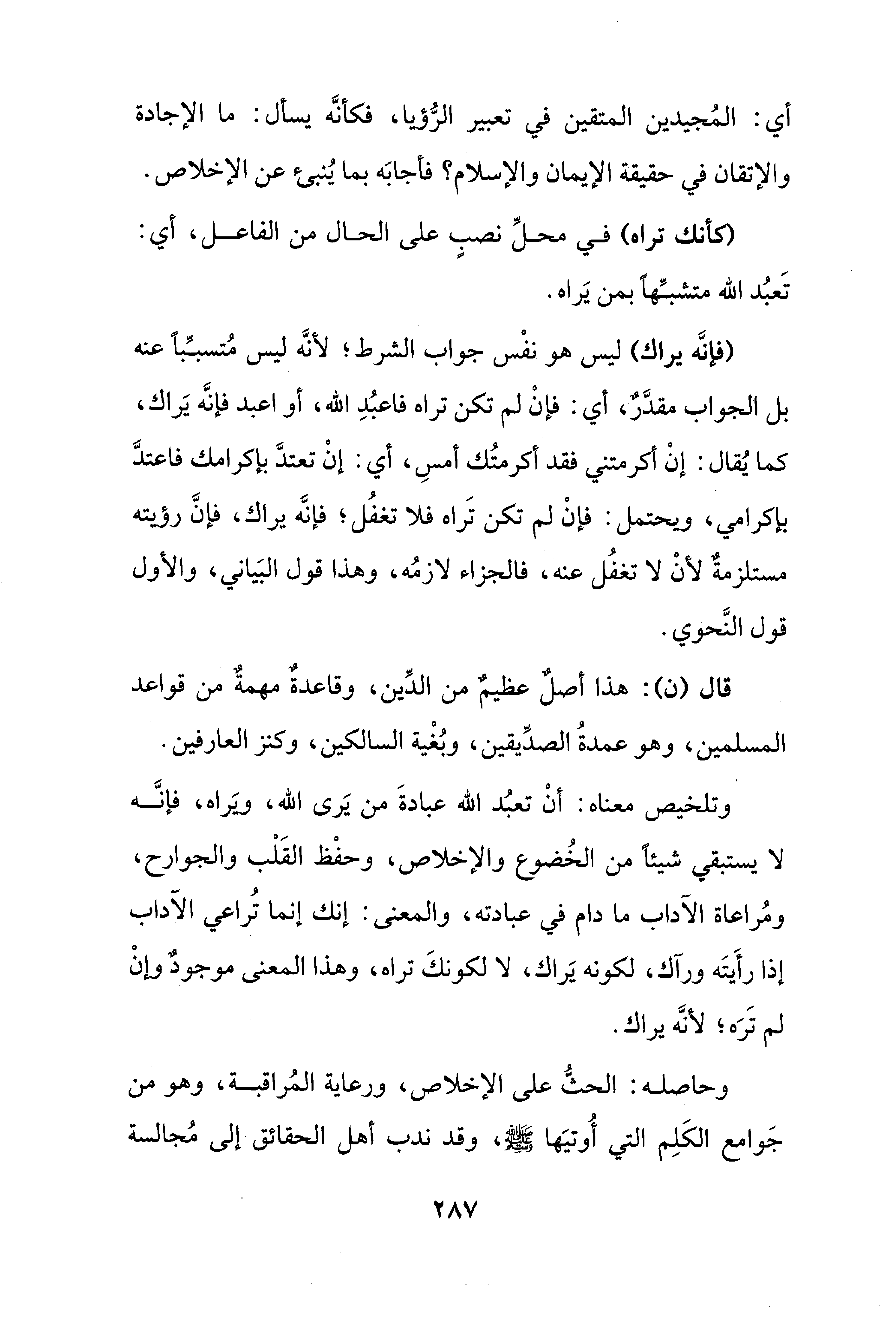 وتلخيص معناه: أنْ تعبُد الله عبادةَ من يَرى الله، وَيراه، فإنَّه لا يستبقي شيئًا من الخُضوع والإخلاص، وحفْظ القَلْب والجوارح، ومُراعاة الآداب ما دام في عبادته، والمعنى: إنك إنما تُراعي الآداب إذا رأَيتَه ورآك، لكونه يَراك، لا لكونكَ تراه، وهذا المعنى موجود وإنْ لم تَرَه؛ لأنَّه يراك.