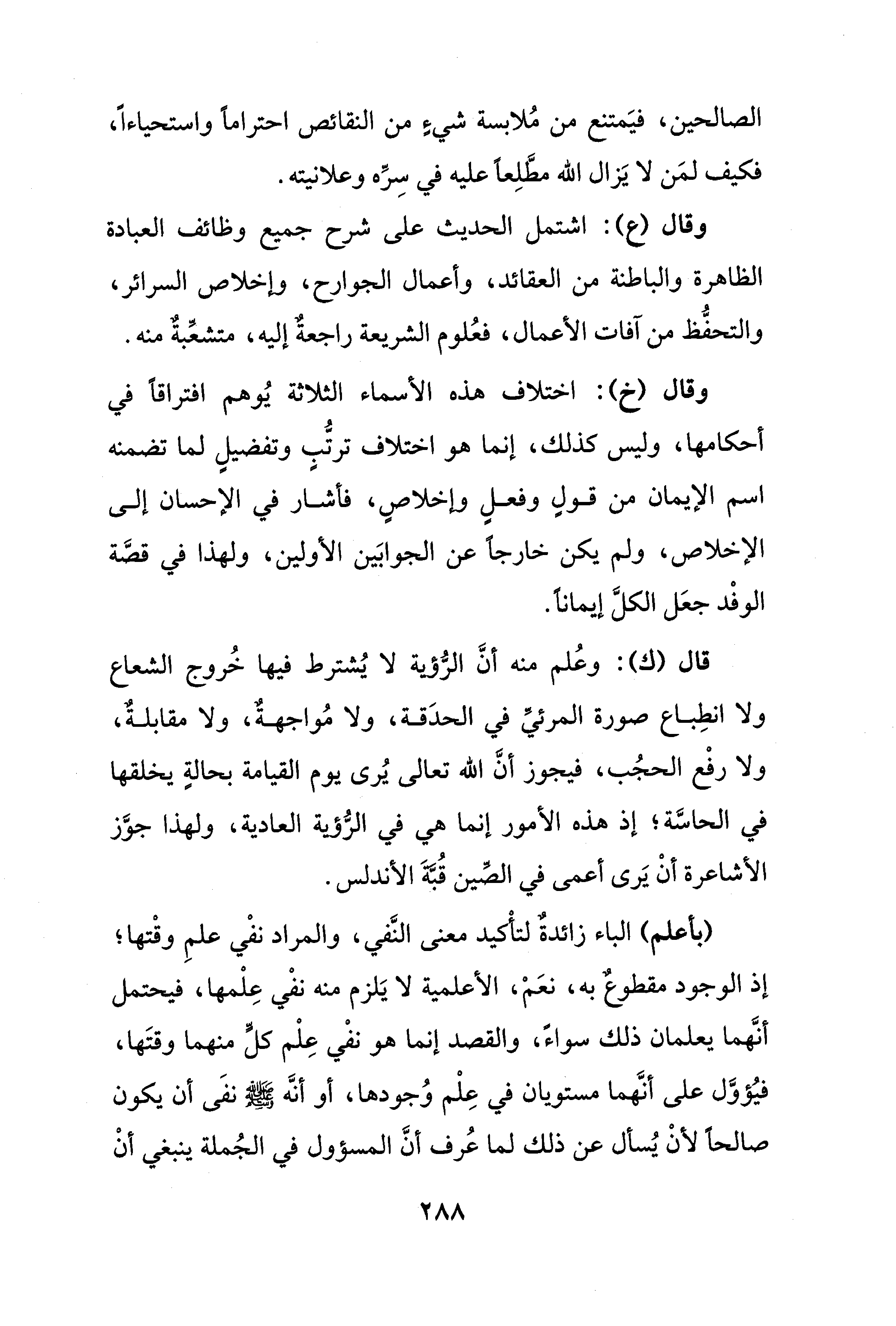 وقال (خ): اختلاف هذه الأسماء الثلاثة يُوهم افتراقًا في أحكامها، وليس كذلك، إنما هو اختلاف ترتُّب وتفضيل لما تضمنه اسم الإيمان من قولٍ وفعلٍ وإخلاصٍ، فأشار في الإحسان إلى الإخلاص، ولم يكن خارجًا عن الجوابَين الأولين، ولهذا في قصَّة الوفْد جعَل الكلَّ إيمانا.