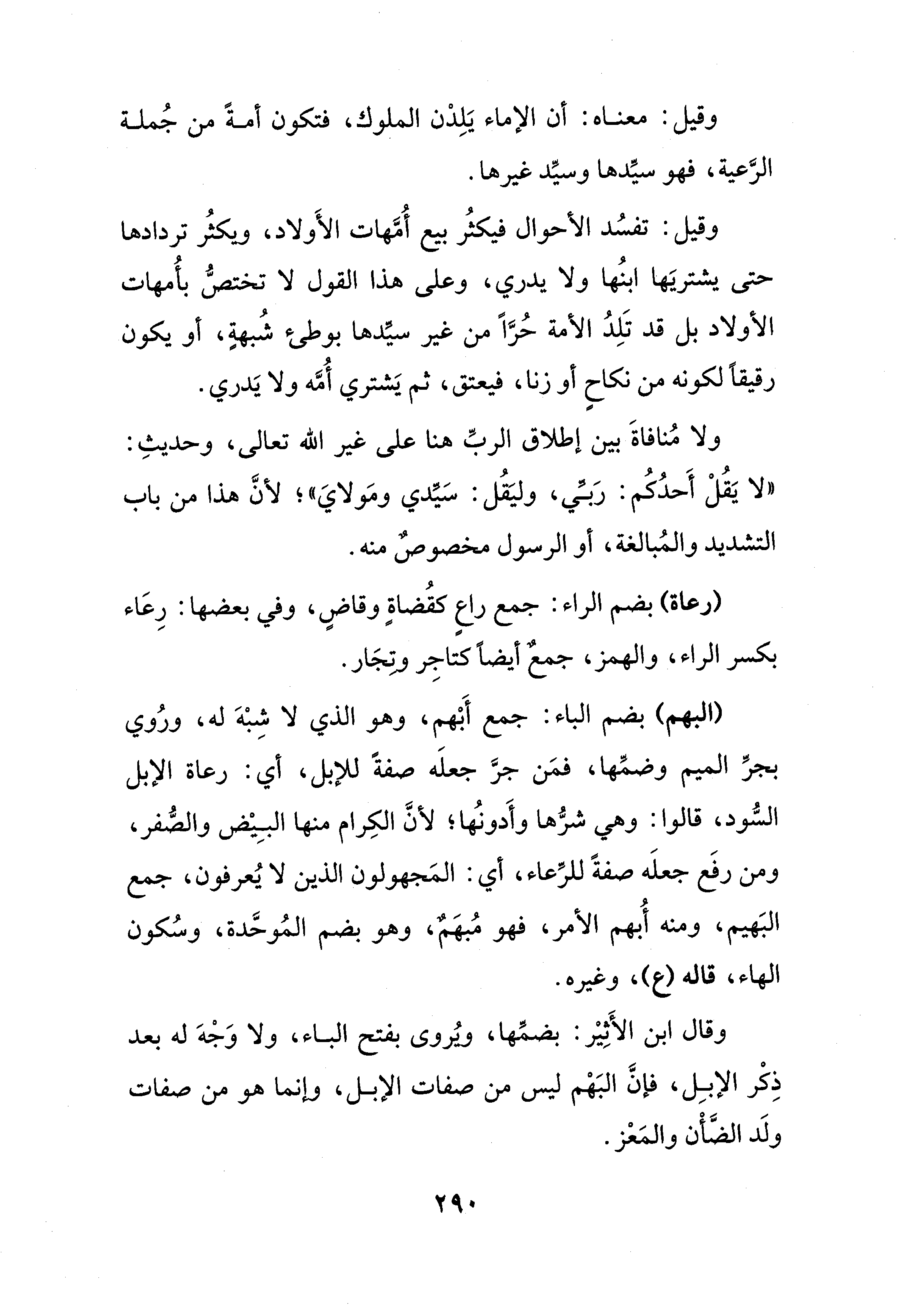 وقال ابن الأَثِيْر: بضمِّها، ويُروى بفتح الباء، ولا وَجْهَ له بعد ذِكْر الإبِل، فإنَّ البَهْم ليس من صفات الإبل، وإنما هو من صفات ولَد الضَّأْن والمَعْز.