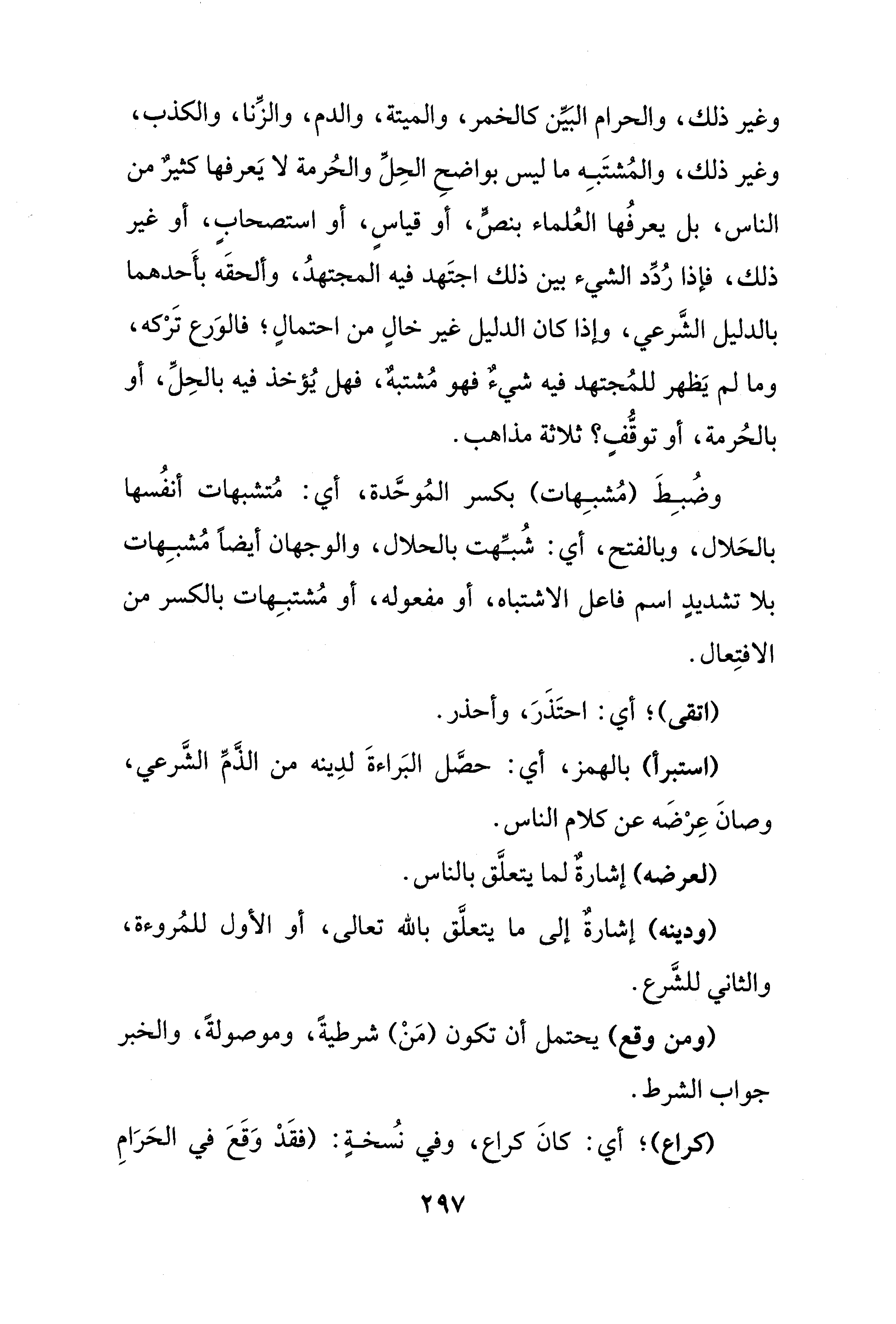 وغير ذلك، والحرام البيِّن كالخمر، والميتة، والدم، والزِّنا، والكذب، وغير ذلك، والمُشتَبِه ما ليس بواضحِ الحِلِّ والحُرمة لا يَعرفها كثيرٌ من الناس، بل يعرفُها العُلماء بنصٍّ، أو قياسٍ، أو استصحابٍ، أو غير ذلك، فإذا رُدِّد الشيء بين ذلك اجتَهد فيه المجتهدُ، وألحقَه بأَحدهما بالدليل الشَّرعي، وإذا كان الدليل غير خالٍ من احتمالٍ؛ فالوَرع تَرْكه، وما لم يَظهر للمُجتهد فيه شيءٌ فهو مُشتبهٌ، فهل يُؤخذ فيه بالحِلِّ، أو بالحُرمة، أو توقُّفٍ؟ ثلاثة مذاهب.