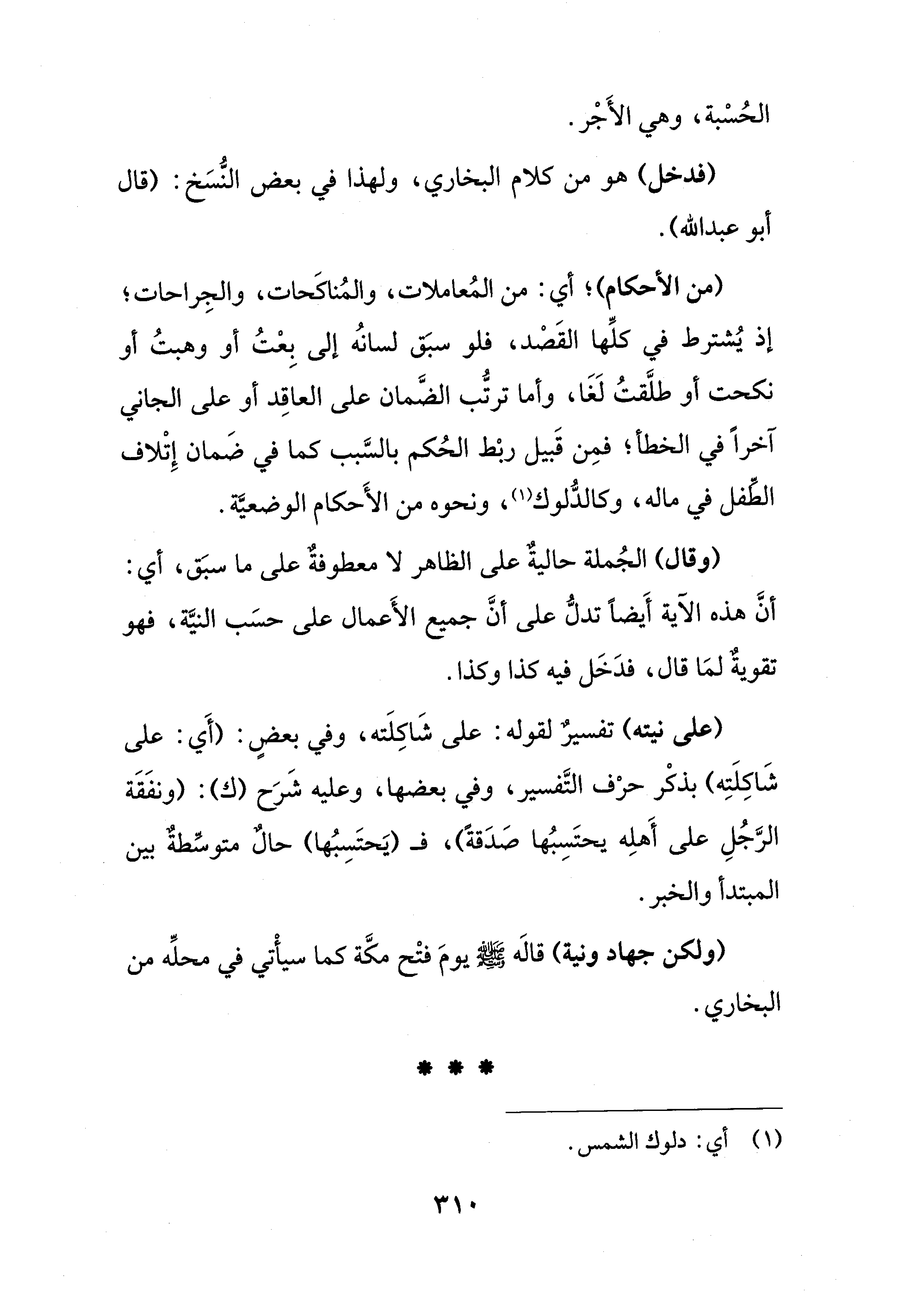 (على نيته) تفسيرٌ لقوله: على شَاكِلَته، وفي بعضٍ: (أَي: على شَاكِلَتِه) بذكْر حرف التَّفسير، وفي بعضها، وعليه شَرَح (ك): (ونفَقَة الرَّجُلِ على أَهلِه يحتَسِبُها صَدَقةً)، فـ (يَحتَسِبُها) حالٌ متوسِّطةٌ بين المبتدأ والخبر.