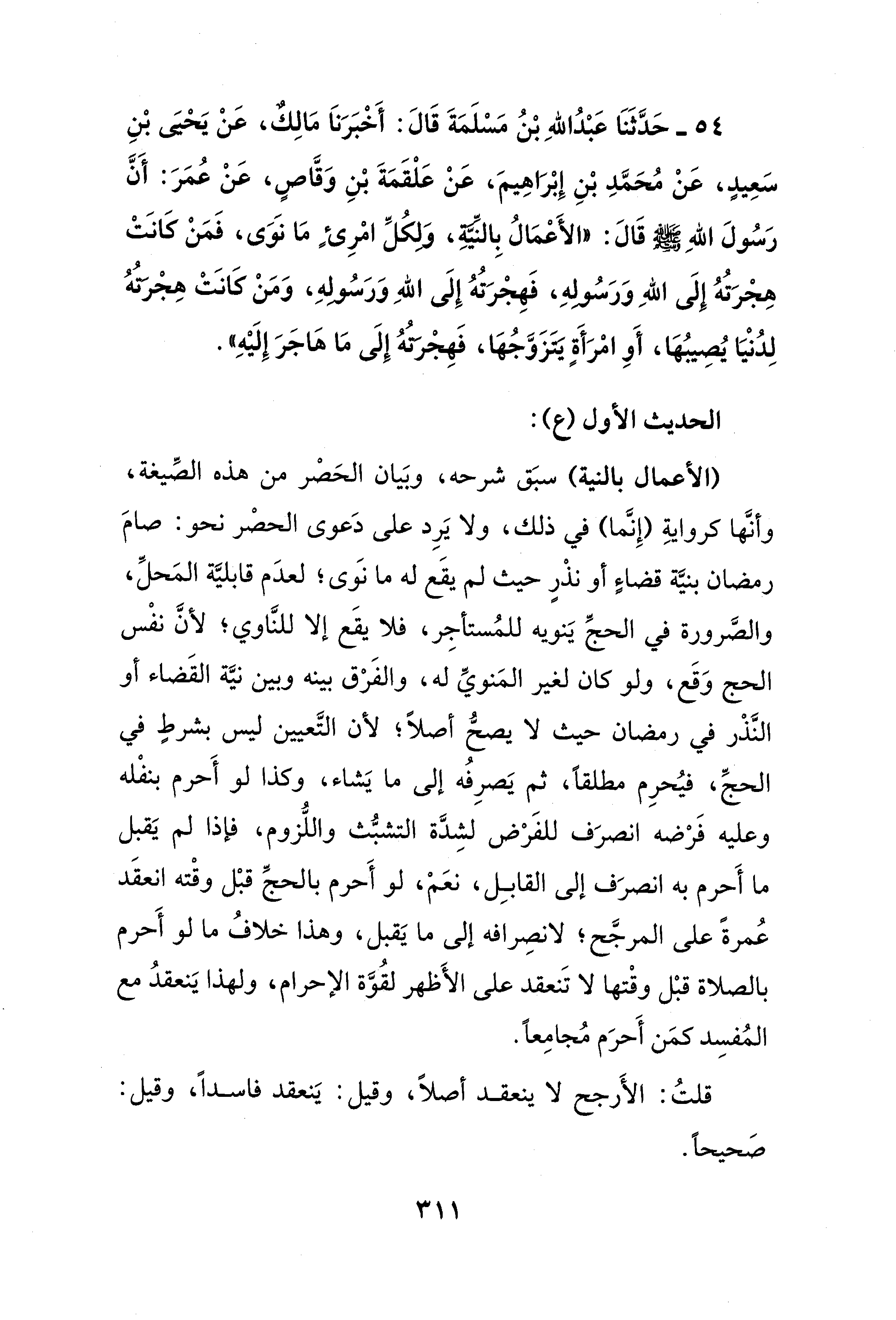 54 - حَدَّثَنَا عَبْدُ اللهِ بْنُ مَسْلَمَةَ قَالَ: أَخْبَرَنَا مَالِكٌ، عَنْ يَحيىَ بْنِ سَعِيدٍ، عَنْ مُحَمَّدِ بْنِ إِبْراهِيمَ، عَنْ عَلْقَمَةَ بْنِ وَقَّاصٍ، عَنْ عُمَرَ: أَنَّ رَسُولَ اللهِ - صلى الله عليه وسلم - قَالَ: "الأعمَالُ بِالنية، وَلكُلِّ امرِئِ مَا نوَى، فَمَنْ كَانَتْ هِجْرَتُهُ إِلَى اللهِ وَرَسُولهِ، فَهِجْرَتُهُ إِلَى اللهِ وَرَسُولهِ، وَمَنْ كَانَتْ هِجْرتُهُ لِدُنْيَا يُصِيبُها، أَوِ امرَأَةٍ يتَزَوَّجُها، فَهِجْرتُهُ إِلَى مَا هاجَرَ إِلَيْهِ".