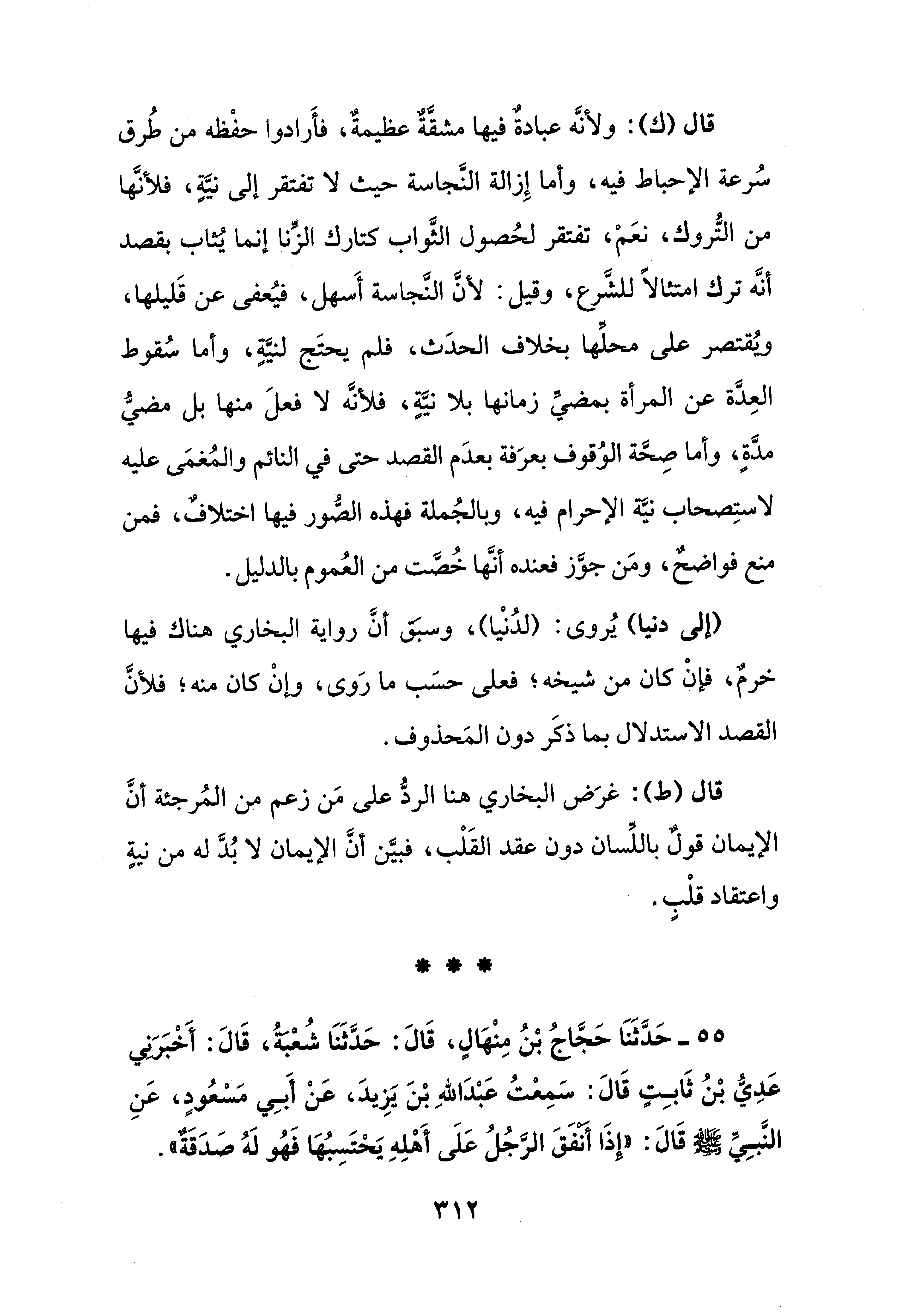قال (ك): ولأنَّه عبادةٌ فيها مشقَّةٌ عظيمةٌ، فأَرادوا حفْظه من طُرق سُرعة الإحباط فيه، وأما إِزالة النَّجاسة حيث لا تفتقر إلى نيَّةٍ، فلأنَّها من التُّروك، نعَمْ، تفتقر لحُصول الثَّواب كتارك الزِّنا إنما يُثاب بقصد أنَّه ترك امتثالًا للشَّرع، وقيل: لأنَّ النَّجاسة أَسهل، فيُعفى عن قَليلها، ويُقتصر على محلِّها بخلاف الحدَث، فلم يحتَج لنيَّةٍ، وأما سُقوط العِدَّة عن المرأة بمضيِّ زمانها بلا نية، فلأنَّه لا فعلَ منها بل مضيُّ مدَّة، وأما صِحَّة الوُقوف بعرَفة بعدَم القصد حتى في النائم والمُغمَى عليه لاستِصحاب نيّة الإحرام فيه، وبالجُملة فهذه الصُّور فيها اختلاف، فمن منع فواضحٌ، ومَن جوَّز فعنده أنَّها خُصَّت من العُموم بالدليل.