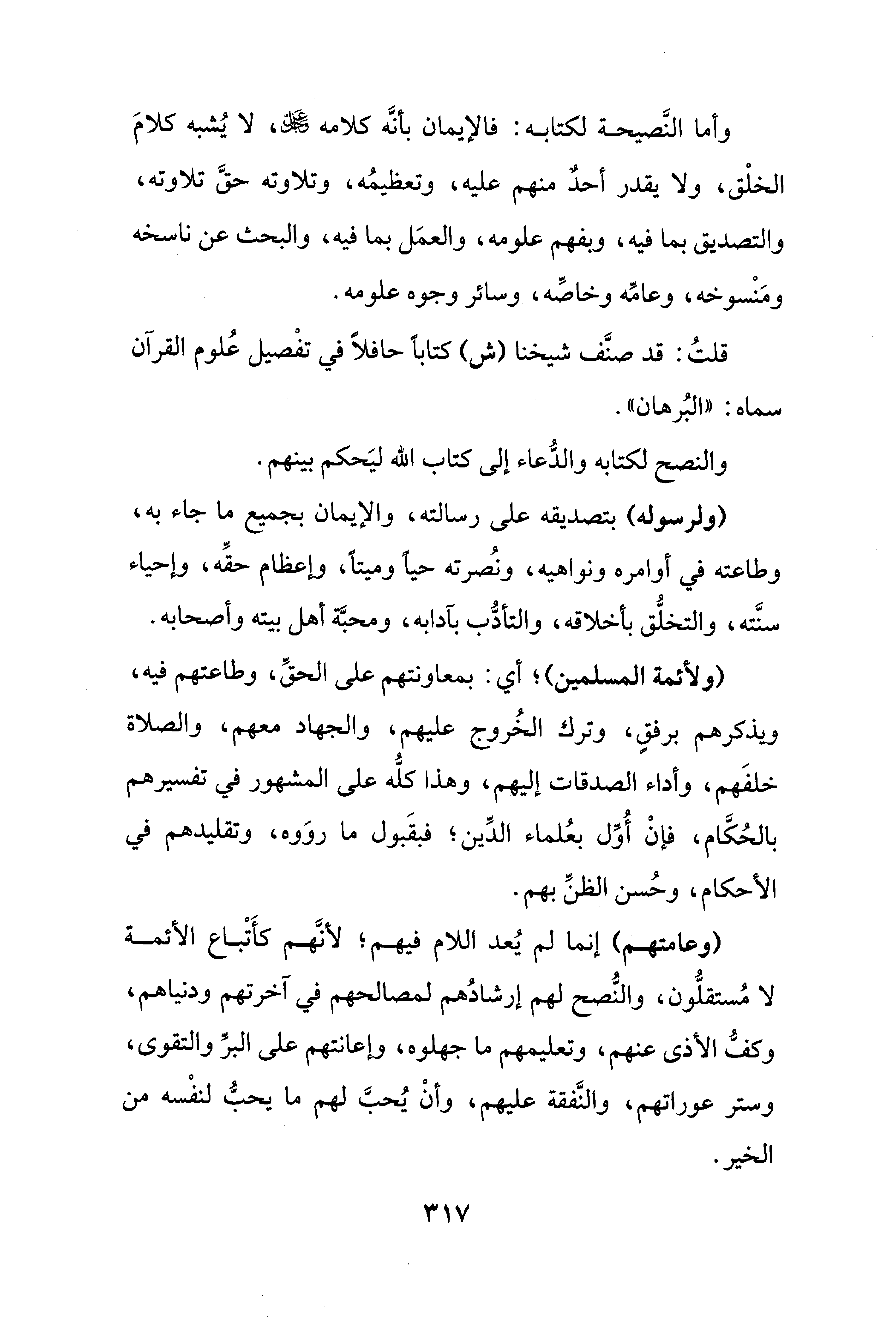 وأما النَّصيحة لكتابه: فالإيمان بأنَّه كلامه - عز وجل -، لا يُشبه كلامَ الخلْق، ولا يقدر أحدٌ منهم عليه، وتعظيمُه، وتلاوته حقَّ تلاوته، والتصديق بما فيه، وبفهم علومه، والعمَل بما فيه، والبحث عن ناسخه ومَنْسوخه، وعامِّه وخاصِّه، وسائر وجوه علومه.