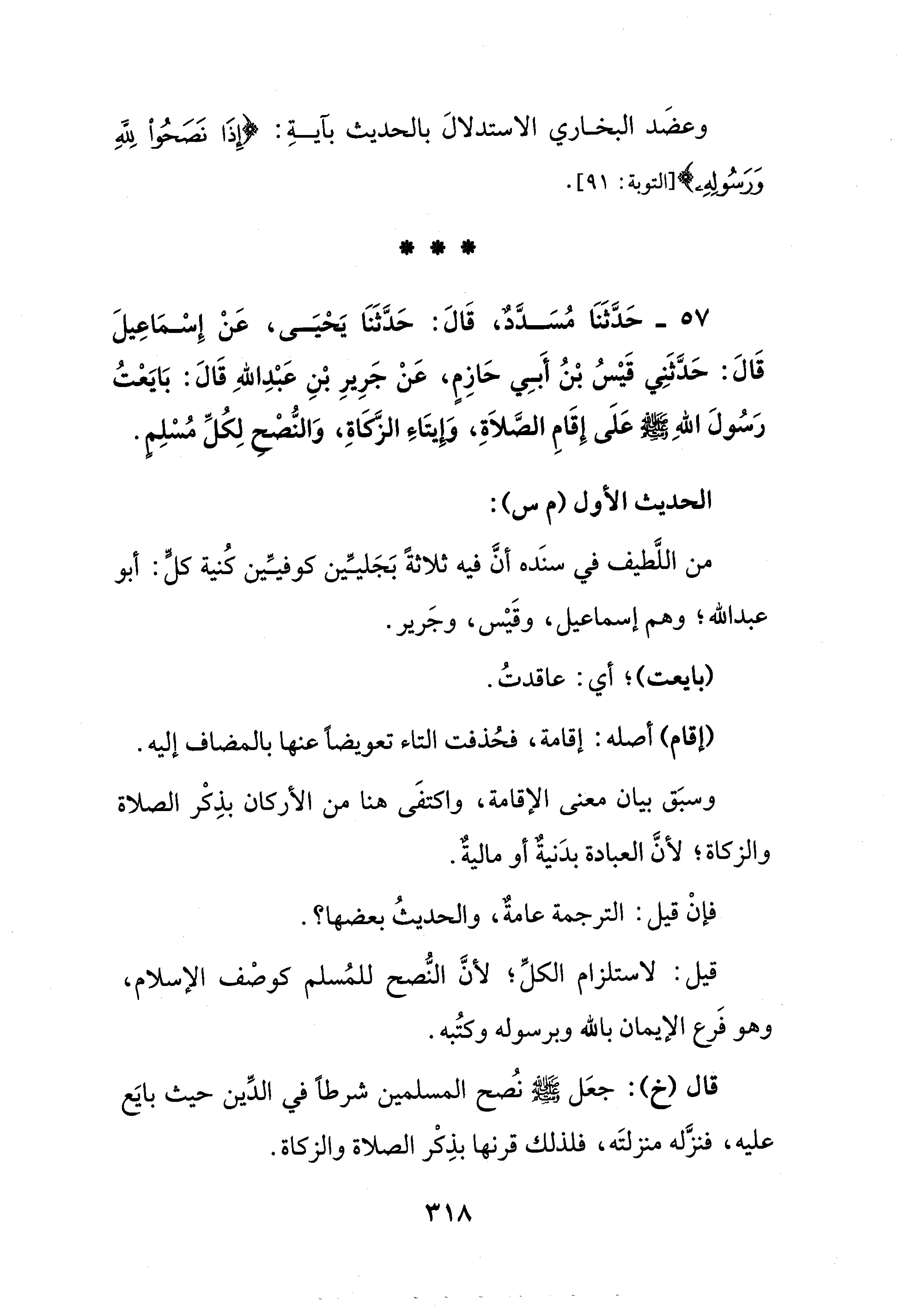 57 - حَدَّثَنَا مُسَدَّدٌ، قَالَ: حَدَّثَنَا يَحيَى، عَنْ إِسْمَاعِيلَ قَالَ: حَدَّثَنِي قَيْسُ بْنُ أَبِي حَازِمٍ، عَنْ جَرِيرِ بْنِ عَبْدِ اللهِ قَالَ: بَايعتُ رَسُولَ اللهِ - صلى الله عليه وسلم - عَلَى إِقَامِ الصَّلاَةِ، وَإِيتَاءَ الزَّكاةِ، وَالنُّضح لِكُلِّ مُسْلِم.