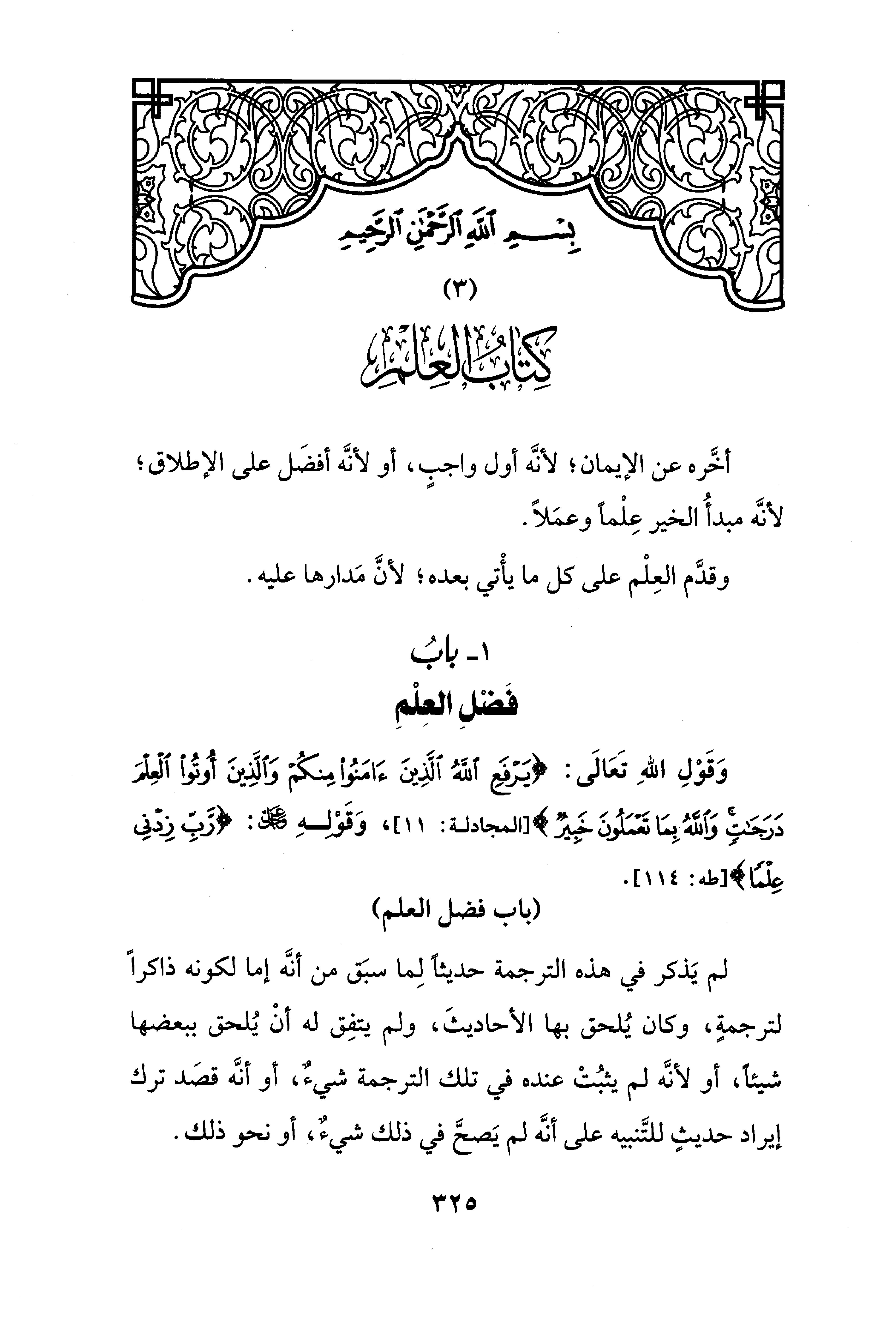 1 - بابُ فَضْلِ العِلْمِ وَقَوْلِ اللهِ تَعَالَى: {يَرْفَعِ اللَّهُ الَّذِينَ آمَنُوا مِنْكُمْ وَالَّذِينَ أُوتُوا الْعِلْمَ دَرَجَاتٍ وَاللَّهُ بِمَا تَعْمَلُونَ خَبِيرٌ} [المجادلة: 11]، وَقولهِ - عز وجل -: {رَبِّ زِدْنِي عِلْمًا} [طه: 114].