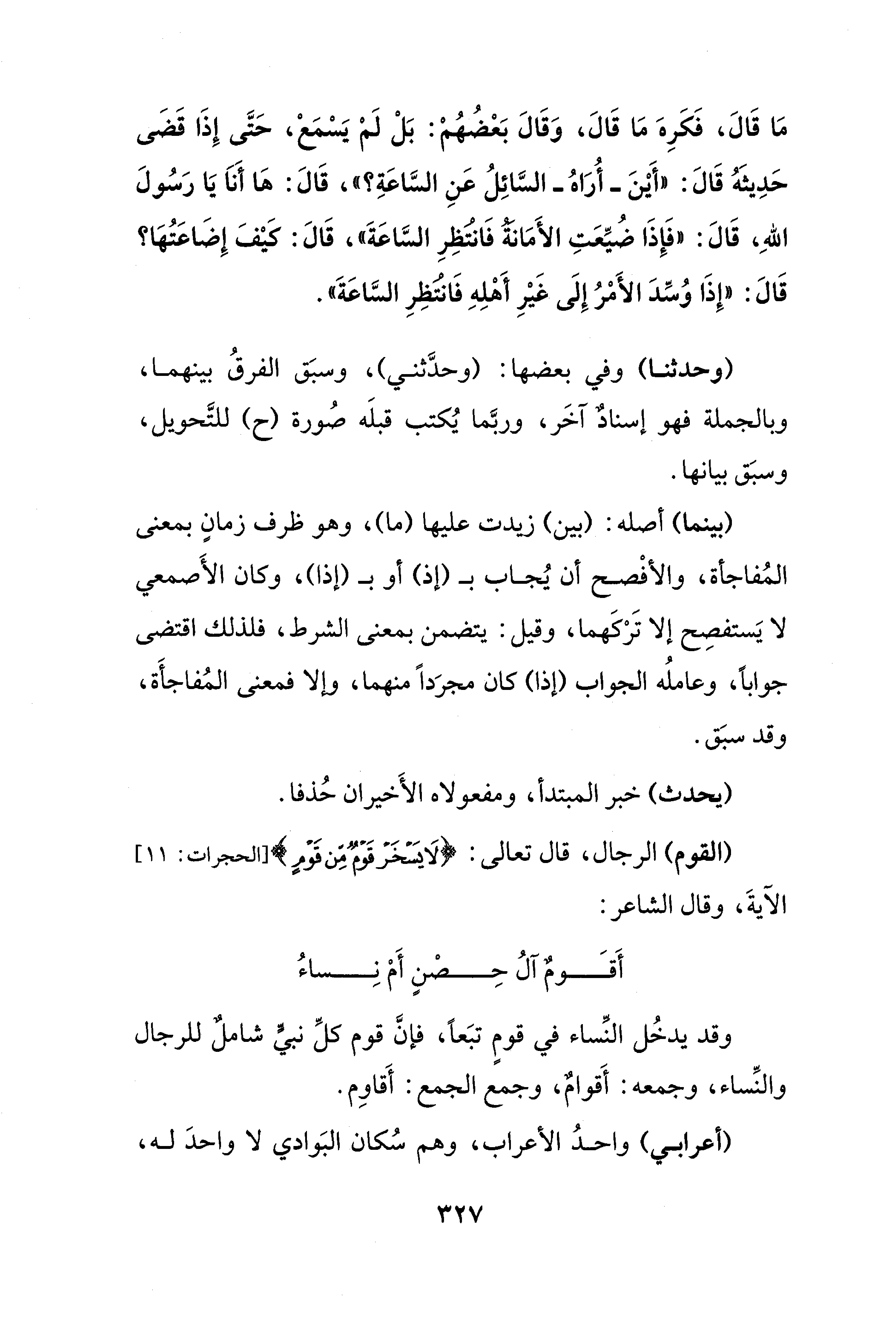 مَا قَالَ، فَكَرِه مَا قَالَ، وَقَالَ بَعْضُهُم: بَلْ لَم يَسْمَع، حَتَّى إِذَا قَضَى حَدِيثَهُ قَالَ: "أَيْنَ -أُرَاهُ- السَّائِلُ عَنِ السَّاعَةِ؟ "، قَالَ: ها أَناَ يَا رَسُولَ اللهِ، قَالَ: "فَإِذَا ضُيِّعَتِ الأَمَانة فَانْتَظِرِ السَّاعَةَ"، قَالَ: كَيْفَ إِضَاعَتُها؟ قَالَ: "إِذَا وُسِّدَ الأَمْرُ إِلَى غَيْرِ أَهْلِهِ فَانْتَظِرِ السَّاعَةَ".