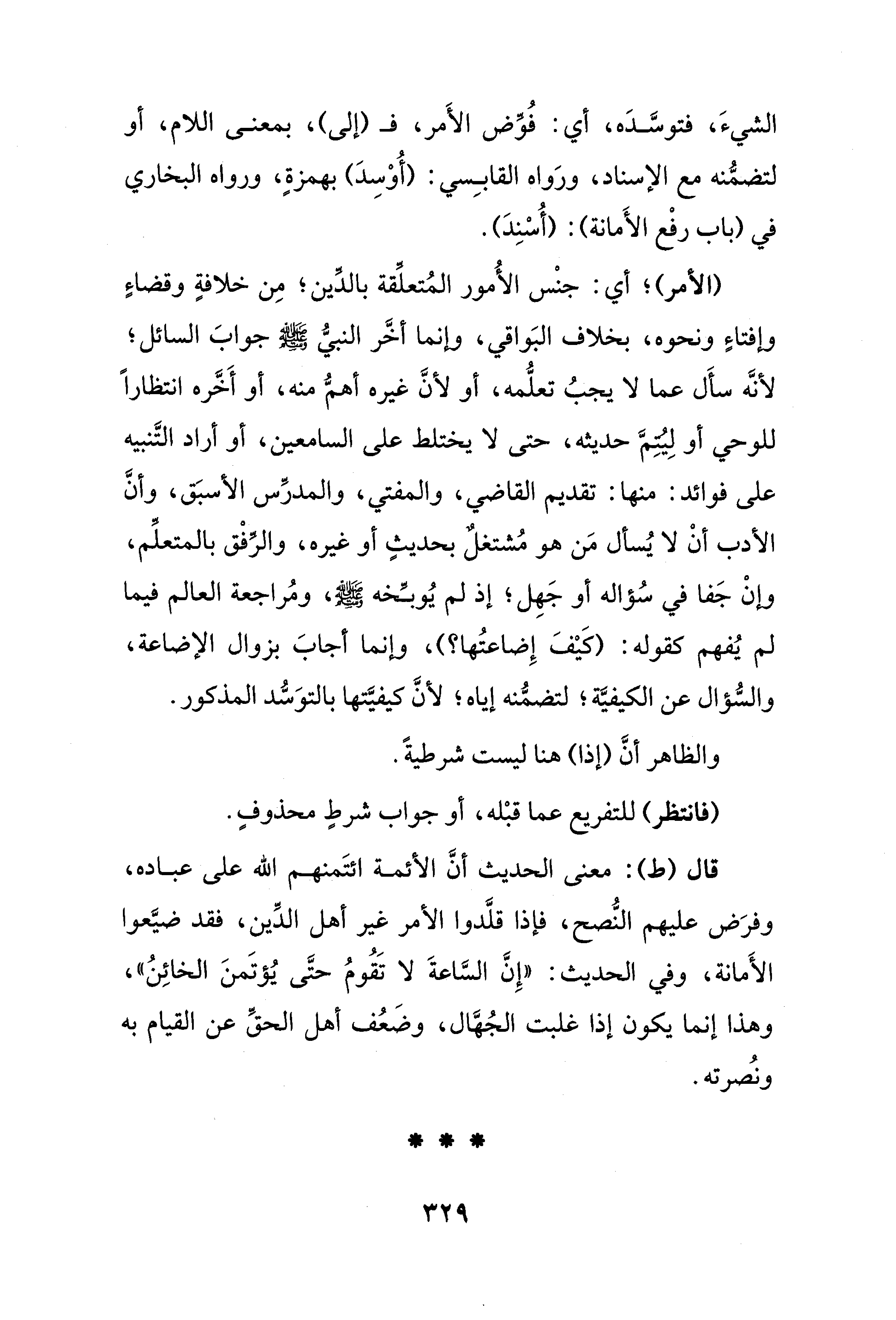 (الأمر)؛ أي: جنْس الأُمور المُتعلِّقة بالدِّين؛ مِن خلافةٍ وقضاءٍ وإفتاءٍ ونحوه، بخلاف البَواقي، وإنما أخَّر النبيُّ - صلى الله عليه وسلم - جوابَ السائل؛ لأنَّه سأَل عما لا يجبُ تعلُّمه، أو لأنَّ غيره أهمُّ منه، أو أَخَّره انتظارًا للوحي أو لِيُتِمَّ حديثه، حتى لا يختلط على السامعين، أو أراد التَّنبيه على فوائد: منها: تقديم القاضي، والمفتي، والمدرِّس الأسبَق، وأنَّ الأدب أنْ لا يُسأل مَن هو مُشتغلٌ بحديثٍ أو غيره، والرِّفْق بالمتعلِّم، وإنْ جَفا في سُؤاله أو جَهِل؛ إذ لم يُوبِّخه - صلى الله عليه وسلم -، ومُراجعة العالم فيما لم يُفهم كقوله: (كَيْفَ إِضاعتُها؟)، وإنما أجابَ بزوال الإضاعة، والسُّؤال عن الكيفيَّة؛ لتضمُّنه إياه؛ لأنَّ كيفيَّتها بالتوَسُّد المذكور.