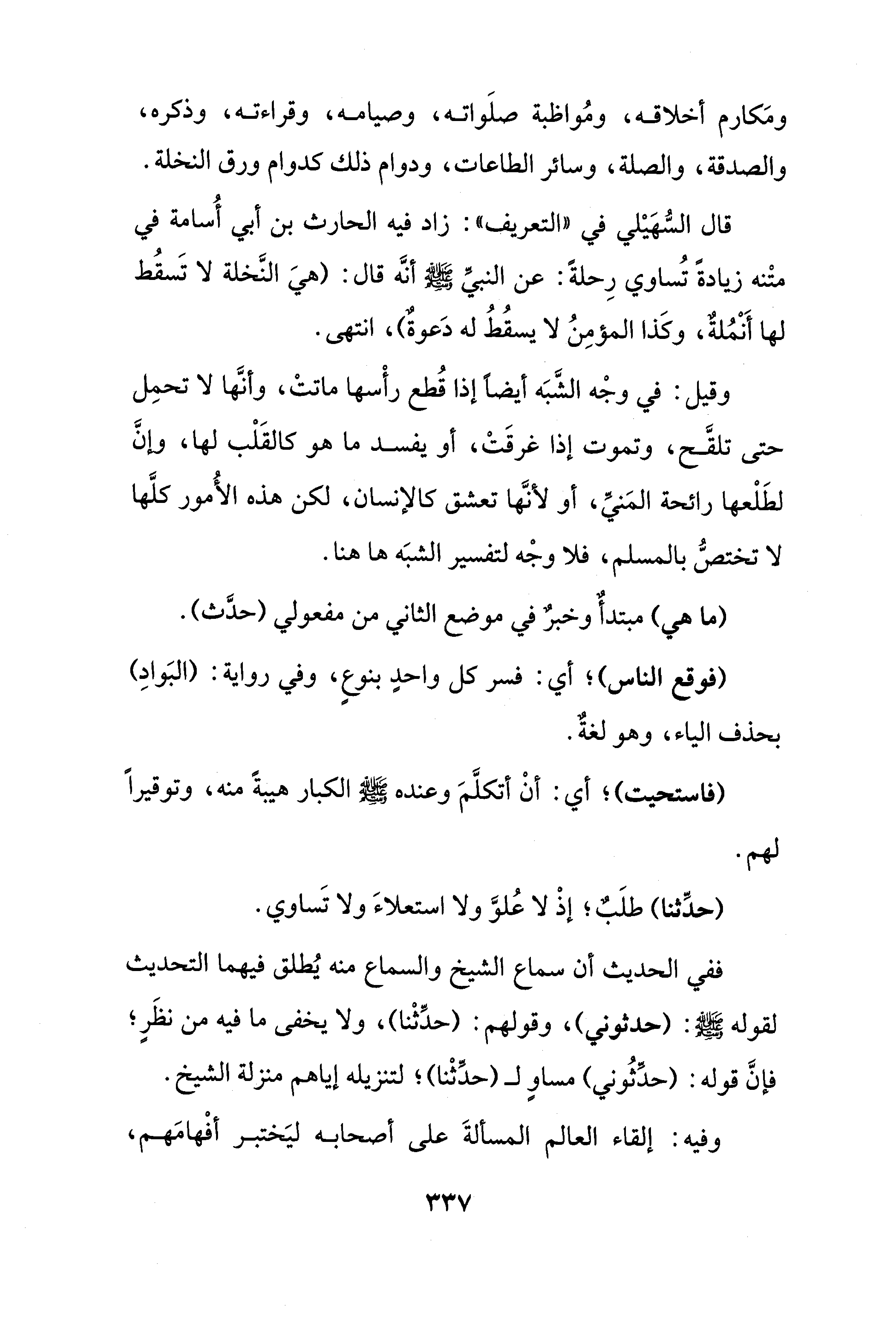 قال السُّهيْلي في "التعريف": زاد فيه الحارث بن أبي أُسامة في متْنه زيادةً تُساوي رِحلةً: عن النبيِّ - صلى الله عليه وسلم - أنَّه قال: "هيَ النَّخلة لا تَسقُط لها أَنْمُلةٌ، وكَذا المؤمِنُ لا يسقُطُ له دَعوةٌ)، انتهى.