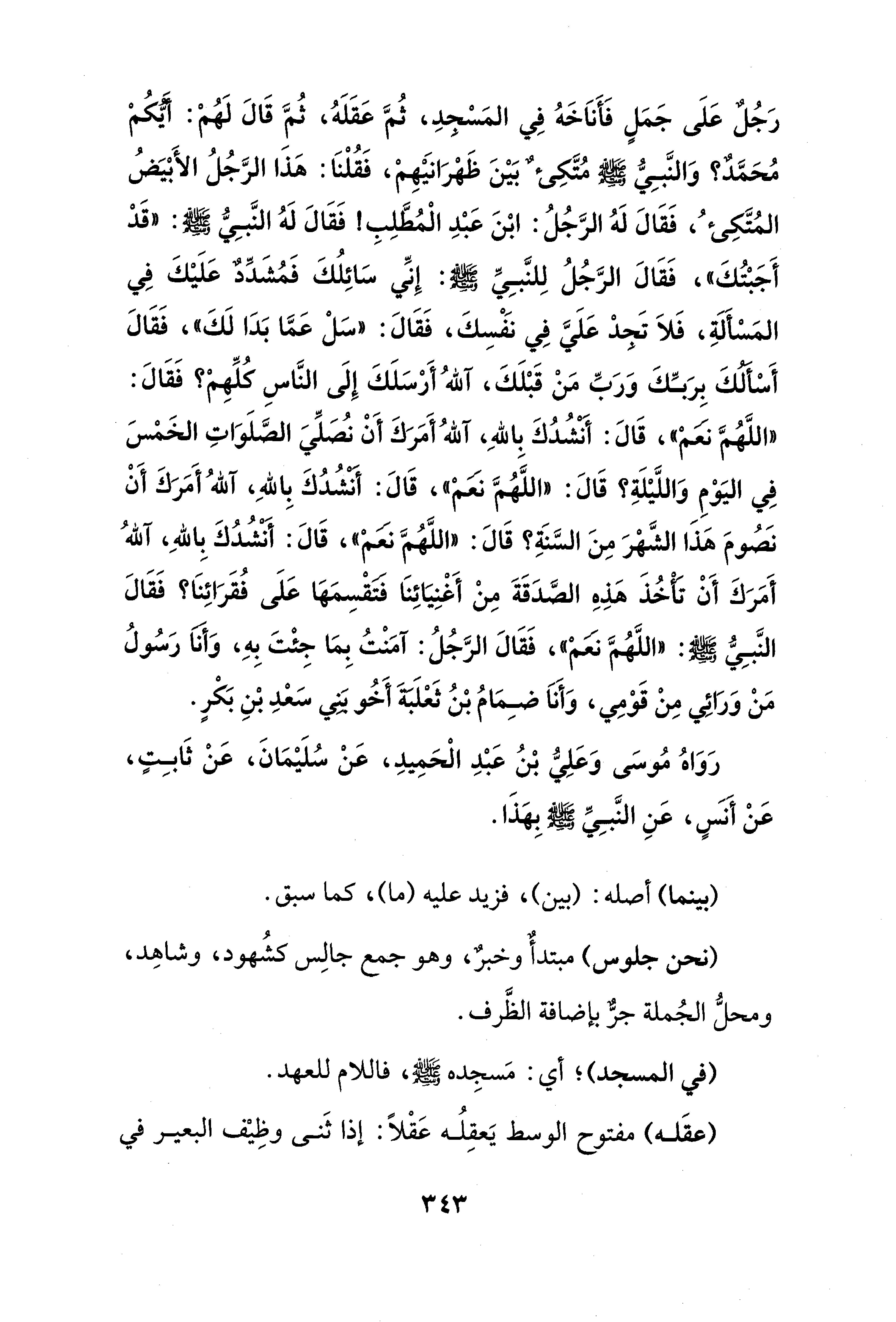 رَجُلٌ عَلَى جَمَلٍ فَأَناَخَهُ فِي المَسْجدِ، ثُمَّ عَقَلَهُ، ثُمَّ قَالَ لَهُم: أيَّكُمْ مُحَمَّد؟ وَالنَّبِيّ - صلى الله عليه وسلم - مُتَّكِئٌ بَيْنَ ظَهْرَانيهِم، فَقُلْنَا: هذا الرَّجُلُ الأَبْيَضُ المُتَّكِئُ، فَقَالَ لَهُ الرَّجُلُ: ابْنَ عَبْدِ الْمُطَّلِبِ! فَقَالَ لَهُ النَّبِيّ - صلى الله عليه وسلم -: "قدْ أَجَبْتُكَ"، فَقَالَ الرَّجُلُ لِلنَّبِيِّ - صلى الله عليه وسلم -: إِنِّي سَائِلُكَ فَمُشَدِّد عَلَيْكَ فِي المَسْألَةِ، فَلاَ تَجدْ عَلَيَّ فِي نَفْسِكَ، فَقَالَ: "سَلْ عَمَّا بَدَا لَكَ"، فَقَالَ أَسألكَ بِرَبِّكَ وَرَبِّ مَنْ قَبْلَكَ، آللهُ أَرْسَلَكَ إِلَى النَّاسِ كلِّهمْ؟ فَقَالَ: "اللَّهُمَّ نعم"، قَالَ: أَنْشُدُكَ بِاللهِ، آللهُ أَمَرَكَ أَنْ نُصَلِّيَ الصَّلَوَاتِ الخَمْسَ فِي اليَوْمِ وَاللَّيْلَةِ؟ قَالَ: "اللَّهُمَّ نعمْ"، قَالَ: أَنْشُدُكَ بِاللهِ، آللهُ أَمَرَكَ أَنْ نَصُومَ هذَا الشَّهْرَ مِنَ السَّنَةِ؟ قَالَ: "اللَّهُمَّ نعم"، قَالَ: أنشُدُكَ بِاللهِ، آللهُ أَمَرَكَ أَنْ تأخُذَ هذِهِ الصَّدَقَةَ مِنْ أَغْنِيَائِنَا فتقْسِمها عَلَى فُقَرَائِنَا؟ فَقَالَ النَّبِيّ - صلى الله عليه وسلم -: "اللَّهُمَّ نعم"، فَقَالَ الرَّجُلُ: آمَنْتُ بِمَا جِئْتَ بِهِ، وَأنا رَسُولُ مَنْ وَرَائِي مِنْ قَوْمِي، وَأَناَ ضِمَامُ بْنُ ثَعلَبةَ أَخُو بني سَعْدِ بْنِ بَكْرٍ.