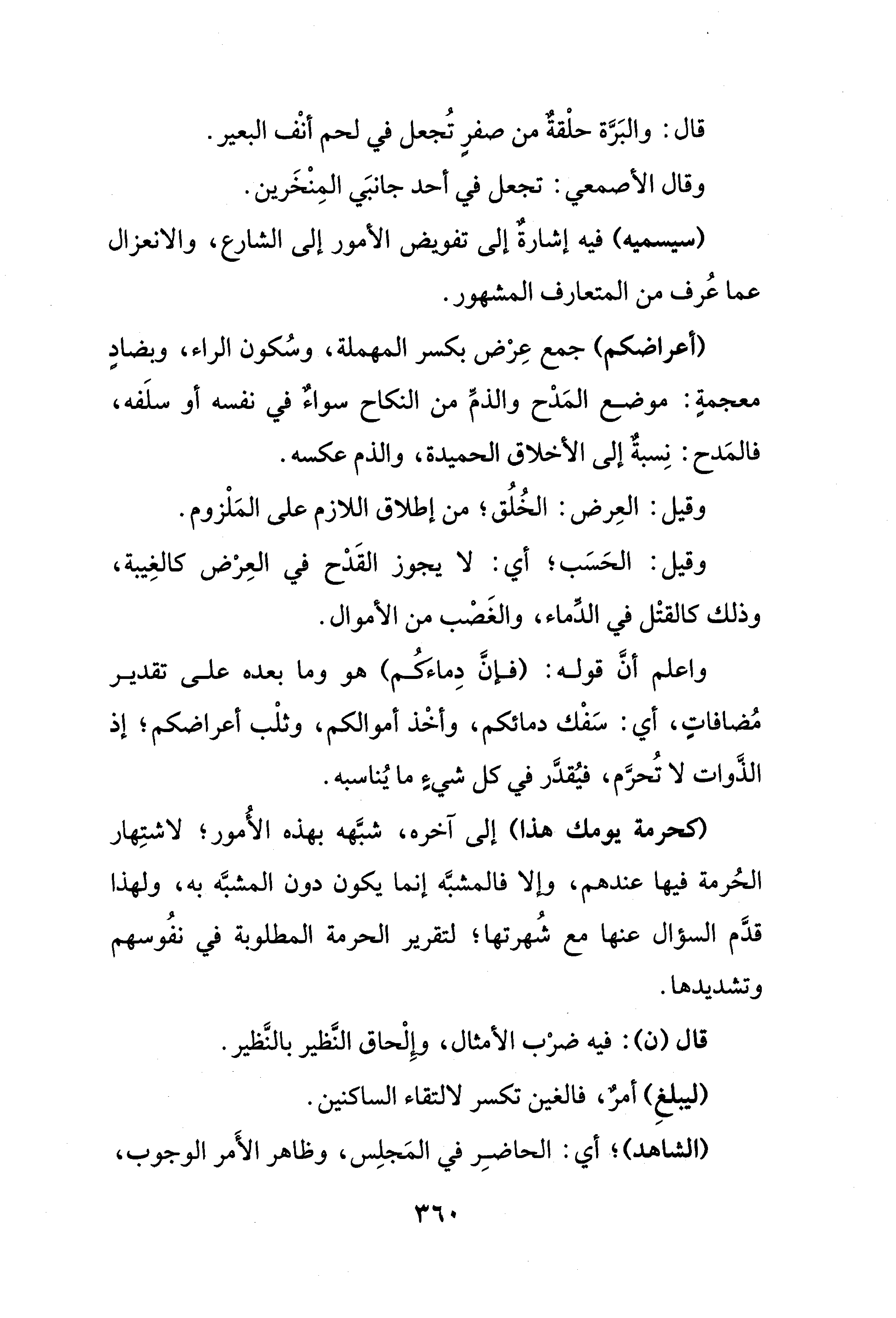 واعلم أنَّ قوله: (فإنَّ دِماءكم) هو وما بعده على تقدير مُضافاتٍ، أي: سَفْك دمائكم، وأخْذ أموالكم، وثلْب أعراضكم؛ إذ الذَّوات لا تُحرَّم، فيُقدَّر في كل شيءٍ ما يُناسبه.