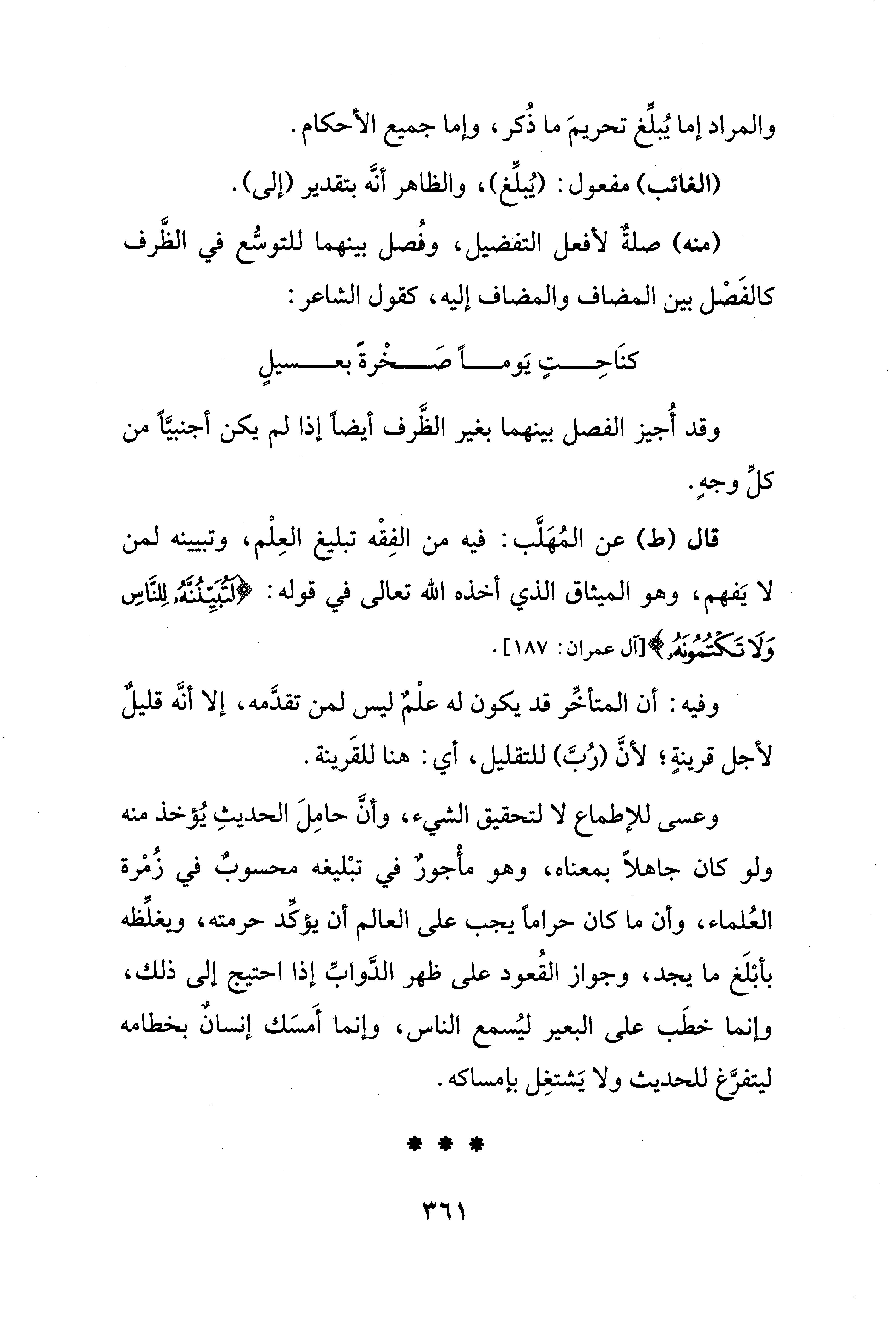 قال (ط) عن المُهَلَّب: فيه من الفِقْه تبليغ العِلْم، وتبيينه لمن لا يَفهم، وهو الميثاق الذي أخذه الله تعالى في قوله: {لَتُبَيِّنُنَّهُ لِلنَّاسِ وَلَا تَكْتُمُونَهُ} [آل عمران: 187].