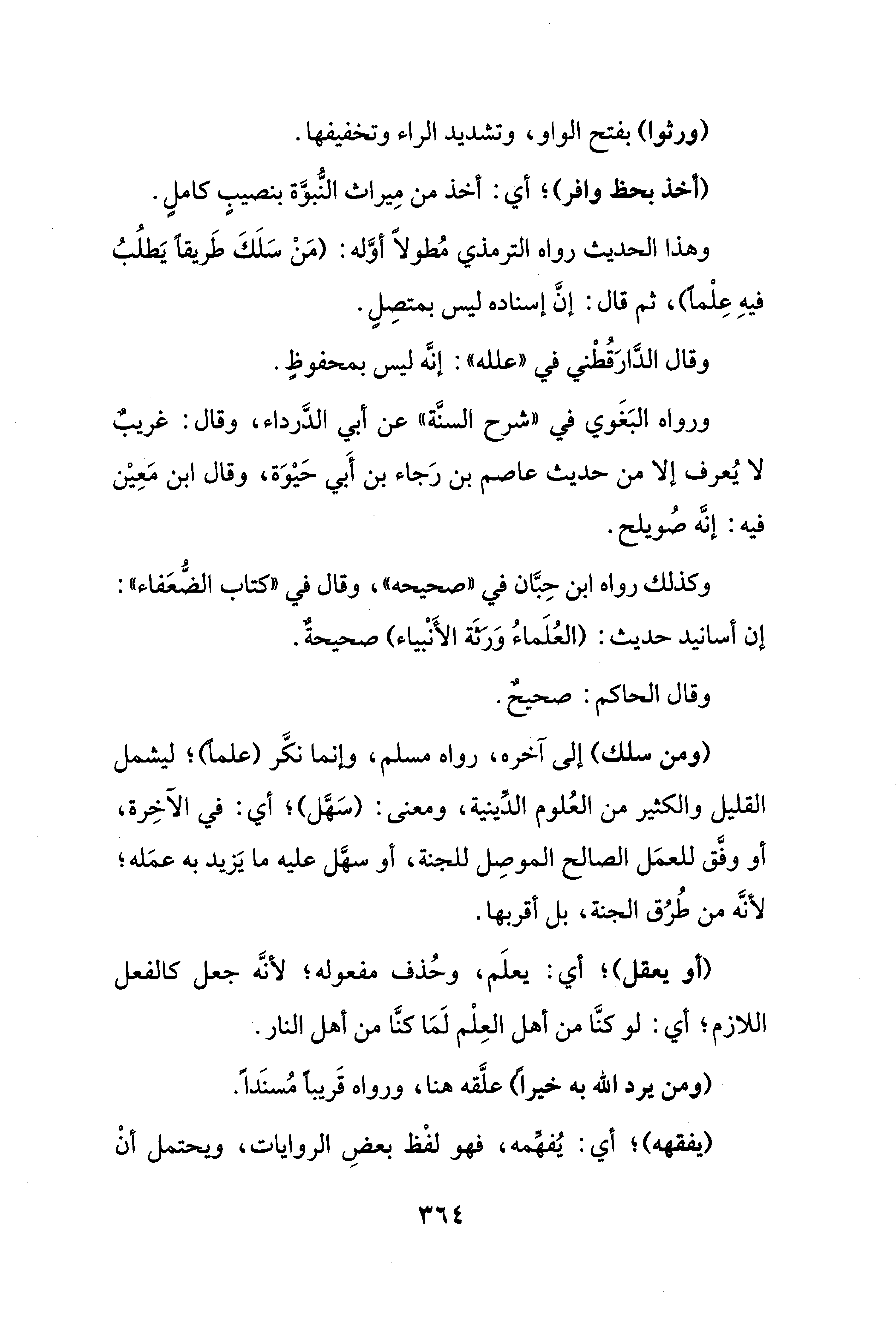 وكذلك رواه ابن حِبَّان في "صحيحه"، وقال في "كتاب الضُّعَفاء": إن أسانيد حديث: (العُلَماءُ وَرثة الأَنْبياء) صحيحةٌ.
