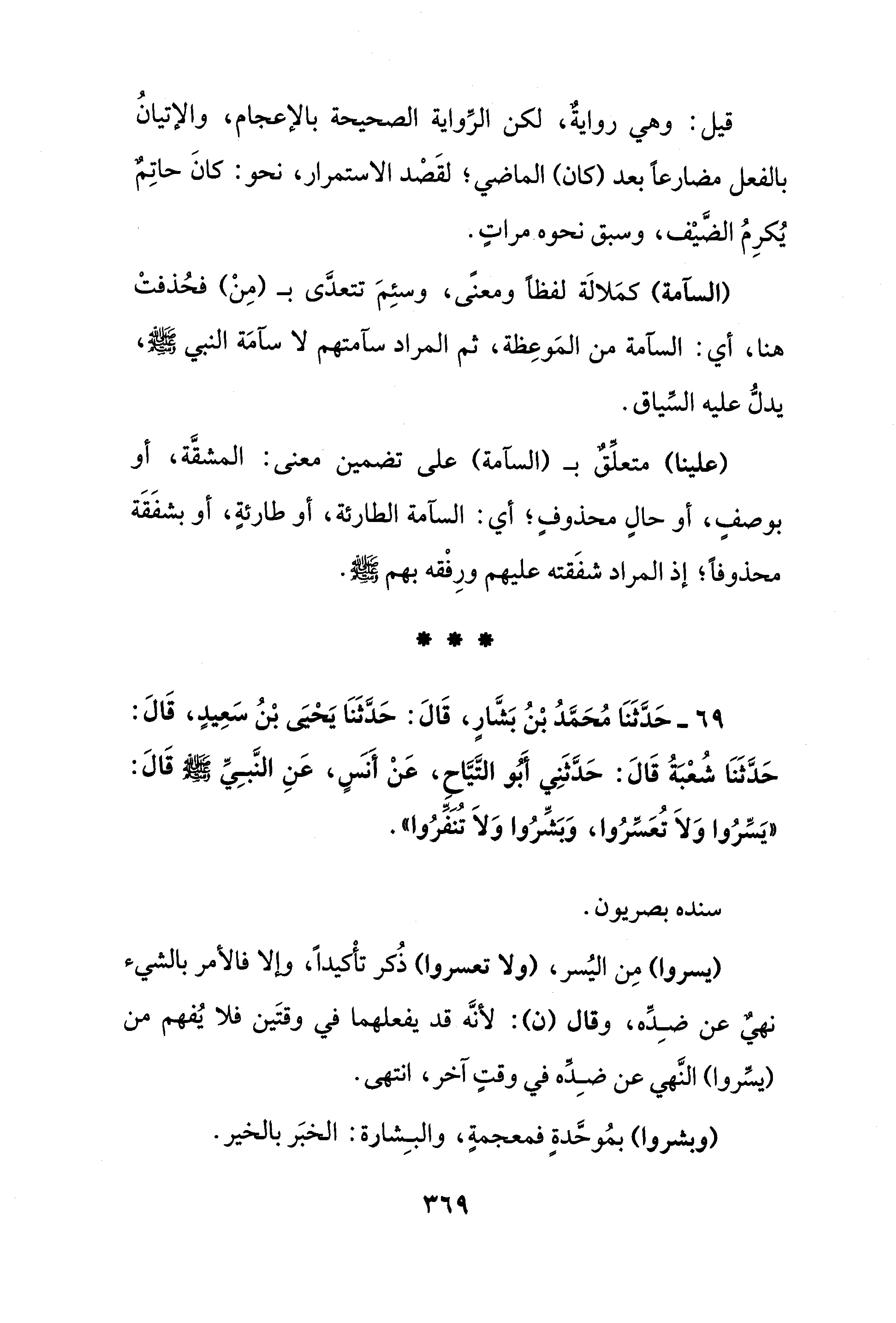 69 - حَدَّثَنَا مُحَمَّدُ بْنُ بَشَّارٍ، قَالَ: حَدَّثَنَا يَحيىَ بْنُ سَعِيدٍ، قَالَ: حَدَّثَنَا شُعبَةُ قَالَ: حَدَّثَنِي أَبُو التَّيَّاحِ، عَنْ أَنسٍ، عَنِ النَّبِيِّ - صلى الله عليه وسلم - قَالَ: "يَسِّرُوا وَلاَ تُعَسِّرُوا، وَبَشِّرُوا وَلاَ تُنَفِّرُوا".