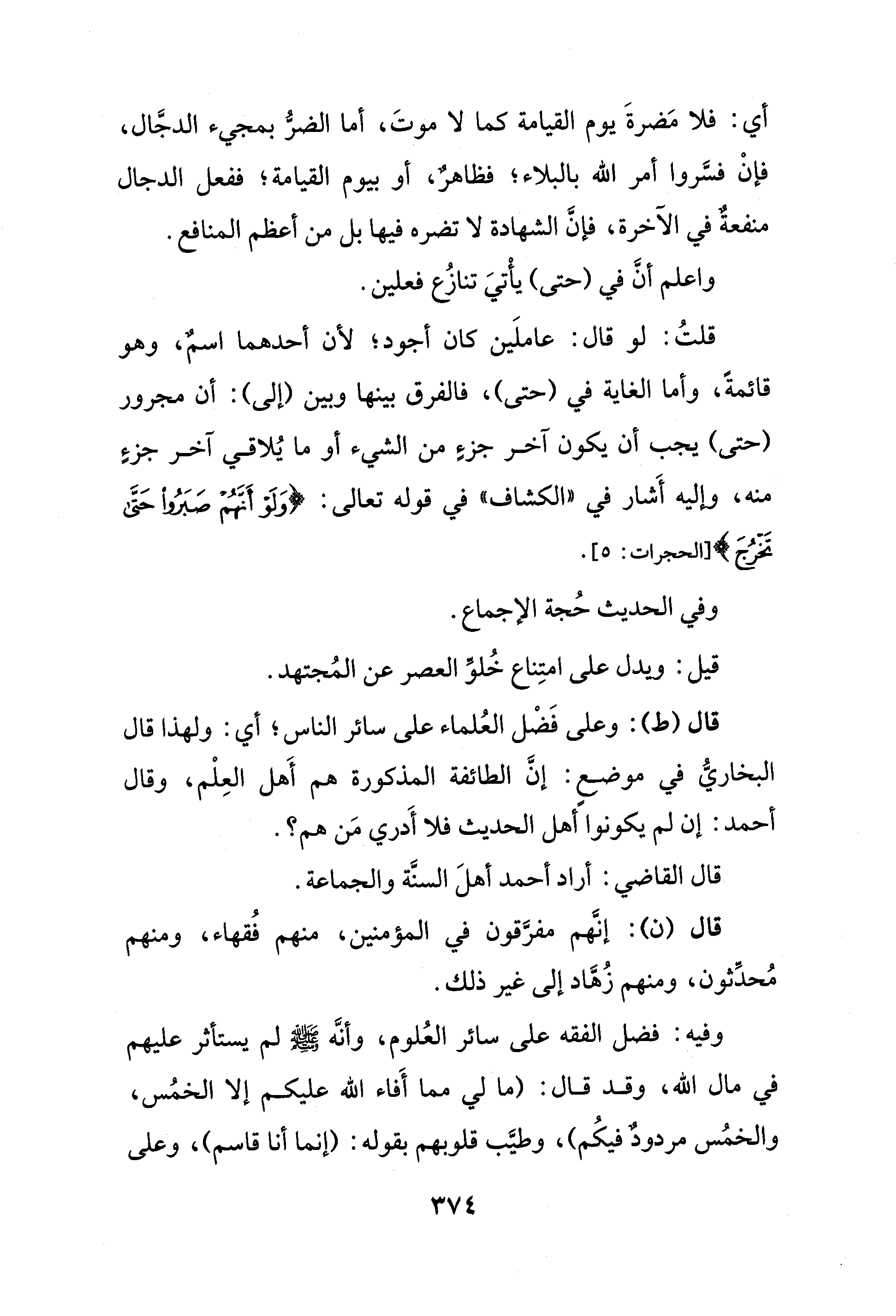 قال (ط): وعلى فَضْل العُلماء على سائر الناس؛ أي: ولهذا قال البخاريُّ في موضع: إنَّ الطائفة المذكورة هم أَهل العِلْم، وقال أحمد: إن لم يكونوا أهل الحديث فلا أَدري مَن هم؟.