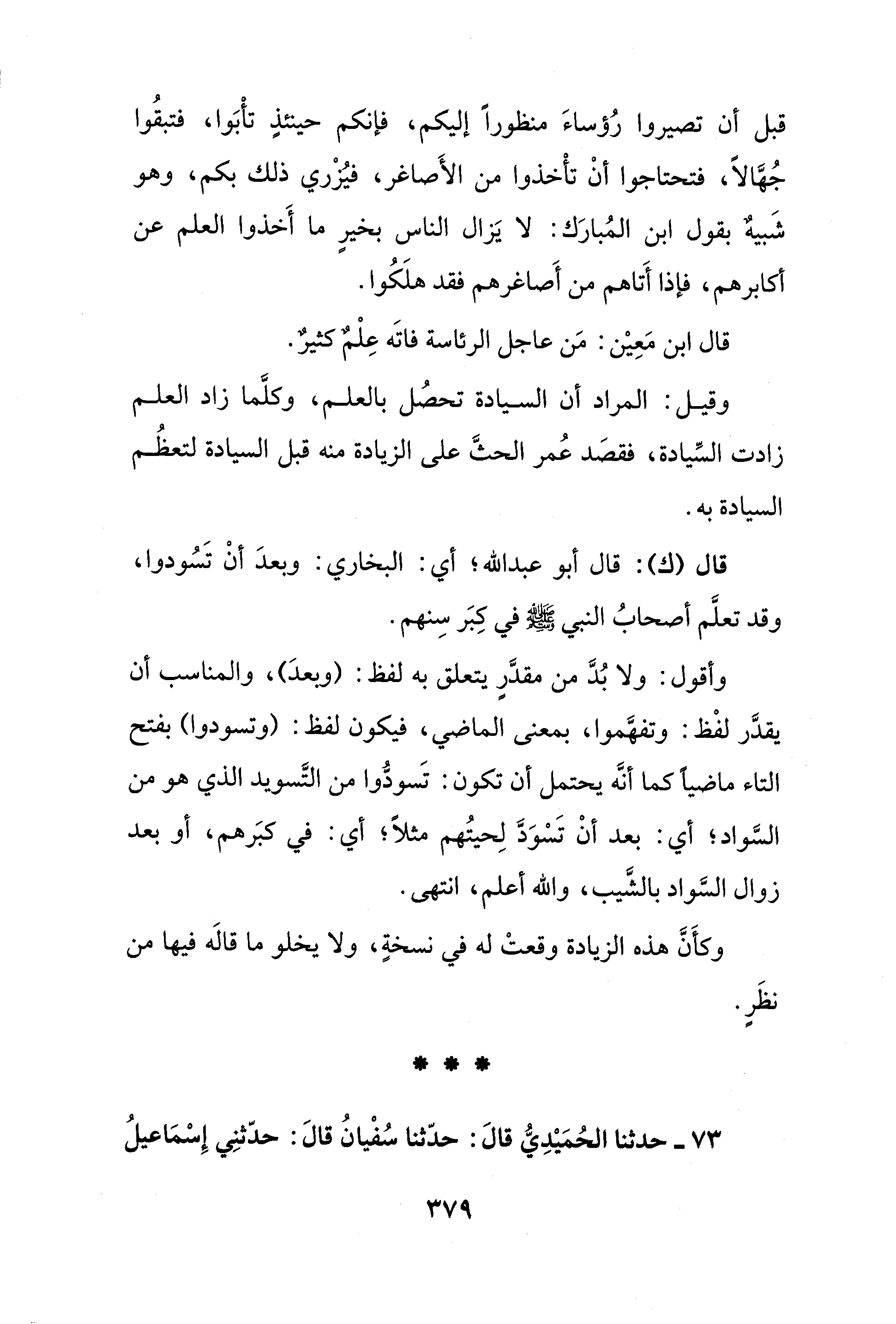قبل أن تصيروا رُؤساءَ منظورًا إليكم، فإنكم حينئذٍ تأْبَوا، فتبقُوا جُهَّالًا، فتحتاجوا أنْ تأْخذوا من الأَصاغر، فيُزْري ذلك بكم، وهو شَبيهٌ بقول ابن المُبارَك: لا يَزال الناس بخيرٍ ما أَخذوا العلم عن أكابرهم، فإذا أَتاهم من أَصاغرهم فقد هلَكُوا.