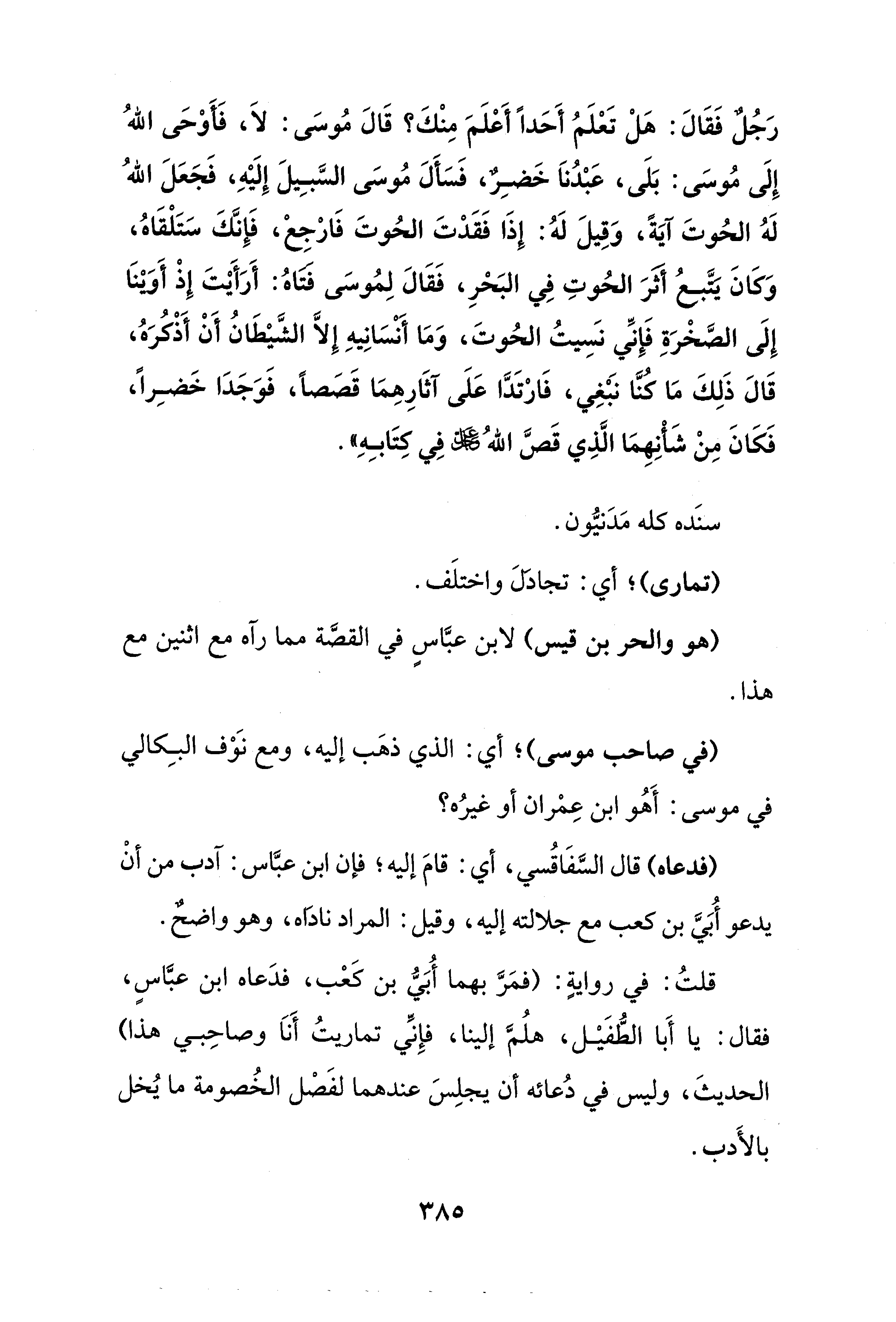 قلتُ: في روايةٍ: (فمَرَّ بهما أُبَيُّ بن كَعْب، فدَعاه ابن عبَّاسٍ، فقال: يا أَبا الطُّفَيْل، هلُمَّ إلينا، فإِنِّي تماريتُ أَناَ وصاحِبي هذا) الحديثَ، وليس في دُعائه أن يجلِسَ عندهما لفَضل الخُصومة ما يُخل بالأَدب.
