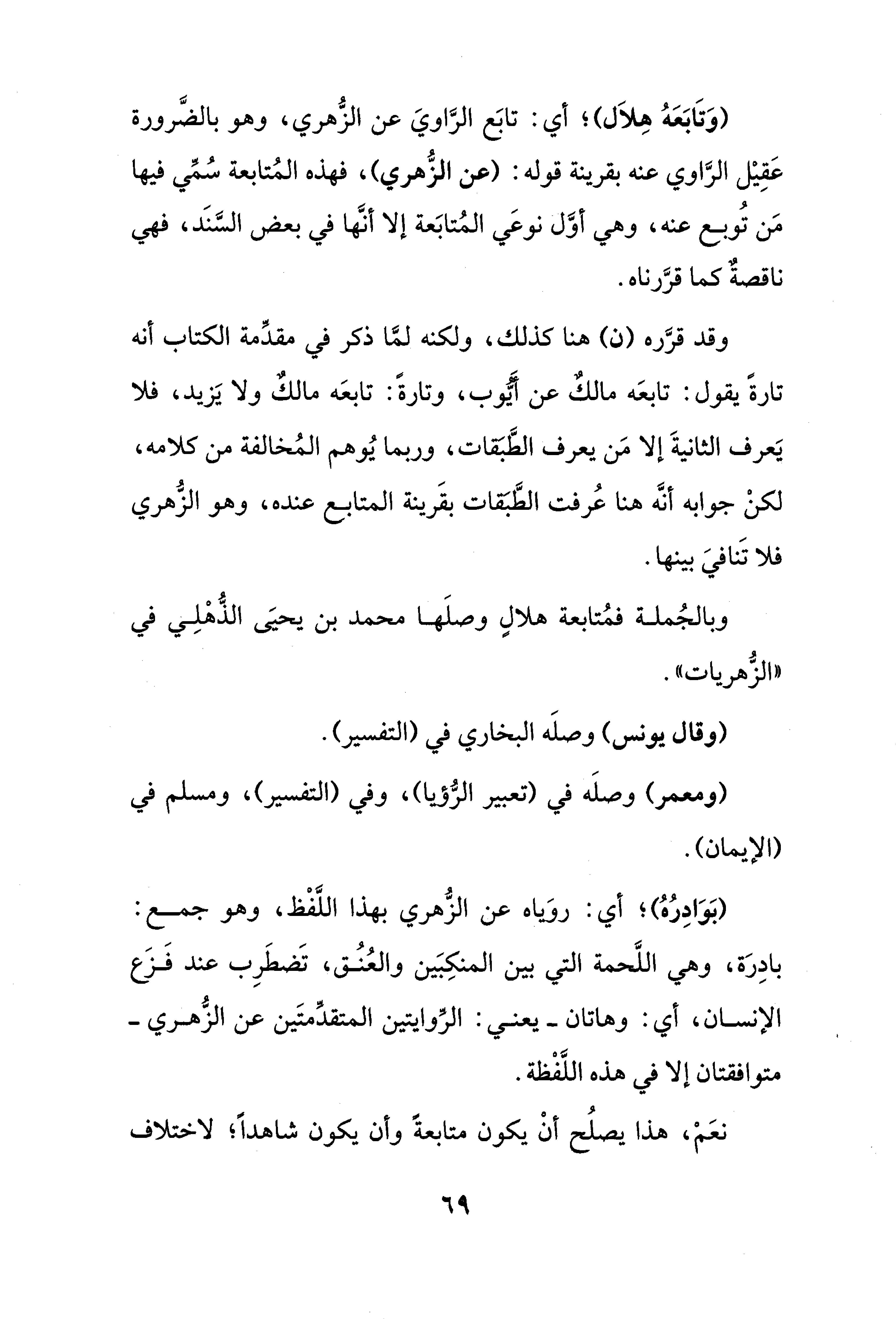وقد قرَّره (ن) هنا كذلك، ولكنه لمَّا ذكر في مقدِّمة الكتاب أنه تارةً يقول: تابعَه مالكٌ عن أَيُّوب، وتارةً: تابعَه مالك ولا يَزيد، فلا يَعرف الثّانيةَ إلا مَنْ يعرف الطَّبَقات، وربما يُوهم المُخالفة من كلامه، لكنْ جوابه أنَّه هنا عُرفت الطَّبَقات بقَرينة المتابع عنده، وهو الزُّهري فلا تَنافيَ بينها.