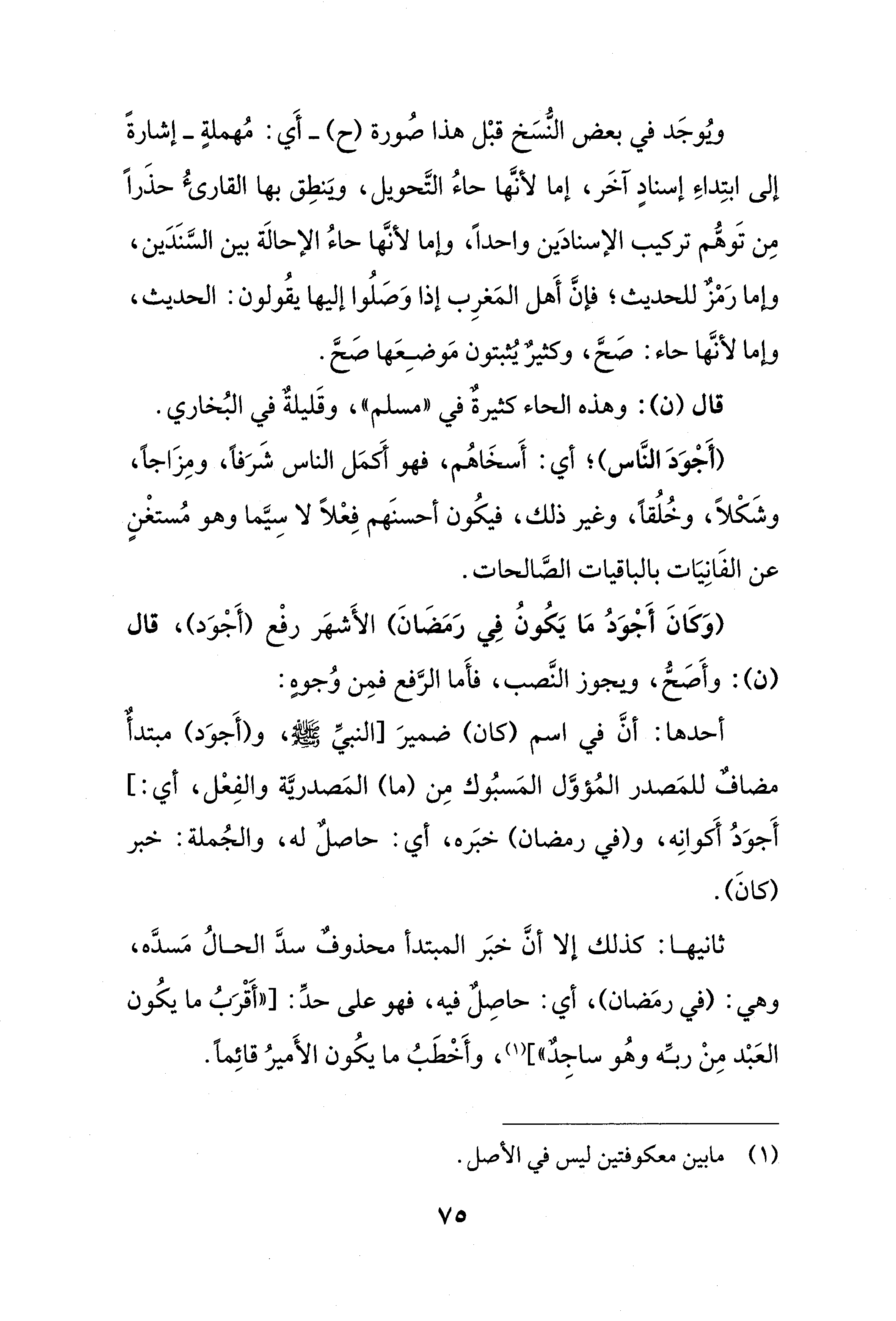 أحدها: أنَّ في اسم (كان) ضميرَ [النبيِّ - صلى الله عليه وسلم -، و (أَجوَد) مبتدأٌ مضافٌ للمَصدر المُؤوَّل المَسبُوك مِن (ما) المَصدريَّة والفِعْل، أي:] أَجوَدُ أكوانِه، و (في رمضان) خبَره، أي: حاصلٌ له، والجُملة: خبر (كانَ).