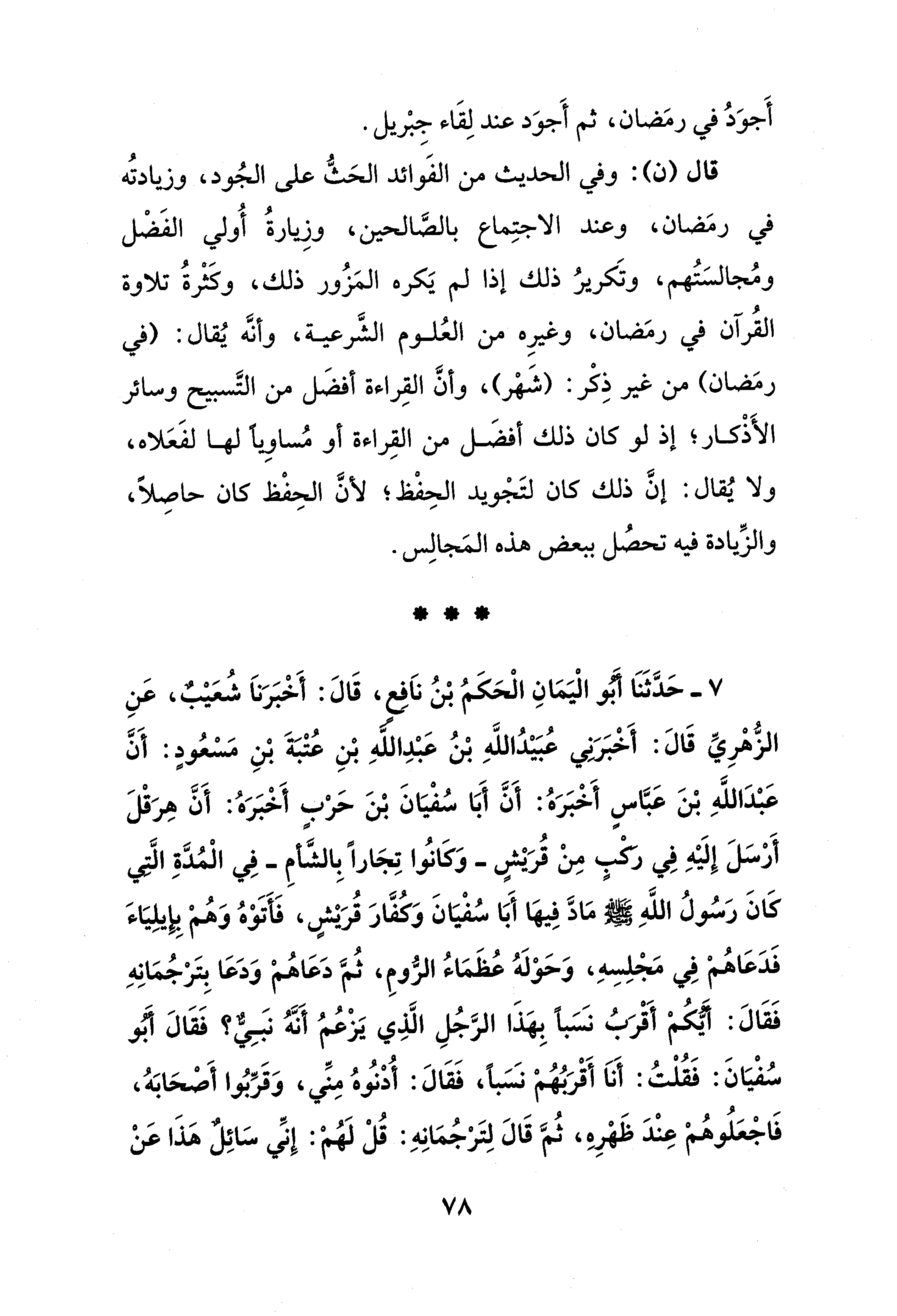 قال (ن): وفي الحديث من الفَوائد الحَثُّ على الجُود، وزيادتُه في رمَضان، وعند الاجتِماع بالصَّالحين، وزِيارةُ أُولي الفَضْل ومُجالسَتُهم، وتَكريرُ ذلك إذا لم يَكره المَزُور ذلك، وكَثْرةُ تلاوة القُرآن في رمَضان، وغيرِه من العُلوم الشَّرعية، وأنَّه يُقال: (في رمَضان) من غير ذِكْر: (شَهْر)، وأنَّ القِراءة أفضَل من التَّسبيح وسائر الأَذْكار؛ إذ لو كان ذلك أفضَل من القِراءة أو مُساوِيًا لها لفَعَلاه، ولا يُقال: إن ذلك كان لتَجْويد الحِفْظ؛ لأنَّ الحِفْظ كان حاصِلًا، والزِّيادة فيه تحصُل ببعض هذه المَجالِس.