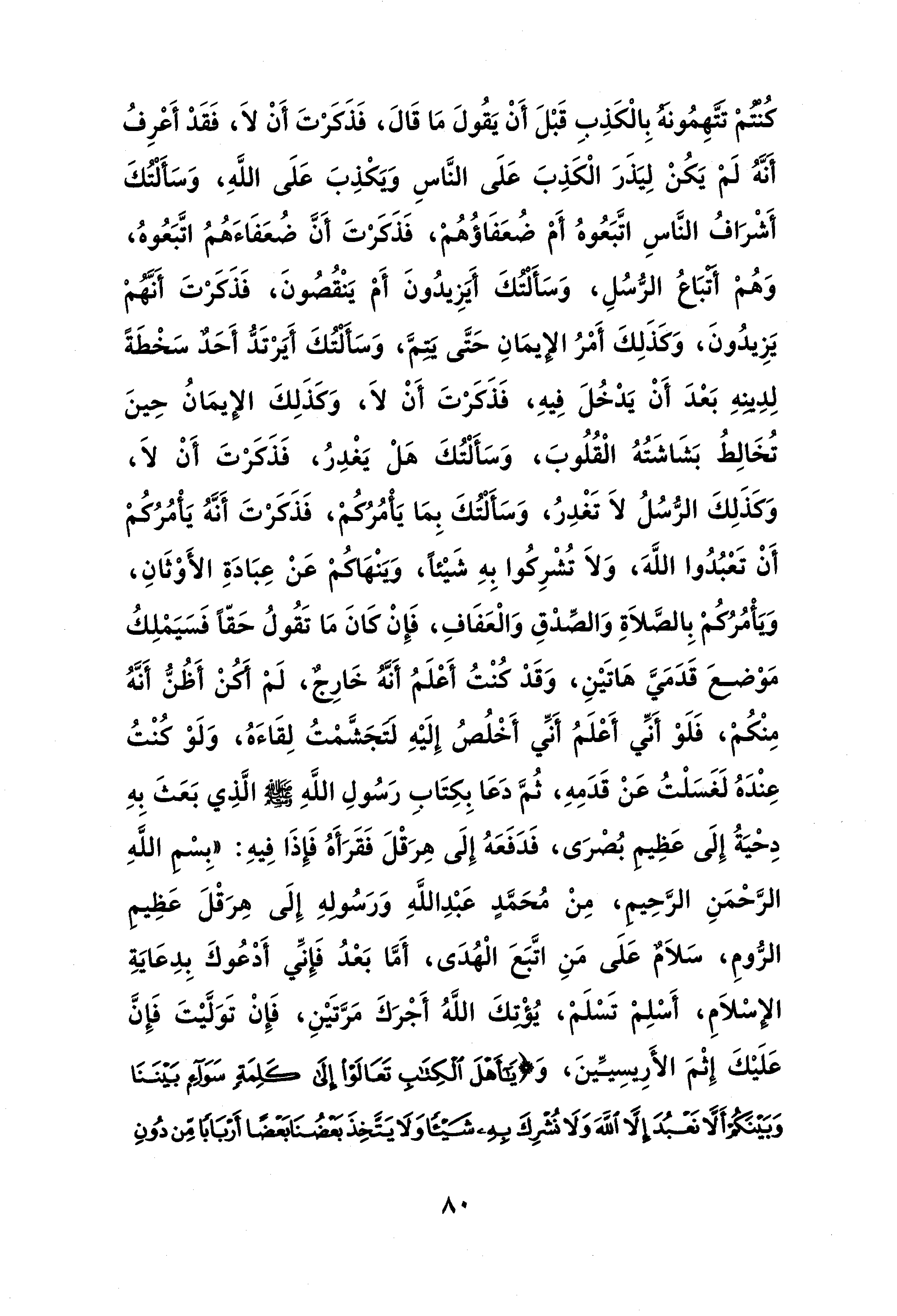 كُنْتُمْ تَتَّهِمُونهُ بِالْكَذِبِ قَبْلَ أَنْ يَقُولَ مَا قَالَ، فَذَكَرْتَ أَنْ لَا، فَقَدْ أَعْرِفُ أَنَّهُ لَمْ يَكُنْ لِيَذَرَ الْكَذِبَ عَلَى النَّاسِ وَيَكْذِبَ عَلَى اللهِ، وَسَأَلْتُكَ أَشْرَافُ النَّاسِ اتَّبَعُوهُ أَمْ ضُعَفَاؤُهُمْ، فَذَكَرْتَ أَنَّ ضُعَفَاءَهُمُ اتَّبَعُوهُ، وَهُمْ أَتْبَاعُ الرُّسُلِ، وَسَأَلتُكَ أَيَزِيدُونَ أَمْ يَنْقُصُونَ، فَذَكَرْتَ أَنَّهُمْ يَزِيدُونَ، وَكَذَلِكَ أَمْرُ الإيمَانِ حَتَّى يَتِمَّ، وَسَأَلتُكَ أَيَرْتَدُّ أَحَدٌ سَخْطَةً لِدِينهِ بَعْدَ أَنْ يَدْخُلَ فِيهِ، فَذَكَرْتَ أَنْ لَا، وَكَذَلِكَ الإيمَانُ حِينَ تُخَالِطُ بَشَاشَتُهُ الْقُلُوبَ، وَسَأَلتُكَ هَلْ يَغْدِرُ، فَذَكَرْتَ أَنْ لَا، وَكَذَلِكَ الرُّسُلُ لَا تَغْدِرُ، وَسَأَلتُكَ بِمَا يَأْمُرُكُمْ، فَذَكَرْتَ أَنَّهُ يَأْمُرُكُمْ أَنْ تَعْبُدُوا اللهَ، وَلَا تُشْرِكُوا بِهِ شَيْئًا، وَيَنْهَاكُمْ عَنْ عِبَادَةِ الأَوْثَانِ، وَيَأْمُرُكُمْ بِالصَّلَاةِ وَالصِّدْقِ وَالْعَفَافِ، فَإِنْ كَانَ مَا تَقُولُ حَقًّا فَسَيَمْلِكُ مَوْضعَ قَدَمَيَّ هَاتَيْنِ، وَقَدْ كُنْتُ أَعْلَمُ أَنَّهُ خَارِجٌ، لَمْ كُنْ أَظُنُّ أَنَّهُ مِنْكُمْ، فَلَوْ أَنِّي أَعْلَمُ أَنِّي أَخْلُصُ إِلَيْهِ لَتَجَشَّمْتُ لِقَاءَهُ، وَلَوْ كُنْتُ عِنْدَهُ لَغَسَلْتُ عَنْ قَدَمِهِ، ثُمَّ دَعَا بِكِتَابِ رَسُولِ اللهِ - صلى الله عليه وسلم - الَّذِي بَعَثَ بِهِ دِحْيَةُ إِلَى عَظِيمِ بُصْرَى، فَدَفَعَهُ إِلَى هِرَقلَ فَقَرَأَهُ فَإِذَا فِيهِ: "بِسْمِ اللَّهِ الرَّحْمَنِ الرَّحِيمِ، مِنْ مُحَمَّدٍ عَبْدِ اللهِ وَرَسُولِهِ إِلَى هِرَقْلَ عَظِيمِ الرُّومِ، سَلَامٌ عَلَى مَنِ اتَّبَعَ الْهُدَى، أَمَّا بَعْدُ فَإِنِّي أَدْعُوكَ بِدِعَايَةِ الإسْلَامِ، أَسْلِمْ تَسْلَمْ، يُؤْتكَ اللهُ أَجْرَكَ مَرَّتَيْنِ، فَإِنْ تَوَلَّيْتَ فَإِنَّ عَلَيْكَ إِثْمَ الأَرِيسِيِّينَ، وَ {يَاأَهْلَ الْكِتَابِ تَعَالَوْا إِلَى كَلِمَةٍ سَوَاءٍ بَيْنَنَا وَبَيْنَكُمْ أَلَّا نَعْبُدَ إلا اللَّهَ وَلَا نُشْرِكَ بِهِ شَيْئًا وَلَا يَتَّخِذَ بَعْضُنَا بَعْضًا أَرْبَابًا مِنْ دُونِ