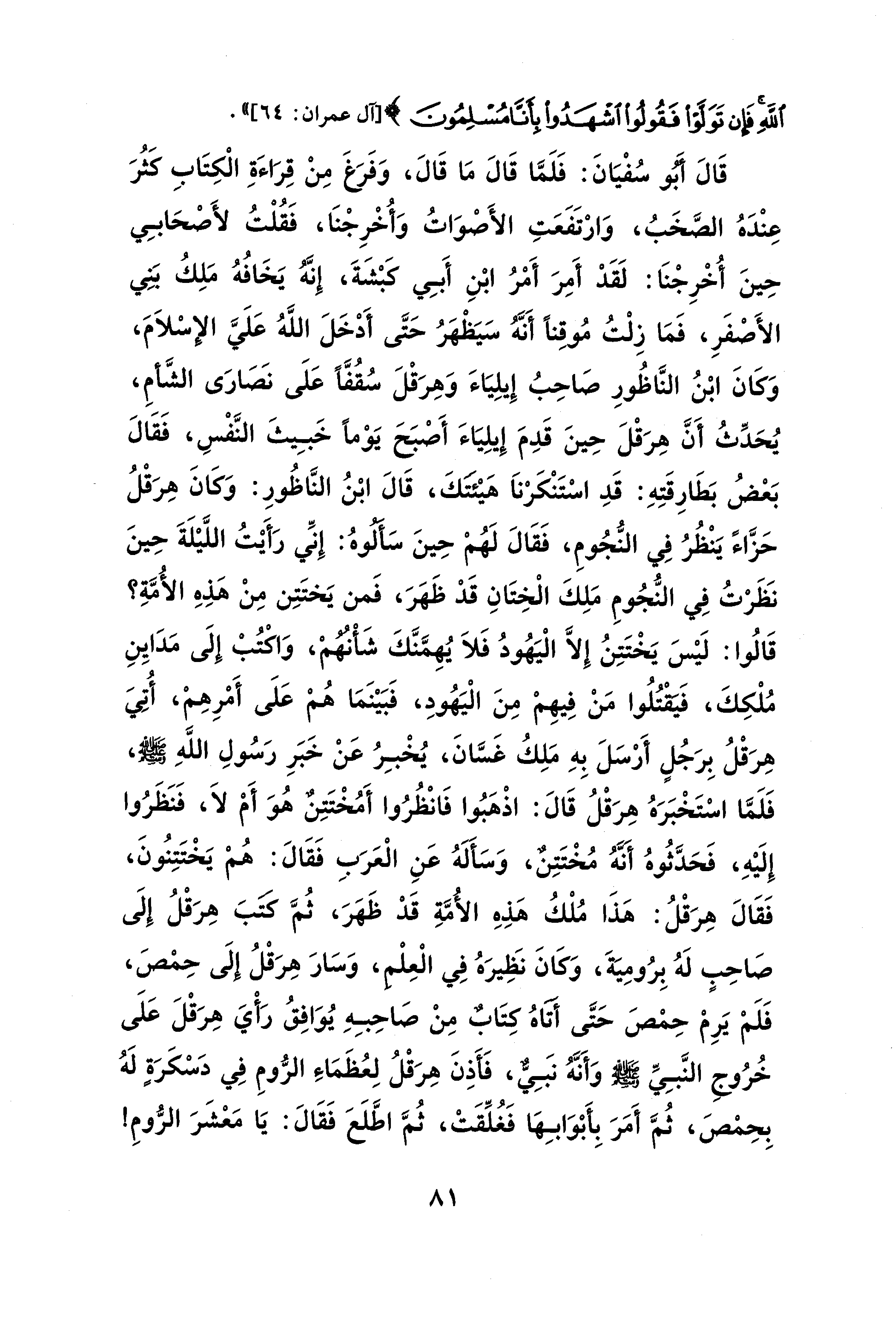 قَالَ أَبُو سُفْيَانَ: فَلَمَّا قَالَ مَا قَالَ، وَفَرَغَ مِنْ قِرَاءَةِ الْكِتَابِ كَثُرَ عِنْدَهُ الصَّخَبُ، وَارْتَفَعَتِ الأَصْوَاتُ وَأُخْرِجْنَا، فَقُلْتُ لأَصْحَابِي حِينَ أُخْرِجْنَا: لَقَدْ أَمِرَ أَمْرُ ابْنِ أَبِي كَبْشَةَ، إنَّهُ يَخَافُهُ مَلِكُ بَنِي الأَصْفَرِ، فَمَا زِلْتُ مُوقِنًا أَنَّهُ سَيَظْهَرُ حَتَّى أَدْخَلَ اللهُ عَلَيَّ الإسْلَامَ، وَكَانَ ابْنُ النَّاظُورِ صَاحِبُ إِيلِيَاءَ وَهِرَقْلَ سُقُفًّا عَلَى نَصَارَى الشَّأمِ، يُحَدِّثُ أَنَّ هِرَقْلَ حِينَ قَدِمَ إِيلِيَاءَ أَصْبَحَ يَوْمًا خَبِيثَ النَّفْسِ، فَقَالَ بَعْضُ بَطَارِقَتِهِ: قَدِ اسْتَنْكَرْنَا هَيْئَتَكَ، قَالَ ابْنُ النَّاظُورِ: وَكَانَ هِرَقْلُ حَزَّاءً يَنْظُرُ فِي النُّجُومِ، فَقَالَ لَهُمْ حِينَ سَأَلُوهُ: إِنِّي رَأَيْتُ اللَّيْلَةَ حِينَ نَظَرْتُ فِي النُّجُومِ مَلِكَ الْخِتَانِ قَدْ ظَهَرَ، فَمن يَختَتِن مِنْ هَذِهِ الأُمَّةِ؟ قَالُوا: لَيْسَ يَخْتَتِنُ إلا الْيَهُودُ فَلَا يُهِمَّنَّكَ شَأْنهمْ، وَاكْتُبْ إِلَى مَدَايِنِ مُلْكِكَ، فَيَقْتُلُوا مَنْ فِيهِمْ مِنَ الْيَهُودِ، فَبَيْنَمَا هُمْ عَلَى أَمْرِهِمْ، أُتِيَ هِرَقْلُ بِرَجُلٍ أَرْسَلَ بِهِ مَلِكُ غَسَّانَ، يُخْبِرُ عَنْ خَبَرِ رَسُولِ اللهِ - صلى الله عليه وسلم -، فَلَمَّا اسْتَخْبَرَهُ هِرَقْلُ قَالَ: اذْهَبُوا فَانْظُرُوا أَمُخْتَتِنٌ هُوَ أَمْ لَا، فَنَظَرُوا إِلَيْهِ، فَحَدَّثُوهُ أَنَّهُ مُخْتَتِنٌ، وَسَأَلَهُ عَنِ الْعَرَبِ فَقَالَ: هُمْ يَخْتَتِنُونَ، فَقَالَ هِرَقْلُ: هَذَا مُلْكُ هَذِهِ الأُمَّةِ قَدْ ظَهَرَ، ثُمَّ كتَبَ هِرَقْلُ إِلَى صَاحِبٍ لَهُ بِرُومِيَةَ، وَكَانَ نَظِيرَهُ فِي الْعِلْمِ، وَسَارَ هِرَقْلُ إِلَى حِمْصَ، فَلَمْ يَرِمْ حِمْصَ حَتَّى أتاهُ كتَابٌ مِنْ صَاحِبِهِ يُوَافِقُ رَأْيَ هِرَقْلَ عَلَى خُرُوجِ النَّبِيِّ - صلى الله عليه وسلم - وَأَنَّهُ نبَيٌّ، فَأَذِنَ هِرَقْلُ لِعُظَمَاءَ الرُّومِ فِي دَسْكَرَةٍ لَهُ بِحِمْصَ، ثُمَّ أَمَرَ بِأَبْوَابِهَا فَغُلِّقَتْ، ثُمَّ اطَّلَعَ فَقَالَ: يَا مَعْشَرَ الرُّومِ!