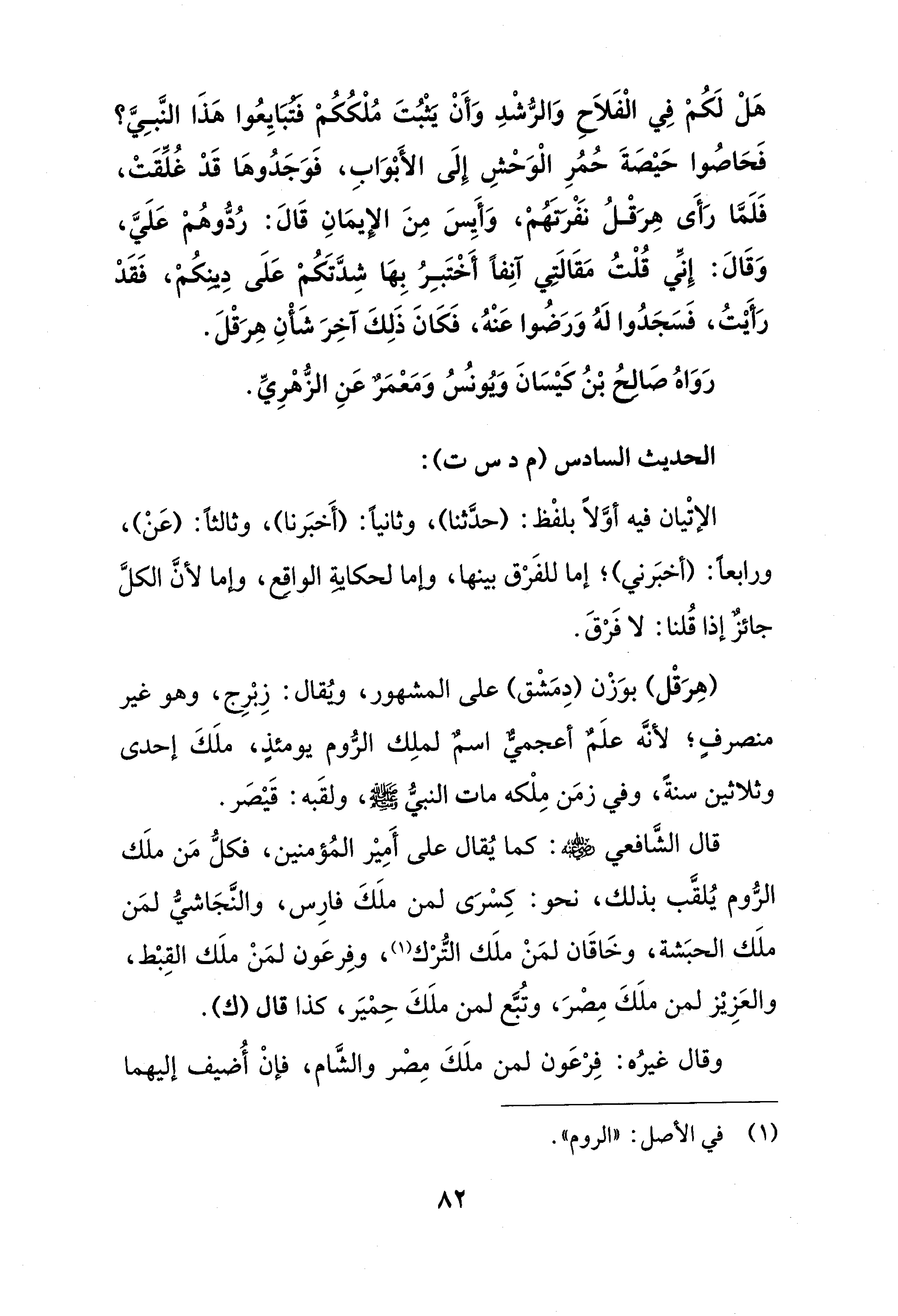 هَلْ لَكُمْ فِي الْفَلَاحِ وَالرُّشْدِ وَأَنْ يَثْبُتَ مُلْكُكُم فتبَايِعُوا هَذَا النَّبِيَّ؟ فَحَاصُوا حَيْصَةَ حُمُرِ الْوَحْشِ إِلَى الأَبْوَابِ، فوَجَدُوهَا قَدْ غُلِّقَتْ، فَلَمَّا رَأَى هِرَقْلُ نَفْرَتَهُمْ، وَأَيِسَ مِنَ الإيمَانِ قَالَ: رُدُّوهُمْ عَلَيَّ، وَقَالَ: إِنِّي قُلْتُ مَقَالَتِي آنِفًا أَخْتَبِرُ بِهَا شِدَّتَكُمْ عَلَى دِينِكُمْ، فَقَدْ رَأَيْتُ، فَسَجَدُوا لَهُ وَرَضُوا عَنْهُ، فَكَانَ ذَلِكَ آخِرَ شَأْنِ هِرَقْلَ.