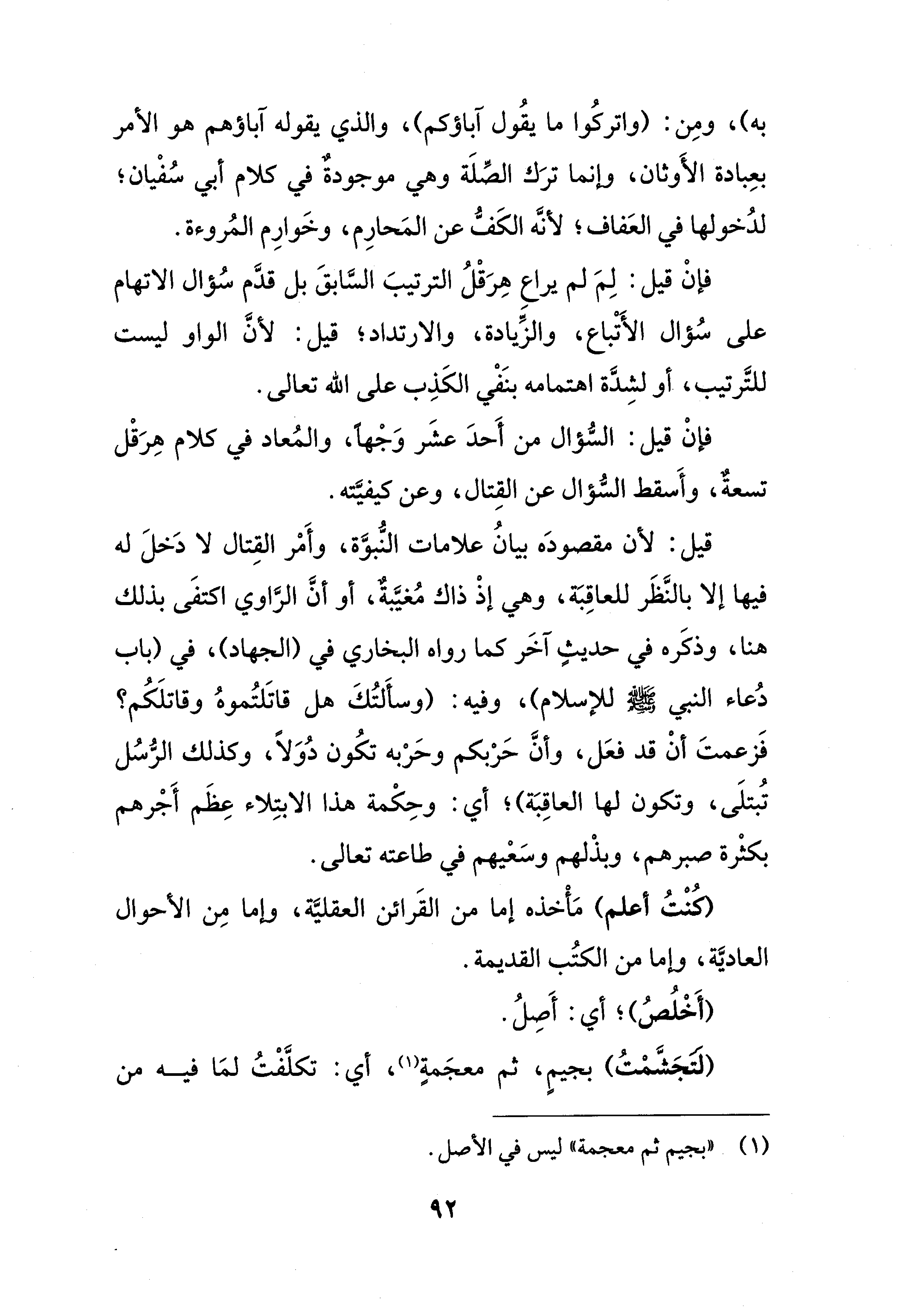 به)، ومِن: (واتركُوا ما يقُول آباؤكم)، والذي يقوله آباؤهم هو الأمر بعِبادة الأَوثان، وإنما ترَك الصِّلَة وهي موجودةٌ في كلام أبي سُفْيان؛ لدُخولها في العَفاف؛ لأنَّه الكَفُّ عن المَحارِم، وخَوارِم المُروءة.
