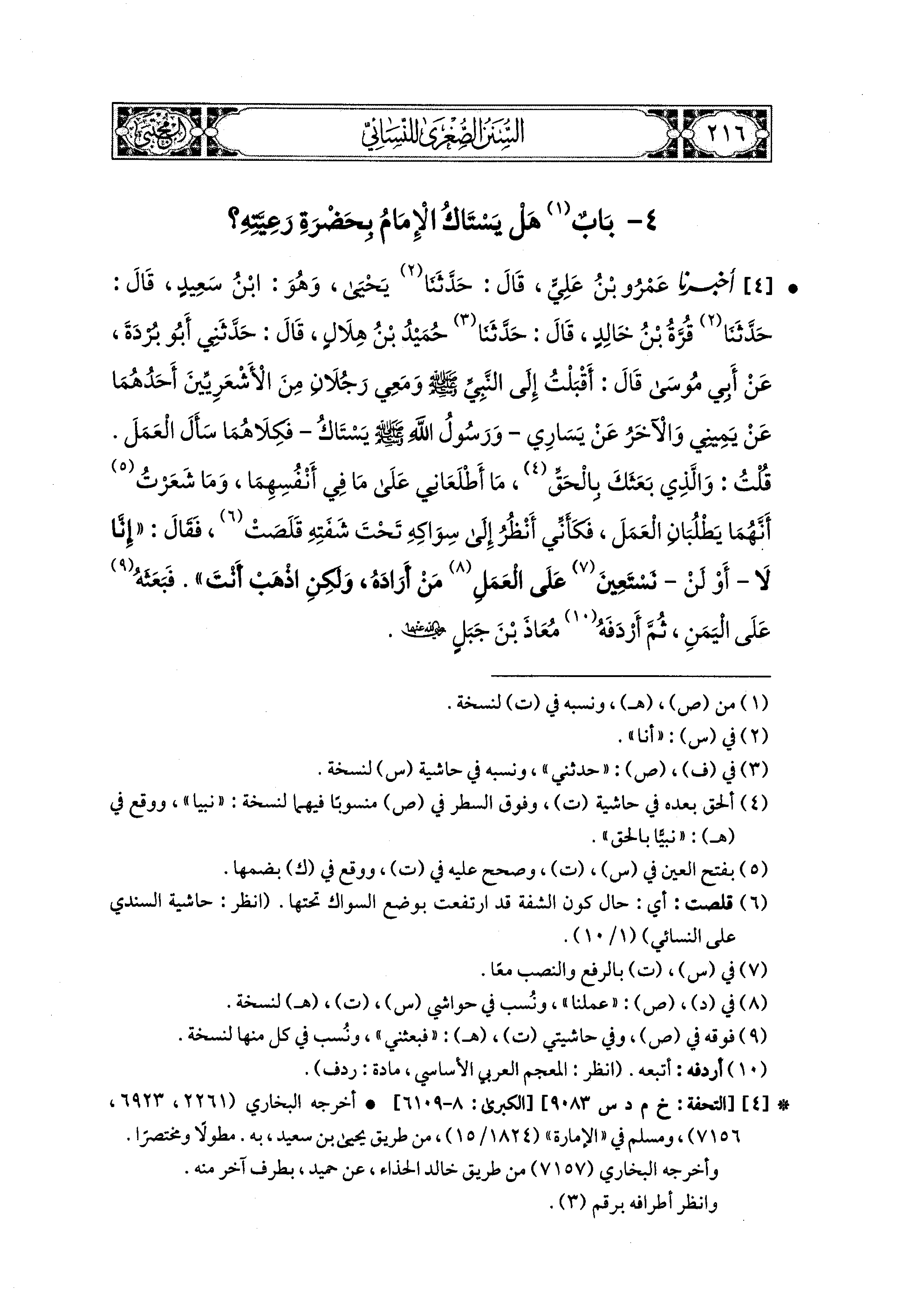 4- أَخبَرنا عَمْرُو بنُ عَلِيٍّ، حَدَّثَنَا يَحْيَى، وَهُوَ ابنُ سَعِيدٍ، قال: حَدَّثنا قُرَّةُ بنُ خَالِدٍ، قال: حَدَّثنا حُمَيدُ بنُ هِلاَلٍ، قَالَ: حَدَّثني أَبُو بُرْدَةَ، عَن أَبي مُوسَى قَالَ: أَقْبَلْتُ إِلَى النَّبيِّ صَلى الله عَليهِ وسَلم وَمَعِي رَجُلاَنِ مِنَ الأَشْعَرِيِّينَ: أَحَدُهُمَا عَن يَمينِي، وَالآخَرُ عَن يَسَارِي، وَرَسُولُ اللهِ صَلى الله عَليهِ وسَلم يَسْتَاكُ فَكِلاَهُمَا سَأَلَ العَمَلَ، قُلْتُ: وَالَّذِي بَعَثَكَ بِالحَقِّ مَا أَطْلَعَانِي عَلَى مَا فِي أَنْفُسِهِمَا، وَمَا شَعَرْتُ أَنَّهُمَا يَطْلُبَانِ العَمَلَ، فَكَأَنِّي أَنْظُرُ إِلَى سِوَاكِهِ تَحْتَ شَفَتِهِ قَلَصَتْ، فَقَالَ: إِنَّا لاَ، أَوْ لنْ، نَسْتَعِينَ عَلَى العَمَلِ مَنْ أَرَادَهُ، وَلَكِنِ اذْهَبْ أَنْتَ، فَبَعَثَهُ عَلَى اليَمَنِ، ثُمَّ أَرْدَفَهُ مُعَاذُ بنُ جَبَلٍ رَضِيَ اللهُ عَنهُمَا